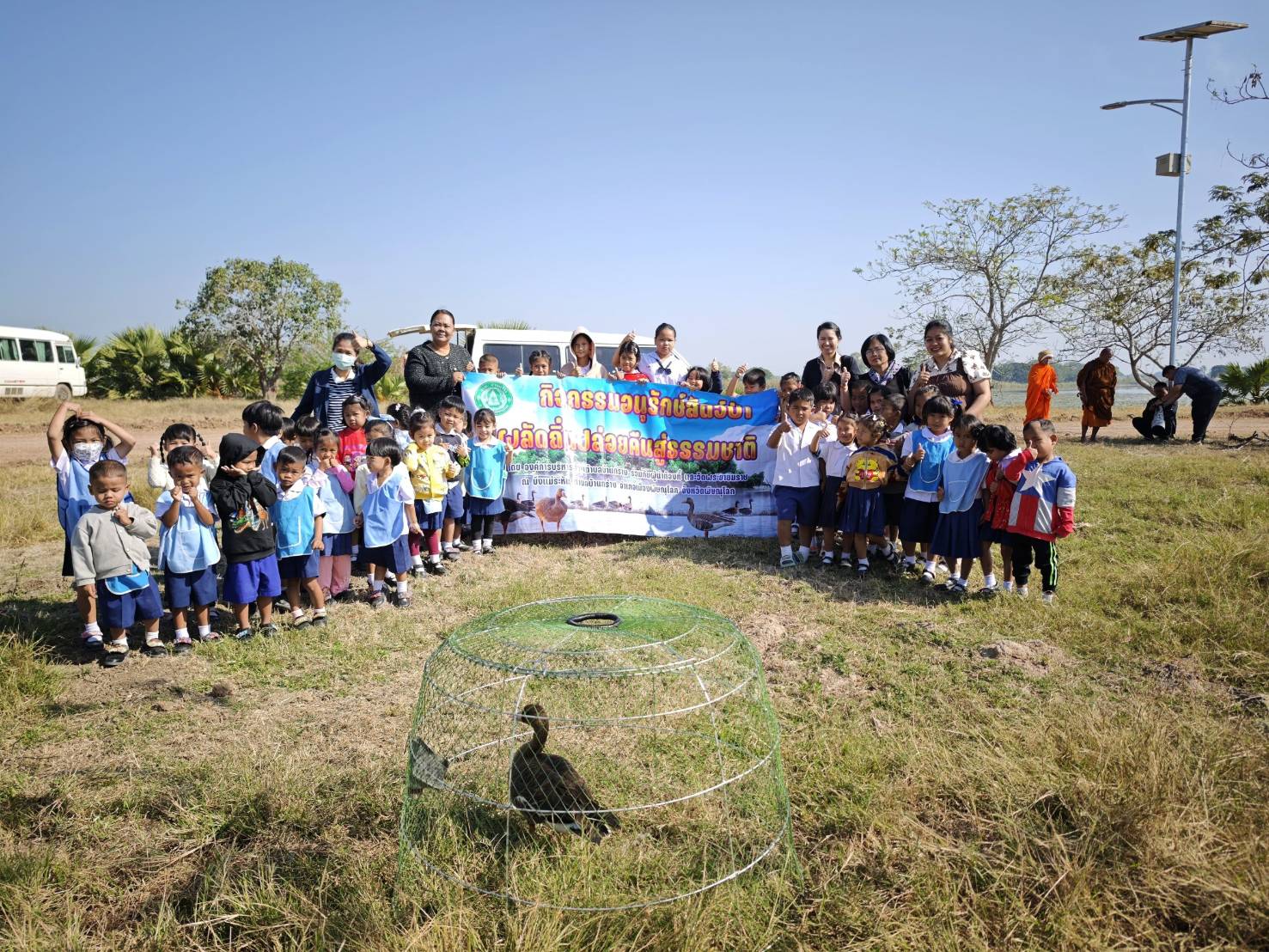 เบื้องต้นได้ประสานหน่วยงานที่เกี่ยวข้องให้ร่วมรักษาห่านให้หายดีก่อน โดยใช้เวลากว่า 1 สัปดาห์ โดยให้อาหารสัตว์ปีกทั่วไปคือข้าวเปลือก รำ เป็นต้น เมื่อห่านหน้าผากขาวใหญ่หายดี จึงได้เชิญผู้บริหาร อบต.บ้านกร่าง นำโดย ร้อยตำรวจเอกเอกธนัช เจริญสุข. นายก อบต.บ้านกร่าง พร้อมกับ เจ้าอาวาสวัดพญายมราช ที่นำห่านมารักษา และนักเรียนจากศูนย์พัฒนาเด็กเล็กแม่ระหัน ตำบลบ้านกร่าง เพื่อจัดกิจกรรมปล่อยห่านหน้าผากขาวใหญ่ ซึ่งเป็นกิจกรรมเล็กๆ แต่ก็สร้างความสุขให้กับเด็กๆ อย่างมาก เนื่องจากเป็นห่านหายากในประเทศไทย