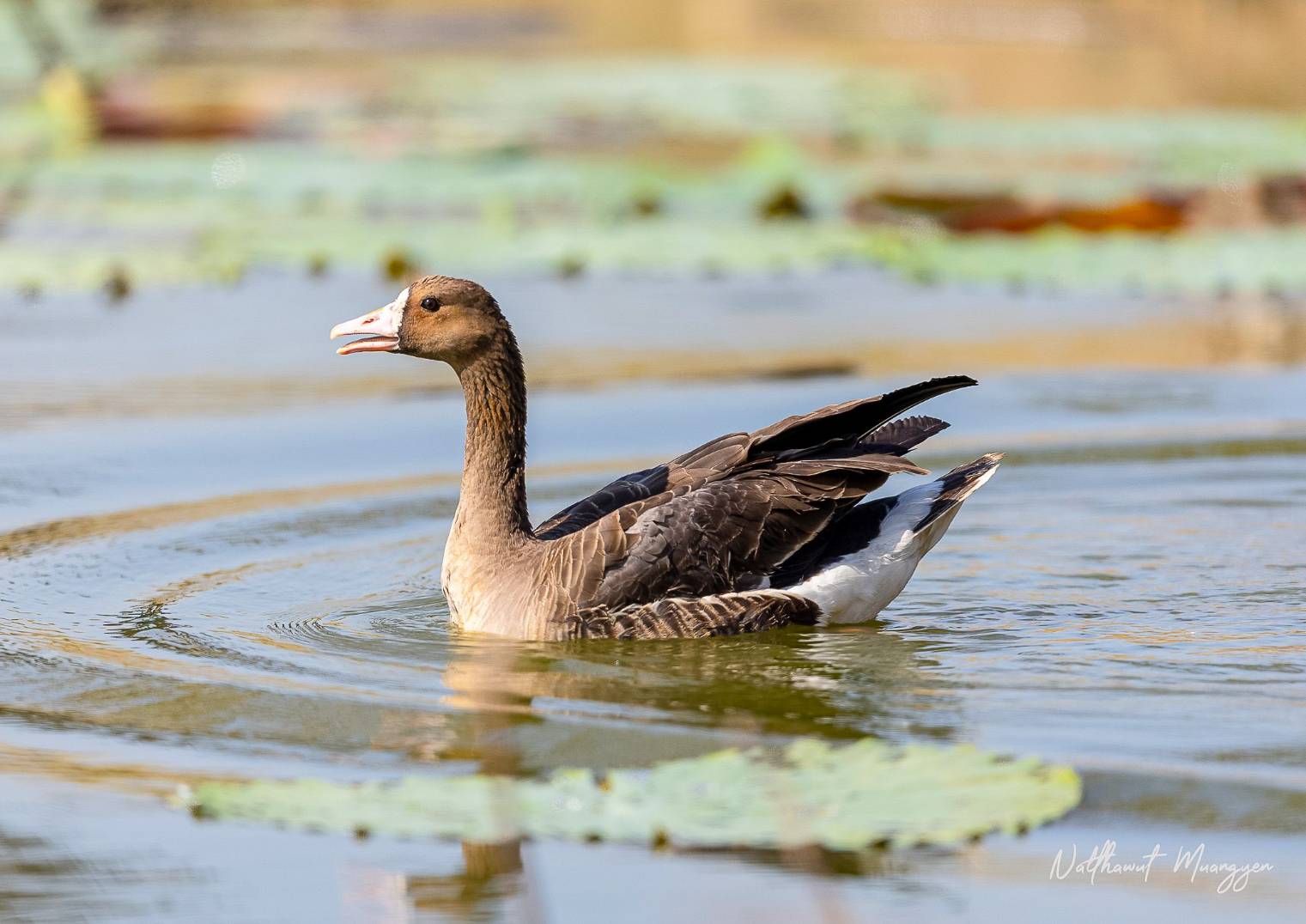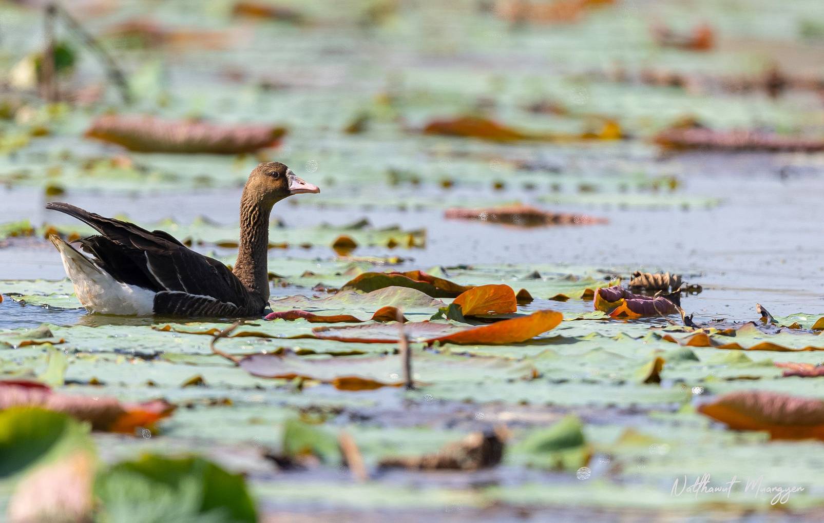 สำหรับห่านหน้าผากขาวใหญ่ [Greater White-fronted Goose] เป็นห่านขนาดกลาง มีความยาวลำตัว 64-81 ซม. มีช่วงปีกกว้าง 130-165 ซม. และน้ำหนักระหว่าง 1.93-3.31 กก. เมื่อโตเต็มวัยขาจะมีสีสันสดใส ขนปีกด้านบนมีสีเทาอมน้ำตาล สีปากจะแตกต่างกันไปตั้งแต่สีส้มไปจนถึงสีชมพู และตัวผู้มักมีขนาดใหญ่กว่าตัวเมีย โดยทั้งสองเพศมีลักษณะภายนอกคล้ายกัน คือมีขนสีเทาน้ำตาล โดยหน้าอกมีสีเทาอ่อนพร้อมแต้มจุดหรือแถบสีดำถึงน้ำตาลเข้ม นอกจากนี้ ทั้งตัวผู้และตัวเมียยังมีปากสีชมพู ขาและเท้าสีส้ม ห่านชนิดนี้ผสมพันธุ์ในพื้นที่ทุนดราและไทกา ในช่วงฤดูอพยพจะพบในทุ่งนา พื้นที่เกษตรกรรม และพื้นที่ชุ่มน้ำ มักพบเป็นฝูงหรือบางครั้งอาจอยู่ปะปนกับห่านชนิดอื่น พบการกระจายพันธุ์ทางทวีปอเมริกาเหนือและทวีปยุโรป โดยมีสถานภาพการอนุรักษ์ IUCN Red list คือ LC (Least Concern)