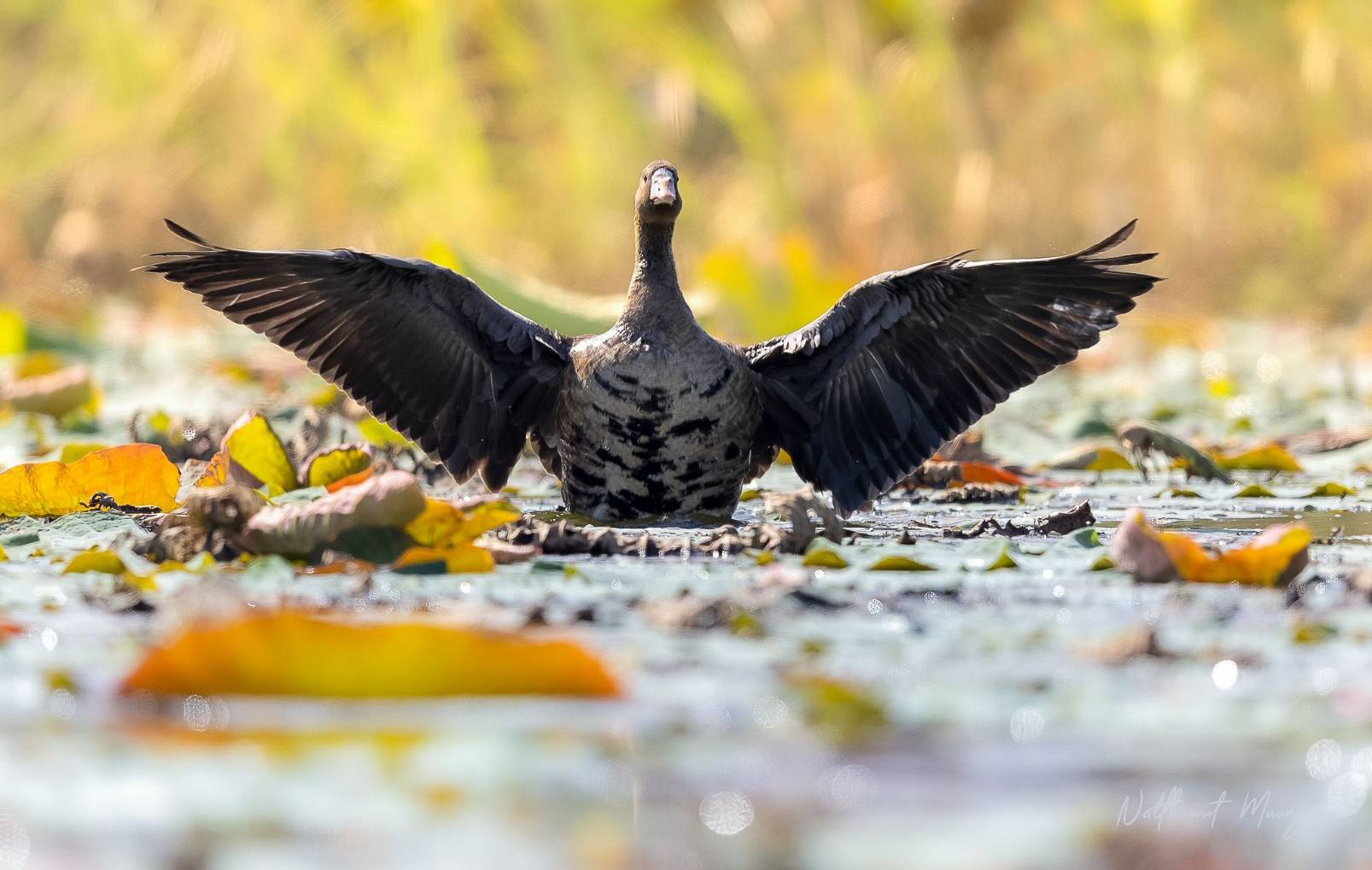 นายณัฐวุฒิ ม่วงเย็น นิติกรชำนาญการองค์การบริหารส่วนตำบลบ้านกร่าง เปิดเผยว่า เมื่อวันที่ 29-30 ธันวาคม 2568 มีชาวบ้านแจ้งว่าพบเป็ดแปลกๆตัวหนึ่งเข้ามาอยู่ในฝูงเป็ดของตัวเอง พอเห็นว่าไม่ใช่เป็ดทั่วไปจึงจับตัวไปมอบให้เจ้าอาวาสวัดพญายมราชดูแล เพราะมีอาการบาดเจ็บที่บริเวณเท้า มีรอยบาดแผลที่เกิดจากลวด เจ้าอาวาสจึงประสานมาที่ อบต.บ้านกร่าง เมื่อไปตรวจสอบ จึงทราบว่าเป็น "ห่านหน้าผากขาวใหญ่" สถานภาพเป็นนกอพยพหายาก