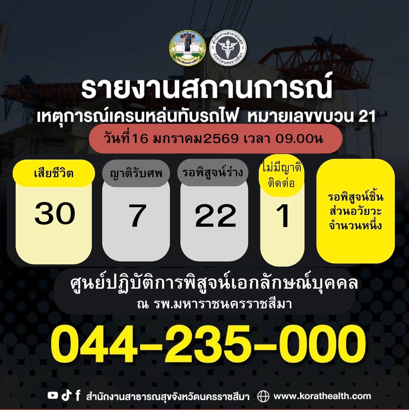 16 มกราคม 2569 - บ่ายวันนี้ ผู้สื่อข่าวรายงานความคืบหน้าเหตุเครนขนาดใหญ่ถล่มทับขบวนรถไฟที่ อ.สีคิ้ว จ.นครราชสีมา ล่าสุดสำนักงานสาธารณสุขจังหวัดนครราชสีมา ได้เปิดเผยยอดผู้เสียชีวิตจากเหตุการณ์อุบัติเหตุเครนยักษ์ถล่มทับขบวนรถไฟที่ อ.สีคิ้ว จ.นครราชสีมา โดยจากข้อมูลล่าสุด วันที่ 16 มกราคม 2569 มียอดผู้เสียชีวิตจากอุบัติเหตุครั้งนี้ จำนวน 30 ราย ในจำนวนนี้มีญาติรับศพกลับไปแล้ว 7 ราย อยู่ระหว่างรอพิสูจน์ร่าง 22 ราย และไม่มีญาติมาติดต่อ 1 ราย นอกจากนี้ยังมีชิ้นส่วนอวัยวะที่รอการพิสูจน์อีกจำนวนหนึ่ง