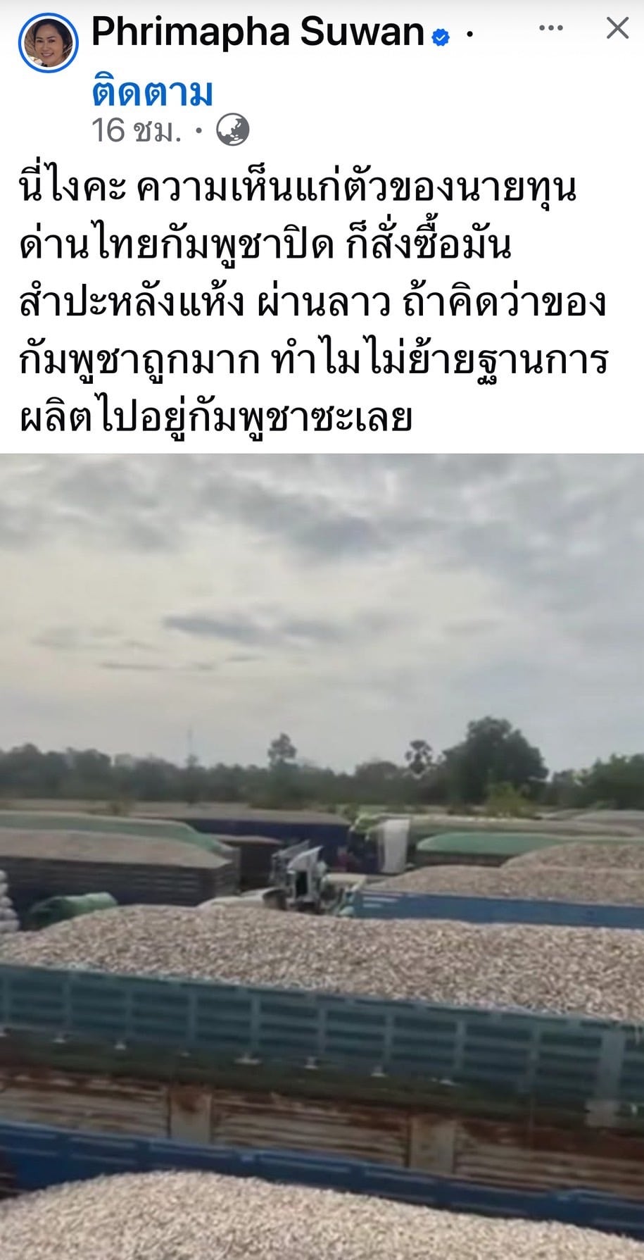 ขณะเดียวกัน เสียงสะท้อนในโซเชียลยังพุ่งเป้าไปที่กลุ่มนายทุนและเอกชนรายใหญ่เป็นผู้มีอิทธิพลบางแห่ง ขอให้เห็นแก่ประเทศชาติและเกษตรกรไทย อย่าฉวยโอกาสหาประโยชน์จากมันสำปะหลังราคาถูกจากต่างประเทศ พร้อมย้ำให้ตระหนักถึงความเสียสละของเจ้าหน้าที่และทหารที่ปฏิบัติหน้าที่ดูแลชายแดนด้วย อย่าเห็นแก่ประโยชน์ส่วนตัวบนความลำบากของเพื่อนร่วมชาติ