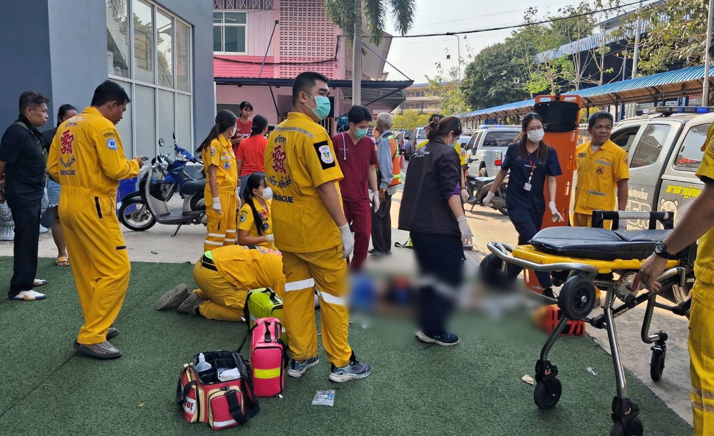 ในที่เกิดเหตุพบผู้บาดเจ็บเป็นนักเรียนหญิง อายุ 14 ปี อยู่ในชุดกีฬา เป็นนักกีฬาของโรงเรียน และเป็นนักกีฬาประจำตำบลนอนหมดสติ ปลุกไม่ตื่น มีรอยฟกช้ำตามร่างกาย มีอาการทางกระดูกที่บริเวณขาทั้งสองข้าง และมีบาดแผลฉีกขาดขนาดใหญ่ที่ขา เจ้าหน้าที่จึงทำการปฐมพยาบาลเบื้องต้น ก่อนผู้บาดเจ็บจะรู้สึกตัว เจ้าที่จึงรีบทำแผล และรีบนำส่งโรงพยาบาล