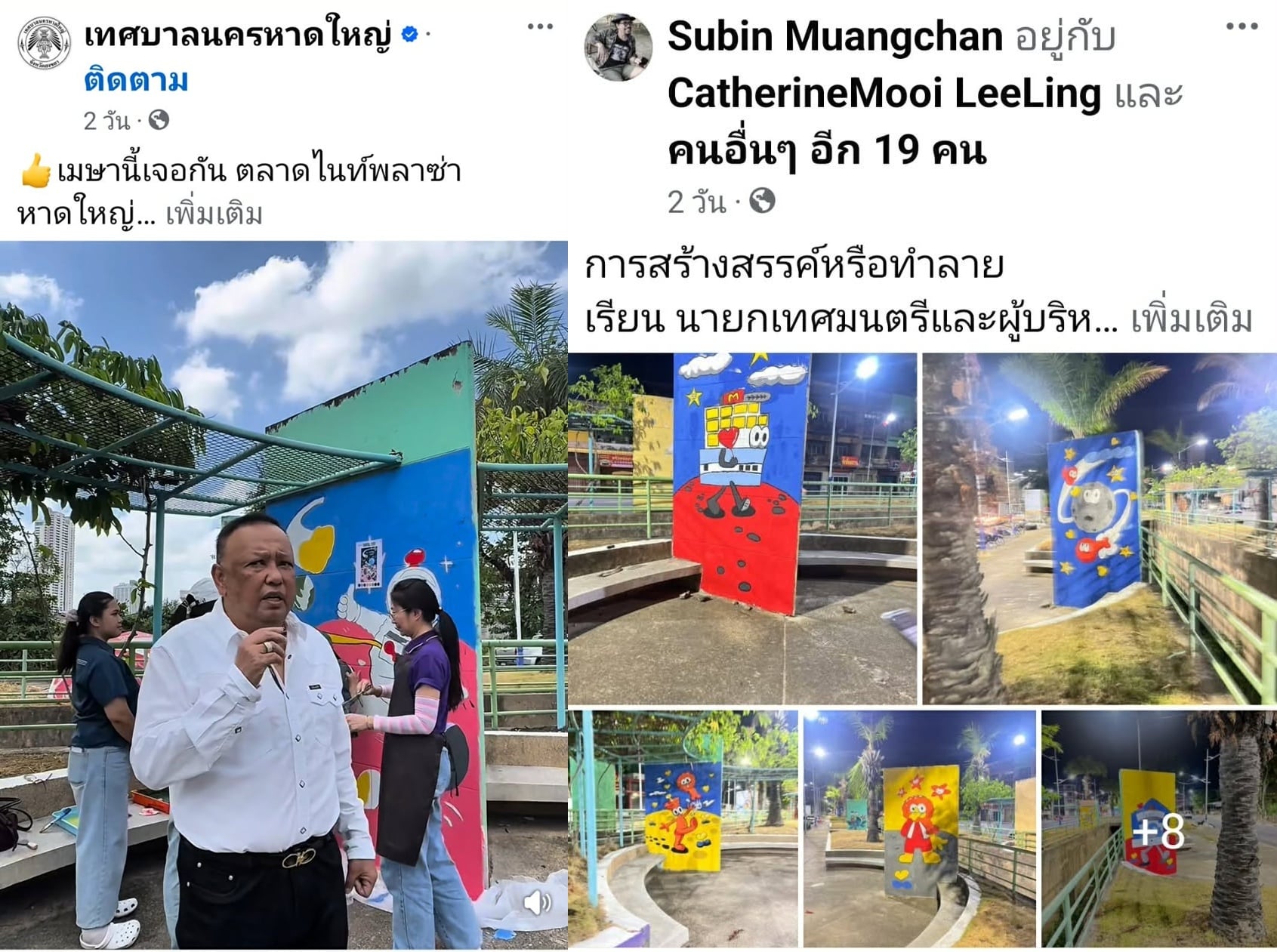 “นายกแป้น” สร้างเสียงวิจารณ์ขรมให้นครหาดใหญ่อีกระลอก หลังนำอาจารย์และนักศึกษาจากหลายมหา’ลัยลุยระบายสีวาดการ์ตูนบนป้ายคอนกรีตสวนหย่อมโนรา หวังโปรโมตตลาดไนท์พลาซ่าที่จะเปิดใหม่ แต่กลับไปวาดทับ “ภาพวาดผลงานศิลปินนานาชาติ” ที่มาช่วยฟื้นฟูเมืองหลังโควิด-19