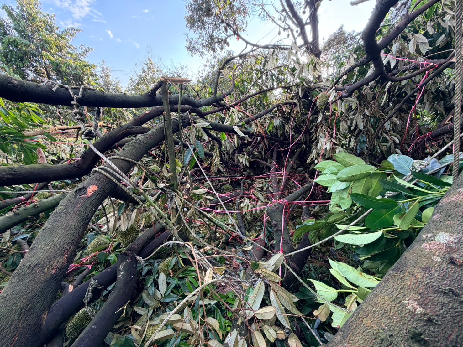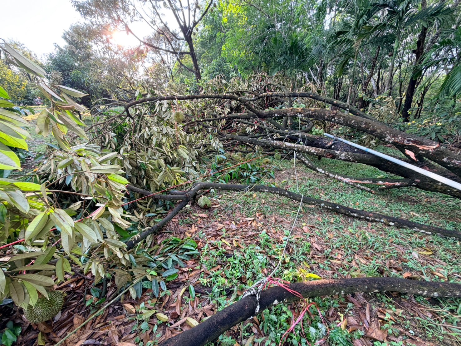 ผู้ใหญ่บ้านหมู่ 2 กล่าวต่อว่า พายุปีนี้แรงมาก มา 3 ลูกติดกัน ลมมาเป็นช่วงๆ จึงอยากฝากเตือนชาวสวนที่ยังไม่โดนพายุ ให้รีบเตรียมความพร้อมทั้งการค้ำต้นให้มั่นคง การโยงกิ่ง และการเต้าลูกทุเรียน เพื่อลดภาวะความเสี่ยงที่อาจจะเกิดขึ้นจากพายุลูกต่อไป