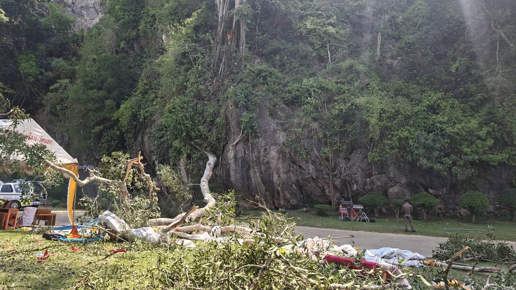เบื้องต้นเจ้าหน้าที่ตำรวจคาดว่า ต้นไม้บนหน้าผาหินซึ่งมีอายุนานหลายปี อาจมีสภาพไม่แข็งแรงหรือระบบรากยึดเกาะหินได้ไม่ดี มีความเสื่อมโทรมตามธรรมชาติ จึงหักโค่นลงมาในวัดจัดงานประจำปีดังกล่าวพอดี ซึ่งเจ้าหน้าที่ส่วนที่เกี่ยวข้องเข้าตรวจสอบหาสาเหตุที่แน่ชัด และดำเนินการตามขั้นตอนทางกฎหมายต่อไป.