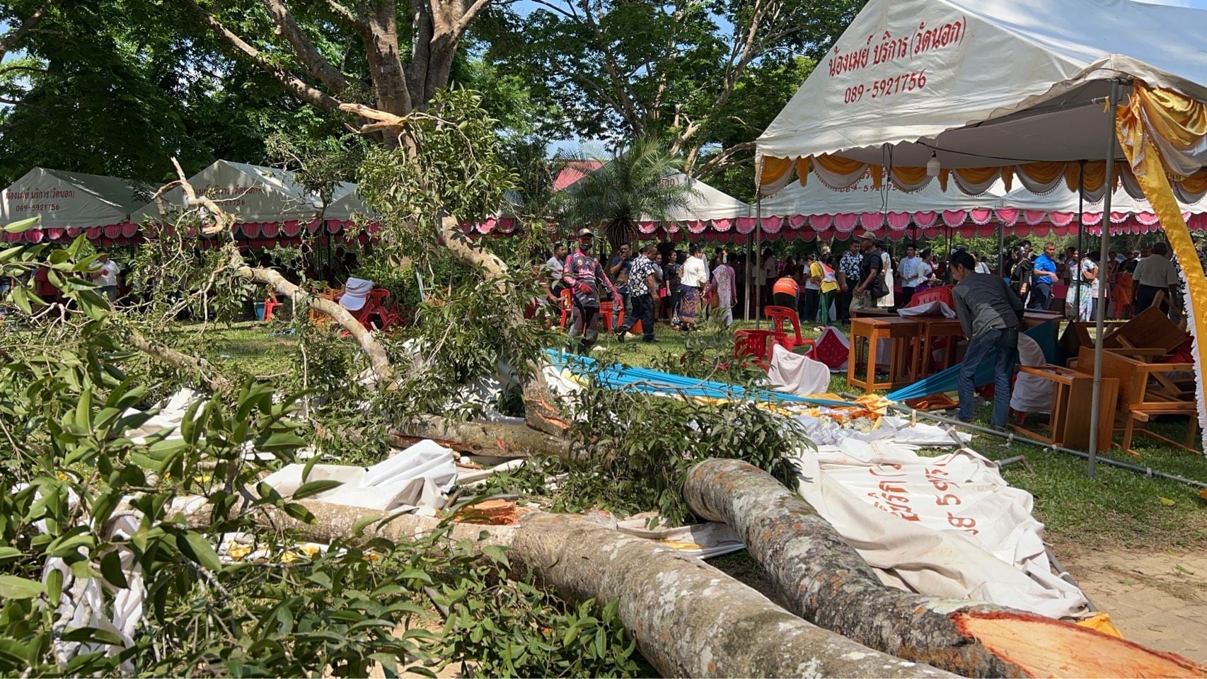 โดยก่อนเกิดเหตุกลุ่มผู้ประสบภัยกำลังนั่งและยืนพักผ่อนชมการแสดงอยู่ภายในเต็นท์พิธีและรอบบริเวณซึ่งเป็นจังหวะที่ต้นไม้ใหญ่หักโค่นลงมาพอดี ทำให้ไม่สามารถหลบหนีได้ทัน เจ้าหน้าที่กู้ภัยและชาวบ้านในพื้นที่ได้รีบช่วยกันนำตัวผู้บาดเจ็บส่งโรงพยาบาลหลังสวนอย่างเร่งด่วน