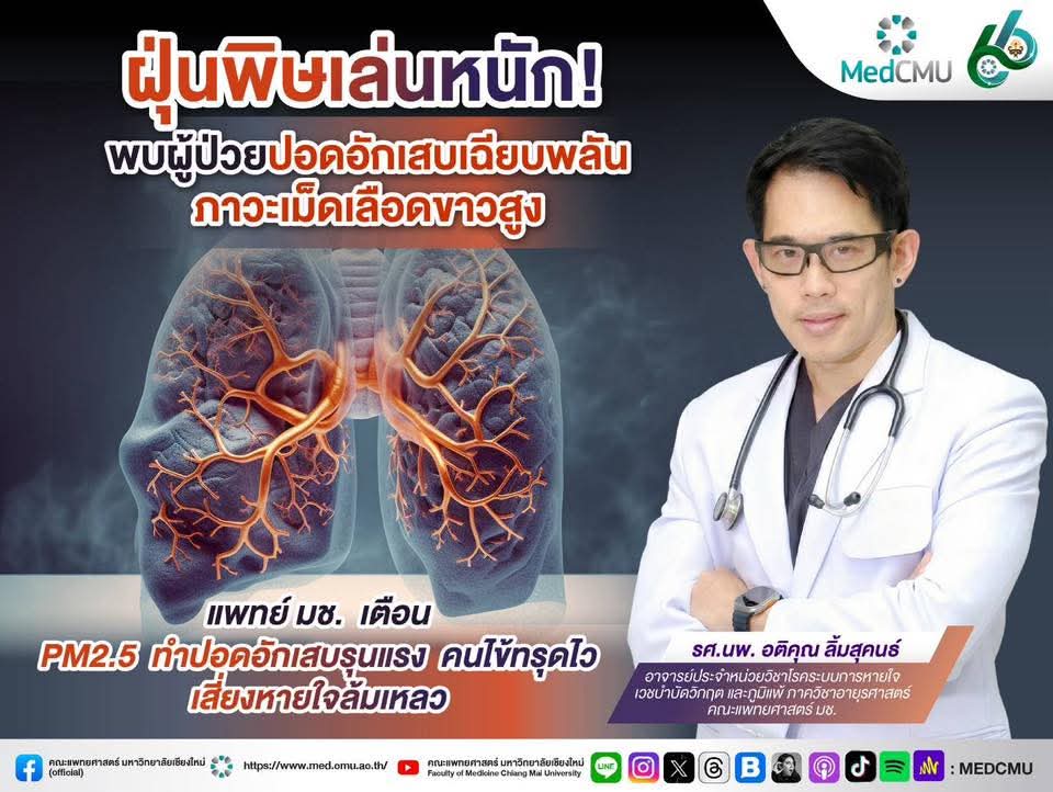 ฝุ่นพิษเล่นเหนือหนัก! พบผู้ป่วยปอดอักเสบเฉียบพลัน ภาวะเม็ดเลือดขาวสูง แพทย์ มช. เตือน PM2.5 ทำปอดอักเสบรุนแรง คนไข้ทรุดไว เสี่ยงหายใจล้มเหลว
