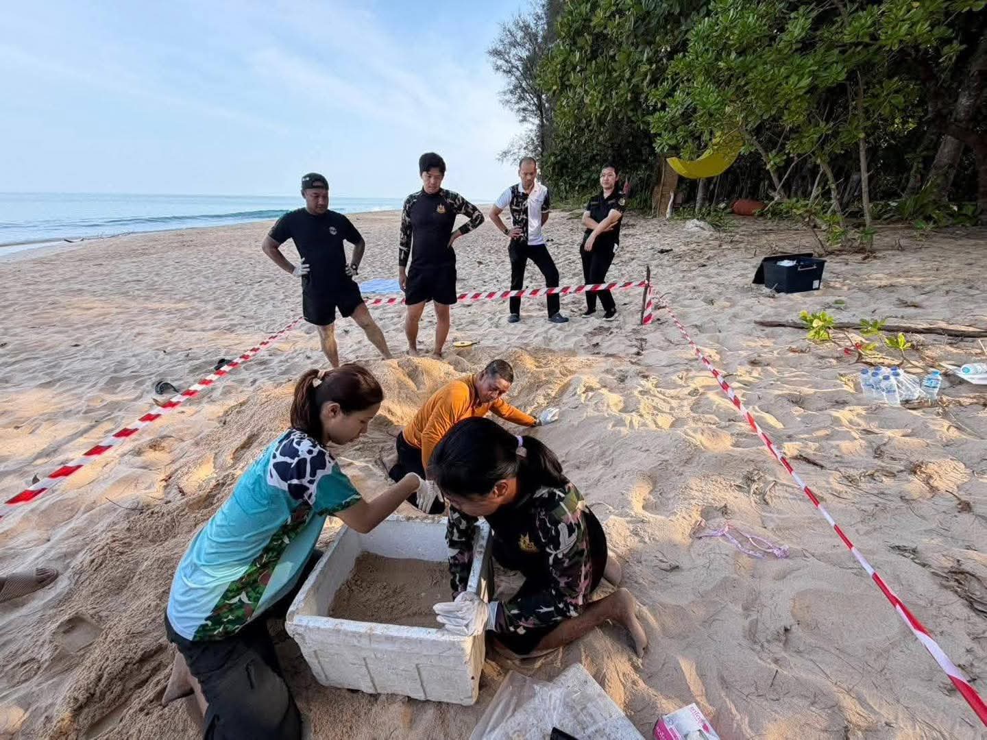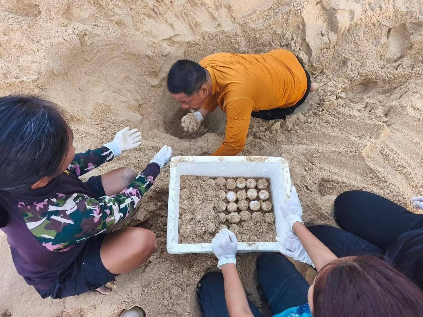 จุดวางไข่อยู่ในพื้นที่เสี่ยงต่อน้ำทะเลท่วม เจ้าหน้าที่จึงตัดสินใจขุดย้ายไข่ทั้งหมดไปยังบริเวณชายหาดหน้าศูนย์บริการนักท่องเที่ยว พร้อมจัดทำคอกป้องกัน เพื่อให้ไข่ฟักตามธรรมชาติอย่างปลอดภัย คาดว่าจะใช้เวลาประมาณ 55–65 วัน
