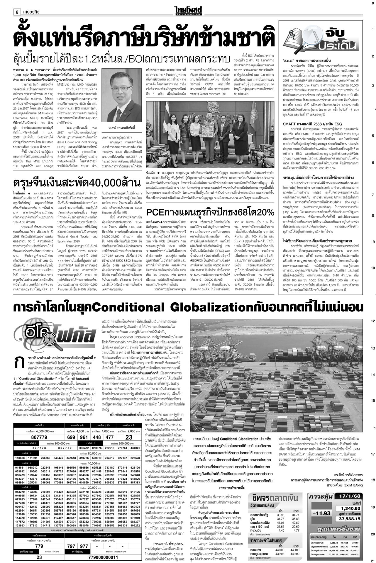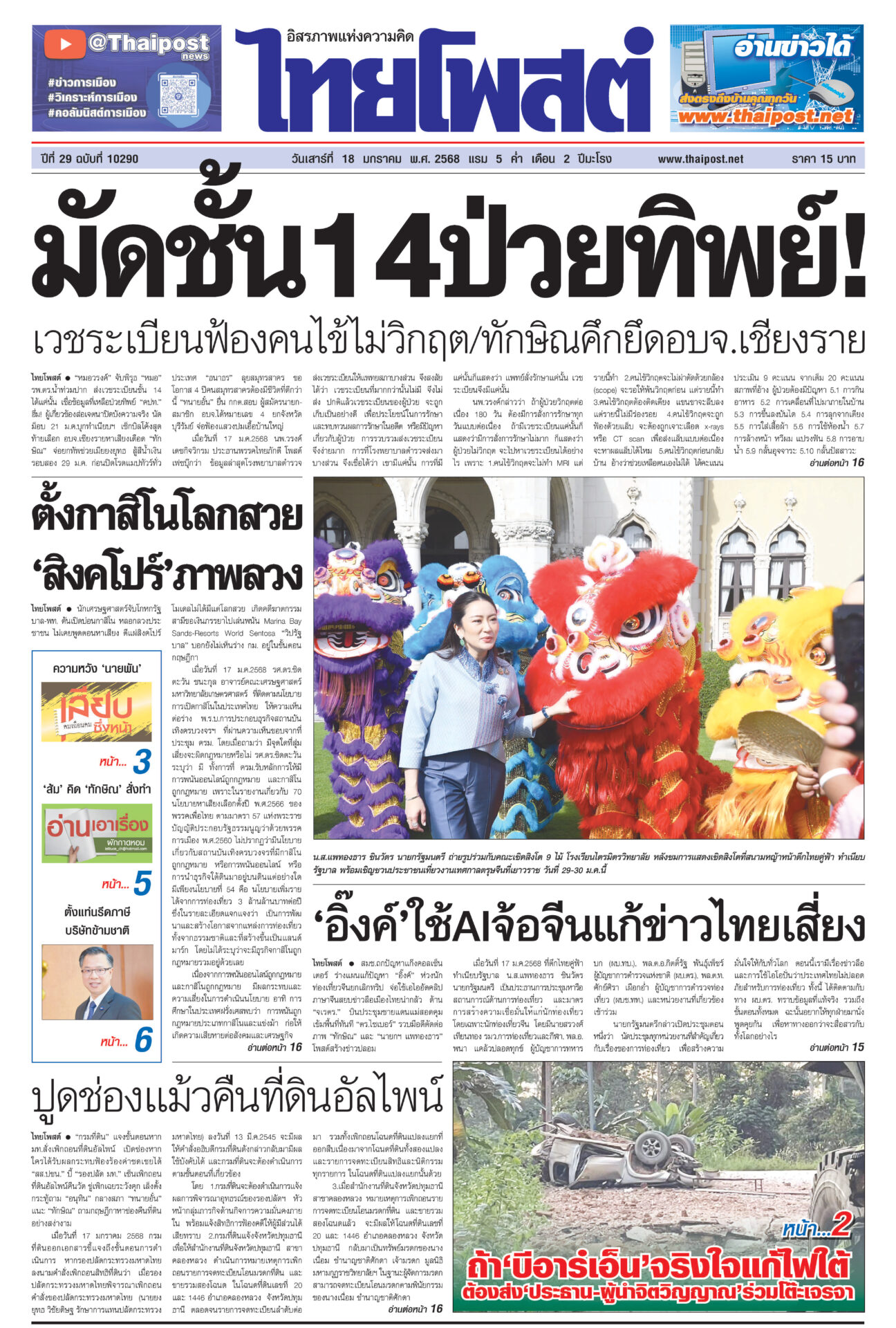 หนังสือพิมพ์ ฉบับวันที่ 18 มกราคม 2568ข่าวหน้าหนึ่งมัดชั้น14ป่วยทิพย์! เวชระเบียนฟ้องคนไข้ไม่วิกฤต/ทักษิณคึกยึดอบจ.เชียงราย“หมอวรงค์” จับพิรุธ “หมอ” รพ.ตร.น้ำท่วมปาก ส่งเวชระเบียนชั้น 14 ได้แค่นั้น ตั้งกาสิโนโลกสวย ‘สิงคโปร์’ภาพลวงนักเศรษฐศาสตร์จับโกหกรัฐบาล-พท. ดันเปิดบ่อนกาสิโน หลอกลวงประชาชน ไม่เคยพูดตอนหาเสียง ‘อิ๊งค์’ใช้AIจ้อจีนแก้ข่าวไทยเสี่ยงสมช.ถกปัญหาแก๊งคอลเซ็นเตอร์ ร่างแผนแก้ปัญหา “อิ๊งค์” ห่วงนักท่องเที่ยวจีนยกเลิกทริป จ่อใช้เอไออัดคลิปภาษาจีนสยบข่าวลือเมืองไทยน่ากลัว ปูดช่องแม้วคืนที่ดินอัลไพน์“กรมที่ดิน” แจงขั้นตอนหาก มท.สั่งเพิกถอนที่ดินอัลไพน์ เปิดช่องหากใครได้รับผลกระทบฟ้องร้องค่าชดเชยได้