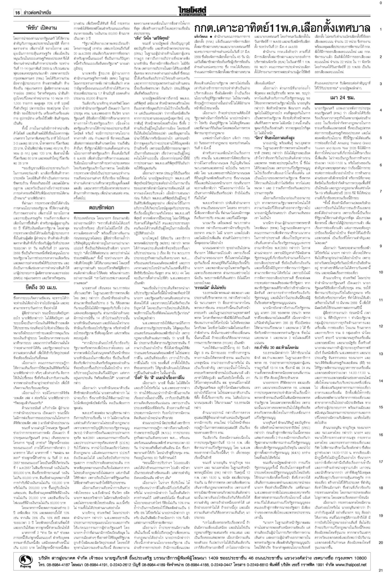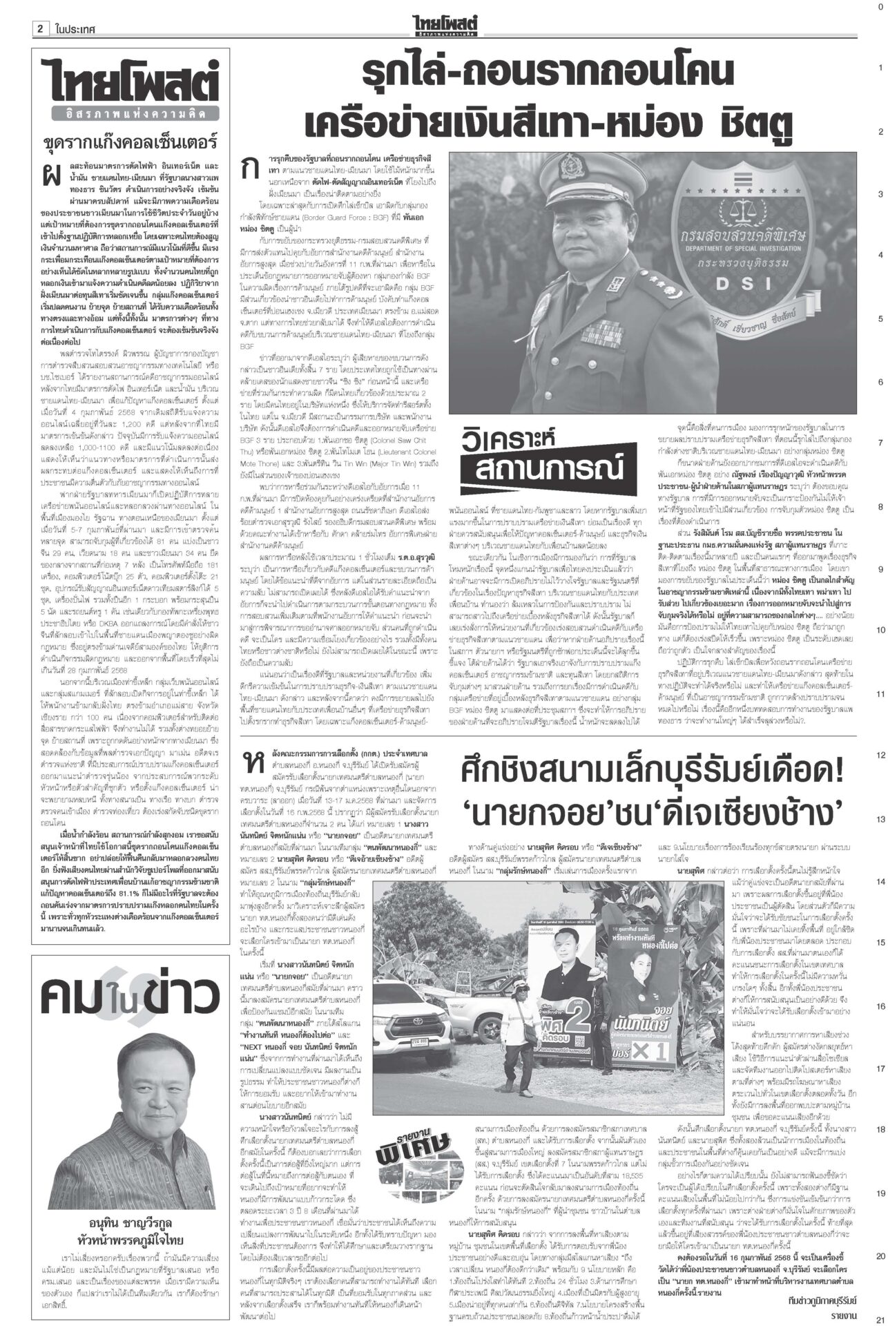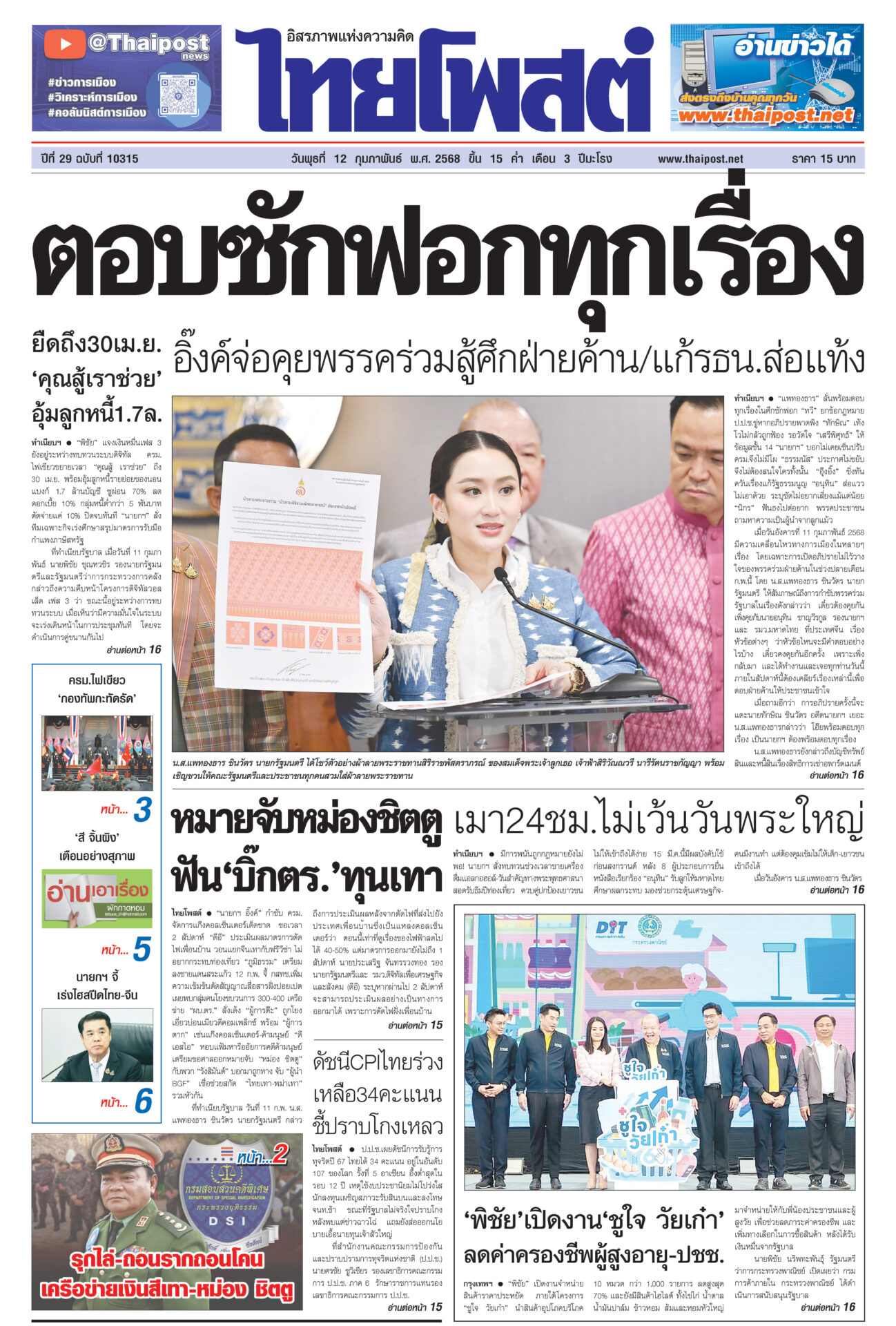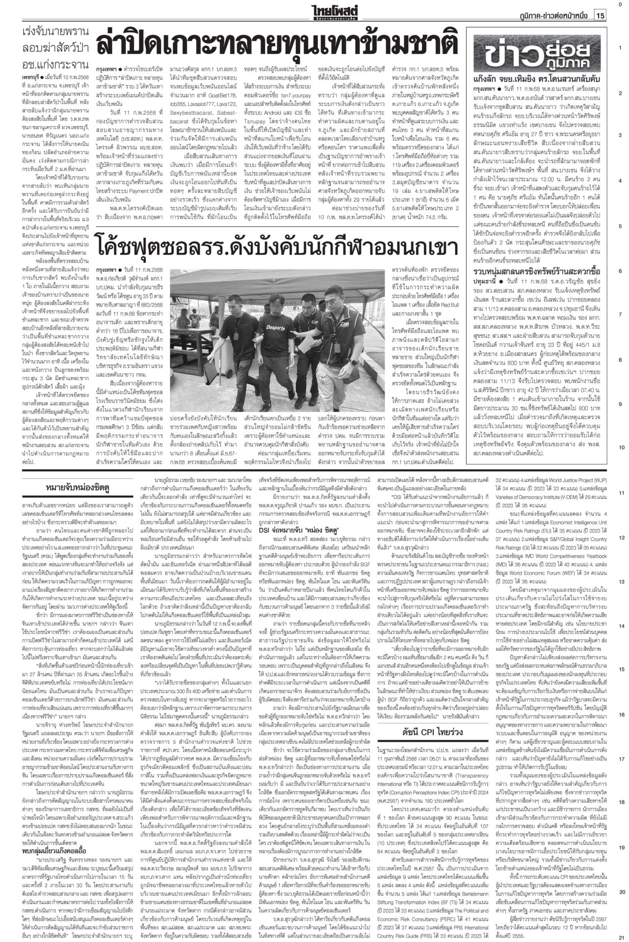หนังสือพิมพ์ ฉบับวันที่ 12 กุมภาพันธ์ 2568ข่าวหน้าหนึ่งตอบซักฟอกทุกเรื่อง อิ๊งค์จ่อคุยพรรคร่วมสู้ศึกฝ่ายค้าน/แก้รธน.ส่อแท้ง“แพทองธาร” ลั่นพร้อมตอบทุกเรื่องในศึกซักฟอก “ทวี” ยกข้อกฎหมาย ป.ป.ช.ขู่หากอภิปรายพาดพิง “ทักษิณ” เท้งโวไม่กลัวถูกฟ้อง รอวัดใจ “เสรีพิศุทธ์” ให้ข้อมูลชั้น 14 ดัชนีCPIไทยร่วง เหลือ34คะแนน ชี้ปราบโกงเหลวป.ป.ช.เผยดัชนีการรับรู้การทุจริตปี 67 ไทยได้ 34 คะแนน อยู่ในอันดับ 107 ของโลก รั้งที่ 5 อาเซียน อึ้งต่ำสุดในรอบ 12 ปี ยืดถึง30เม.ย. ‘คุณสู้เราช่วย’ อุ้มลูกหนี้1.7ล.“พิชัย” แจงเงินหมื่นเฟส 3 ยังอยู่ระหว่างทบทวนระบบดิจิทัล ครม.ไฟเขียวขยายเวลา “คุณสู้ เราช่วย” ถึง 30 เม.ย. เมา24ชม.ไม่เว้นวันพระใหญ่มีการพนันถูกกฎหมายยังไม่พอ! นายกฯ สั่งทบทวนช่วงเวลาขายเครื่องดื่มแอลกอฮอล์-วันสำคัญทางพระพุทธศาสนา 'พิชัย'เปิดงาน'ชูใจ วัยเก๋า' ลดค่าครองชีพผู้สูงอายุ-ปชช.“พิชัย” เปิดงานจำหน่ายสินค้าราคาประหยัด ภายใต้โครงการ “ชูใจ วัยเก๋า” นำสินค้าอุปโภคบริโภค 10 หมวด กว่า 1,000 รายการ หมายจับหม่องชิตตู ฟัน‘บิ๊กตร.’ทุนเทา“นายกฯ อิ๊งค์” กำชับ ครม.จัดการแก๊งคอลเซ็นเตอร์เด็ดขาด ขอเวลา 2 อาทิตย์