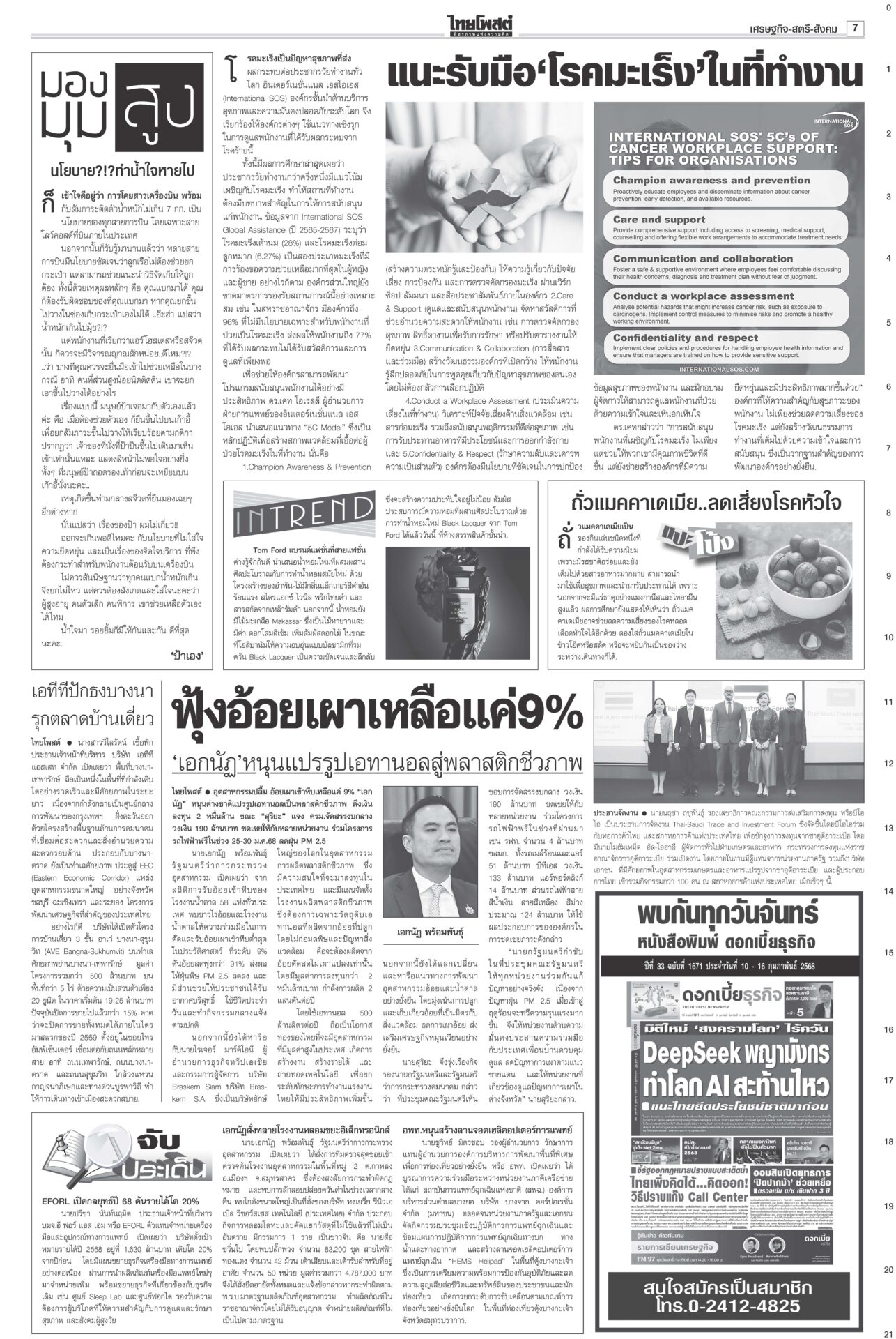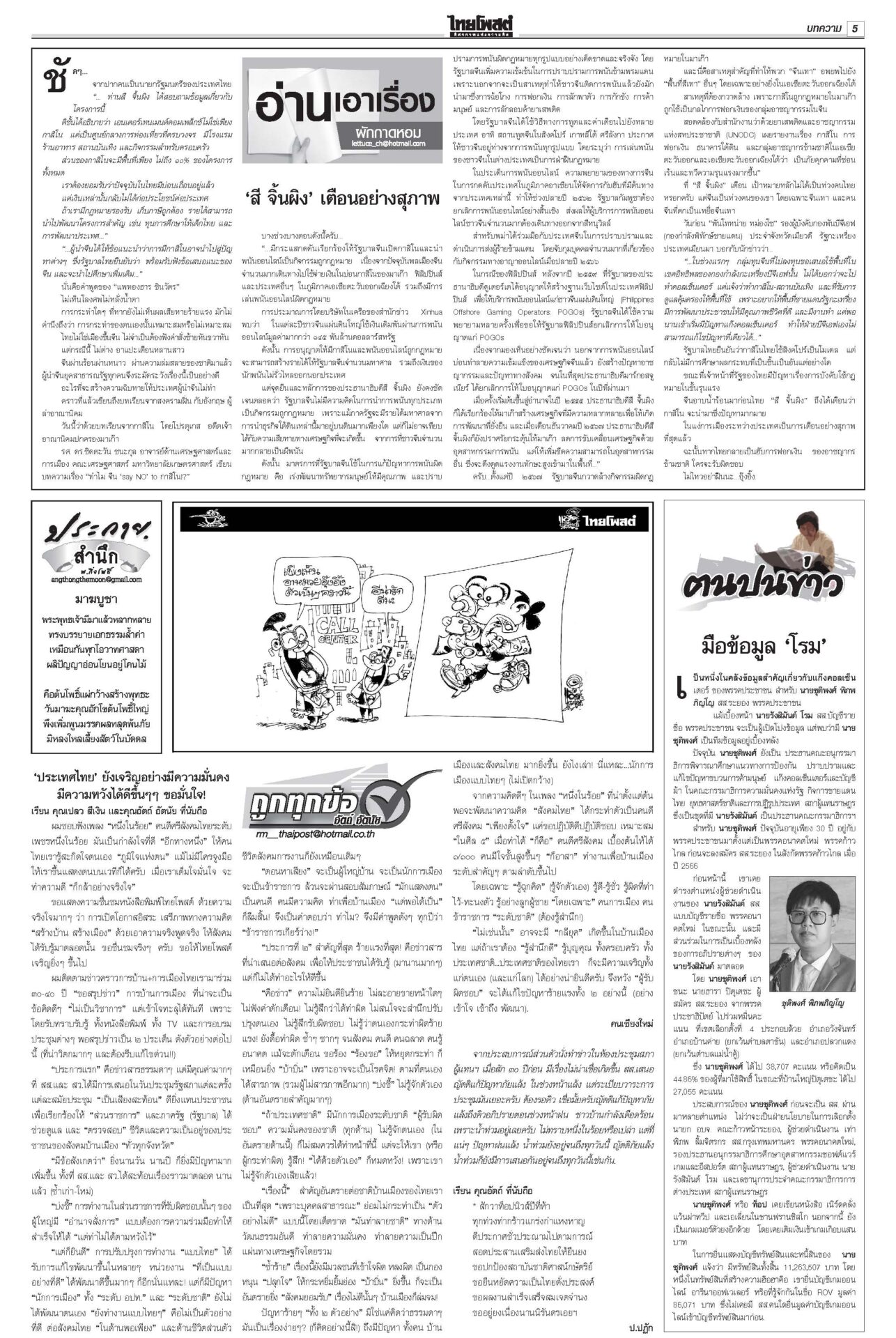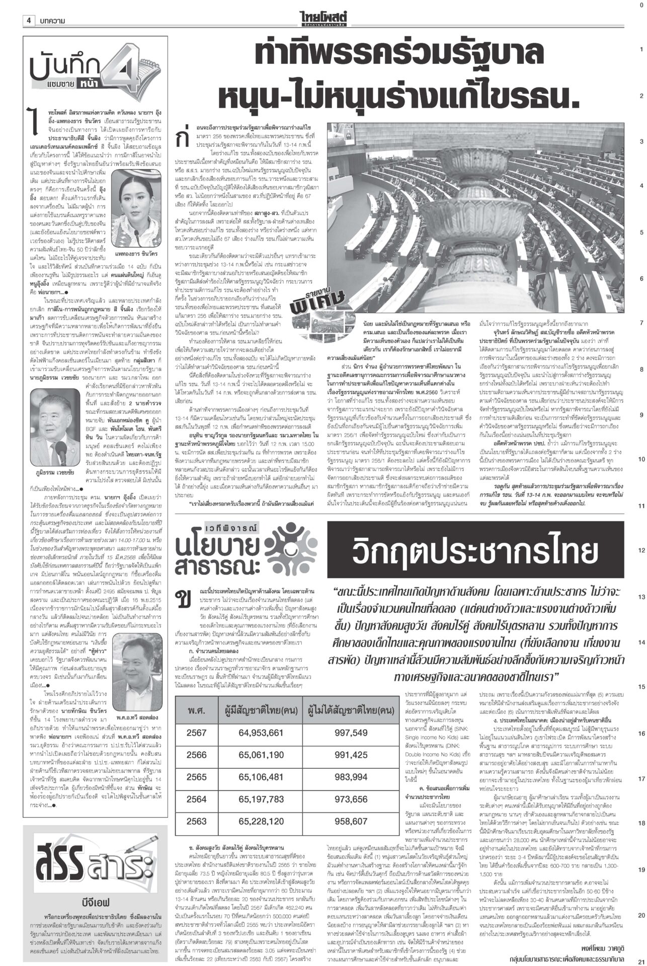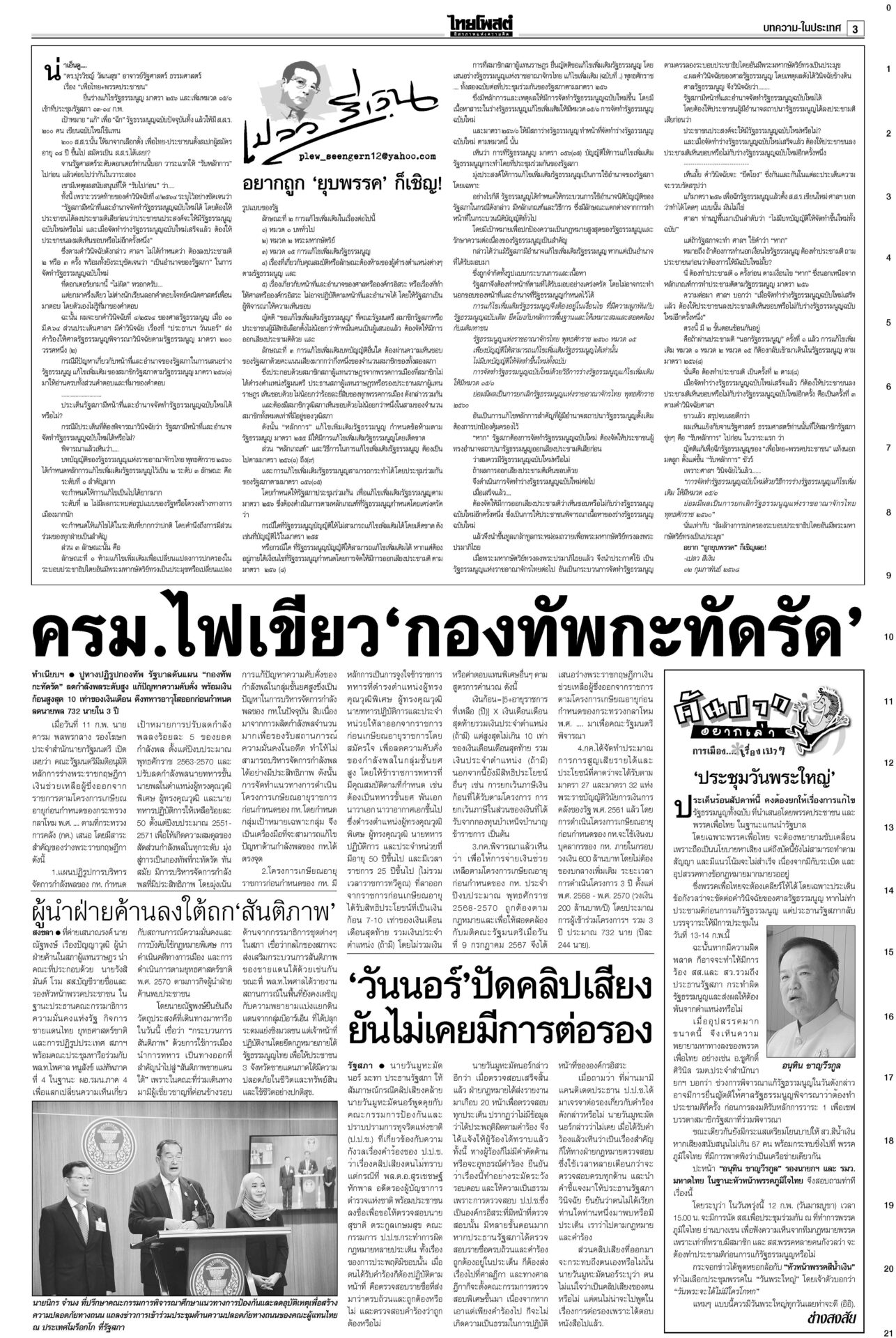หนังสือพิมพ์ ฉบับวันที่ 12 กุมภาพันธ์ 2568ข่าวหน้าหนึ่งตอบซักฟอกทุกเรื่อง อิ๊งค์จ่อคุยพรรคร่วมสู้ศึกฝ่ายค้าน/แก้รธน.ส่อแท้ง“แพทองธาร” ลั่นพร้อมตอบทุกเรื่องในศึกซักฟอก “ทวี” ยกข้อกฎหมาย ป.ป.ช.ขู่หากอภิปรายพาดพิง “ทักษิณ” เท้งโวไม่กลัวถูกฟ้อง รอวัดใจ “เสรีพิศุทธ์” ให้ข้อมูลชั้น 14 ดัชนีCPIไทยร่วง เหลือ34คะแนน ชี้ปราบโกงเหลวป.ป.ช.เผยดัชนีการรับรู้การทุจริตปี 67 ไทยได้ 34 คะแนน อยู่ในอันดับ 107 ของโลก รั้งที่ 5 อาเซียน อึ้งต่ำสุดในรอบ 12 ปี ยืดถึง30เม.ย. ‘คุณสู้เราช่วย’ อุ้มลูกหนี้1.7ล.“พิชัย” แจงเงินหมื่นเฟส 3 ยังอยู่ระหว่างทบทวนระบบดิจิทัล ครม.ไฟเขียวขยายเวลา “คุณสู้ เราช่วย” ถึง 30 เม.ย. เมา24ชม.ไม่เว้นวันพระใหญ่มีการพนันถูกกฎหมายยังไม่พอ! นายกฯ สั่งทบทวนช่วงเวลาขายเครื่องดื่มแอลกอฮอล์-วันสำคัญทางพระพุทธศาสนา 'พิชัย'เปิดงาน'ชูใจ วัยเก๋า' ลดค่าครองชีพผู้สูงอายุ-ปชช.“พิชัย” เปิดงานจำหน่ายสินค้าราคาประหยัด ภายใต้โครงการ “ชูใจ วัยเก๋า” นำสินค้าอุปโภคบริโภค 10 หมวด กว่า 1,000 รายการ หมายจับหม่องชิตตู ฟัน‘บิ๊กตร.’ทุนเทา“นายกฯ อิ๊งค์” กำชับ ครม.จัดการแก๊งคอลเซ็นเตอร์เด็ดขาด ขอเวลา 2 อาทิตย์