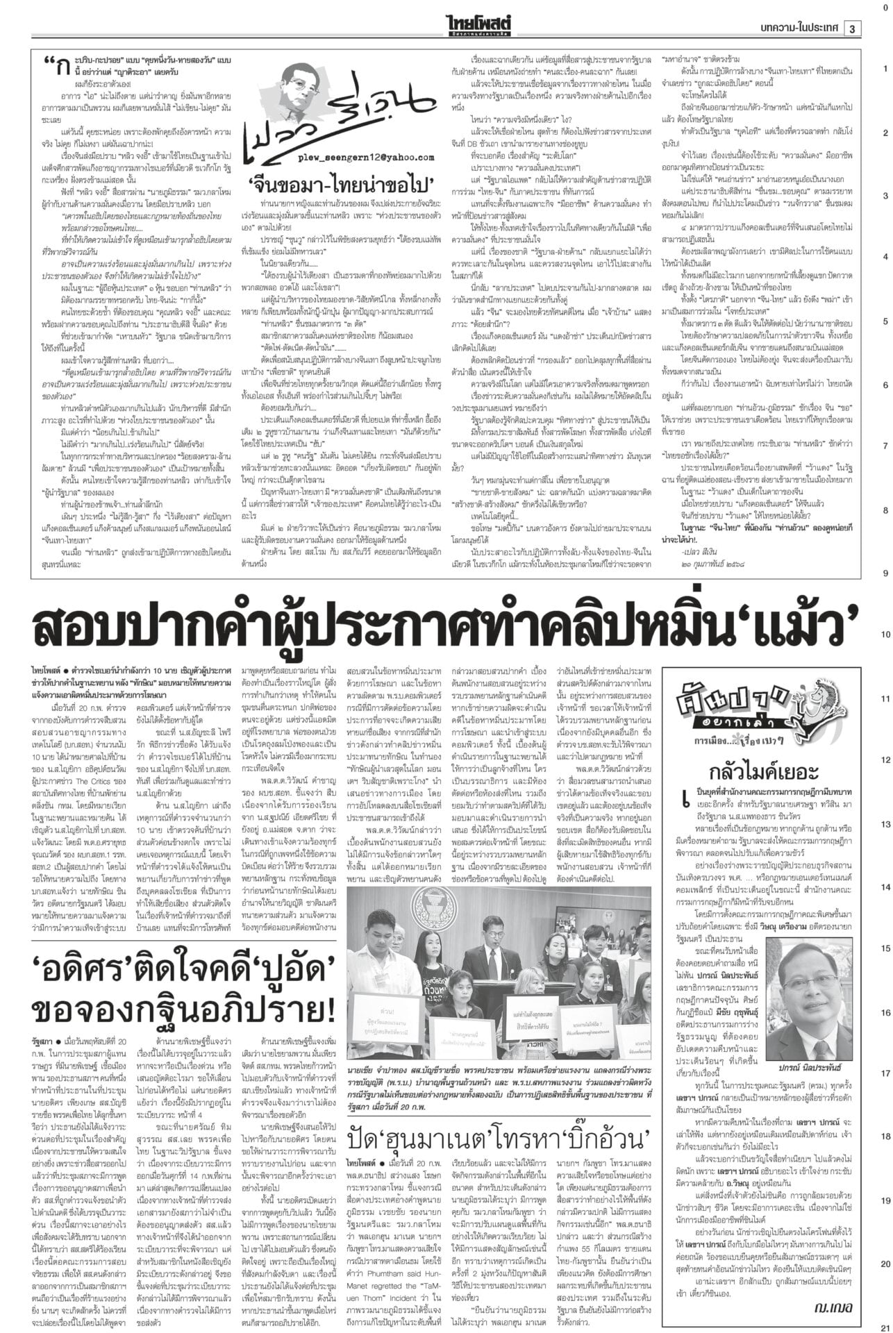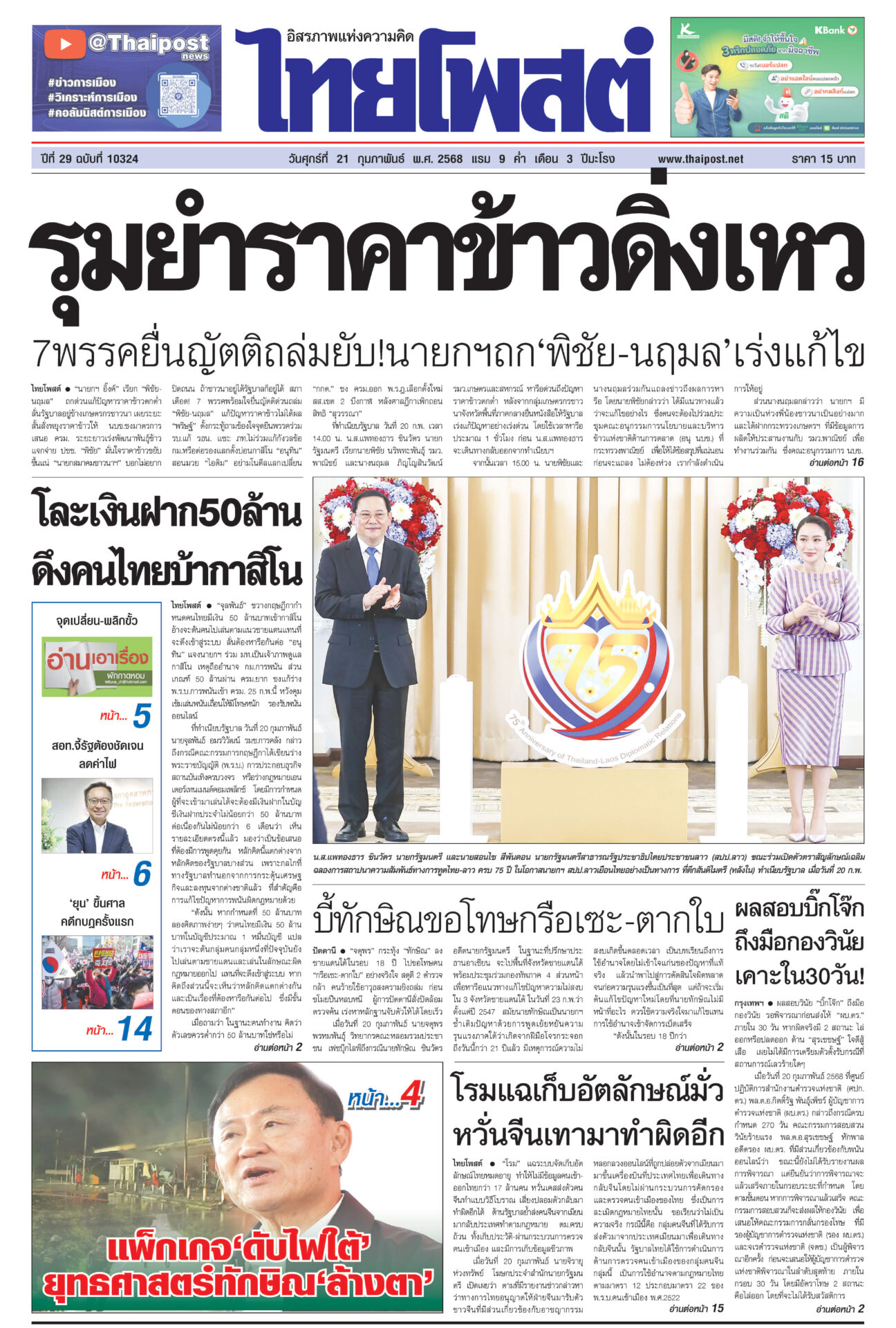 หนังสือพิมพ์ ฉบับวันที่ 21 กุมภาพันธ์ 2568ข่าวหน้าหนึ่งรุมยำราคาข้าวดิ่งเหว 7พรรคยื่นญัตติถล่มยับ!นายกฯถก‘พิชัย-นฤมล’เร่งแก้ไข“นายกฯ อิ๊งค์” เรียก “พิชัย-นฤมล” ถกด่วนแก้ปัญหาราคาข้าวตกต่ำ บี้ทักษิณขอโทษกรือเซะ-ตากใบ“จตุพร” กระทุ้ง “ทักษิณ” ลงชายแดนใต้ในรอบ 18 ปี ไปขอโทษคน “กรือเซะ-ตากใบ” อย่างจริงใจ โรมแฉเก็บอัตลักษณ์มั่ว หวั่นจีนเทามาทำผิดอีก“โรม” แฉระบบจัดเก็บอัตลักษณ์ไทยหมดอายุ ทำให้ไม่มีข้อมูลคนเข้า-ออกไทยกว่า 17 ล้านคน โละเงินฝาก50ล้าน ดึงคนไทยบ้ากาสิโน“จุลพันธ์” ขวางกฤษฎีกากำหนดคนไทยมีเงิน 50 ล้านบาทเข้ากาสิโน ผลสอบบิ๊กโจ๊ก ถึงมือกองวินัย เคาะใน30วัน!ผลสอบวินัย “บิ๊กโจ๊ก” ถึงมือกองวินัย รอพิจารณาก่อนส่งให้ “ผบ.ตร.” ภายใน 30 วัน