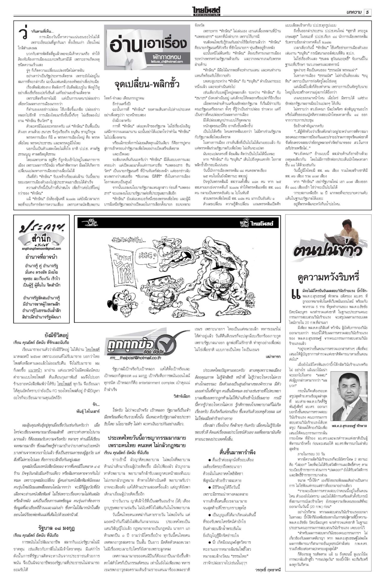 ฉบับวันที่ 21 กุมภาพันธ์ 2568 21 กุมภาพันธ์ 2568 เวลา 0:01 น. หนังสือพิมพ์ ฉบับวันที่ 21 กุมภาพันธ์ 2568ข่าวหน้าหนึ่งรุมยำราคาข้าวดิ่งเหว 7พรรคยื่นญัตติถล่มยับ!นายกฯถก‘พิชัย-นฤมล’เร่งแก้ไข“นายกฯ อิ๊งค์” เรียก “พิชัย-นฤมล” ถกด่วนแก้ปัญหาราคาข้าวตกต่ำ บี้ทักษิณขอโทษกรือเซะ-ตากใบ“จตุพร” กระทุ้ง “ทักษิณ” ลงชายแดนใต้ในรอบ 18 ปี ไปขอโทษคน “กรือเซะ-ตากใบ” อย่างจริงใจ โรมแฉเก็บอัตลักษณ์มั่ว หวั่นจีนเทามาทำผิดอีก“โรม” แฉระบบจัดเก็บอัตลักษณ์ไทยหมดอายุ ทำให้ไม่มีข้อมูลคนเข้า-ออกไทยกว่า 17 ล้านคน โละเงินฝาก50ล้าน ดึงคนไทยบ้ากาสิโน“จุลพันธ์” ขวางกฤษฎีกากำหนดคนไทยมีเงิน 50 ล้านบาทเข้ากาสิโน ผลสอบบิ๊กโจ๊ก ถึงมือกองวินัย เคาะใน30วัน!ผลสอบวินัย “บิ๊กโจ๊ก” ถึงมือกองวินัย รอพิจารณาก่อนส่งให้ “ผบ.ตร.” ภายใน 30 วัน Tagsรายวันหนังสือพิมพ์ ข่าวที่เกี่ยวข้อง ฉบับวันที่ 7 ธันวาคม 2568 ฉบับวันที่ 6 ธันวาคม 2568 ฉบับวันที่ 5 ธันวาคม 2568 ฉบับวันที่ 4 ธันวาคม 2568 ฉบับวันที่ 3 ธันวาคม 2568 ฉบับวันที่ 2 ธันวาคม 2568 NEWS UPDATE 1:00 น. มะม่วงหิมพานต์กับปาฏิหาริย์เรื่องราวแห่งแรงใจจากบ้านหาดไก่ต้อย จังหวัดอุตรดิตถ์ 0:01 น. หาดใหญ่-สแกมเมอร์ทำรบ.'แต้มหล่น' 'อนุทิน'เปิดหน้าชนกู้เรตติ้ง 21:16 น. จนท.ปกครองเดินฝ่าดงหนาม 4 กม. จับหนุ่มซุกยาบ้าในรูปู 126 เม็ด 20:58 น. ชาวบ้านริมน้ำสาละวิน มึนข้อมูลราชการสุดสับสน ไม่แน่ใจปลา-พืชริมน้ำกินได้หรือไม่ 19:07 น. ลมหนาวมาอีกระลอก! กรมอุตุฯ พยากรณ์อากาศ 7 วันข้างหน้า อุณหภูมิจะลดลง 2-4 องศา
