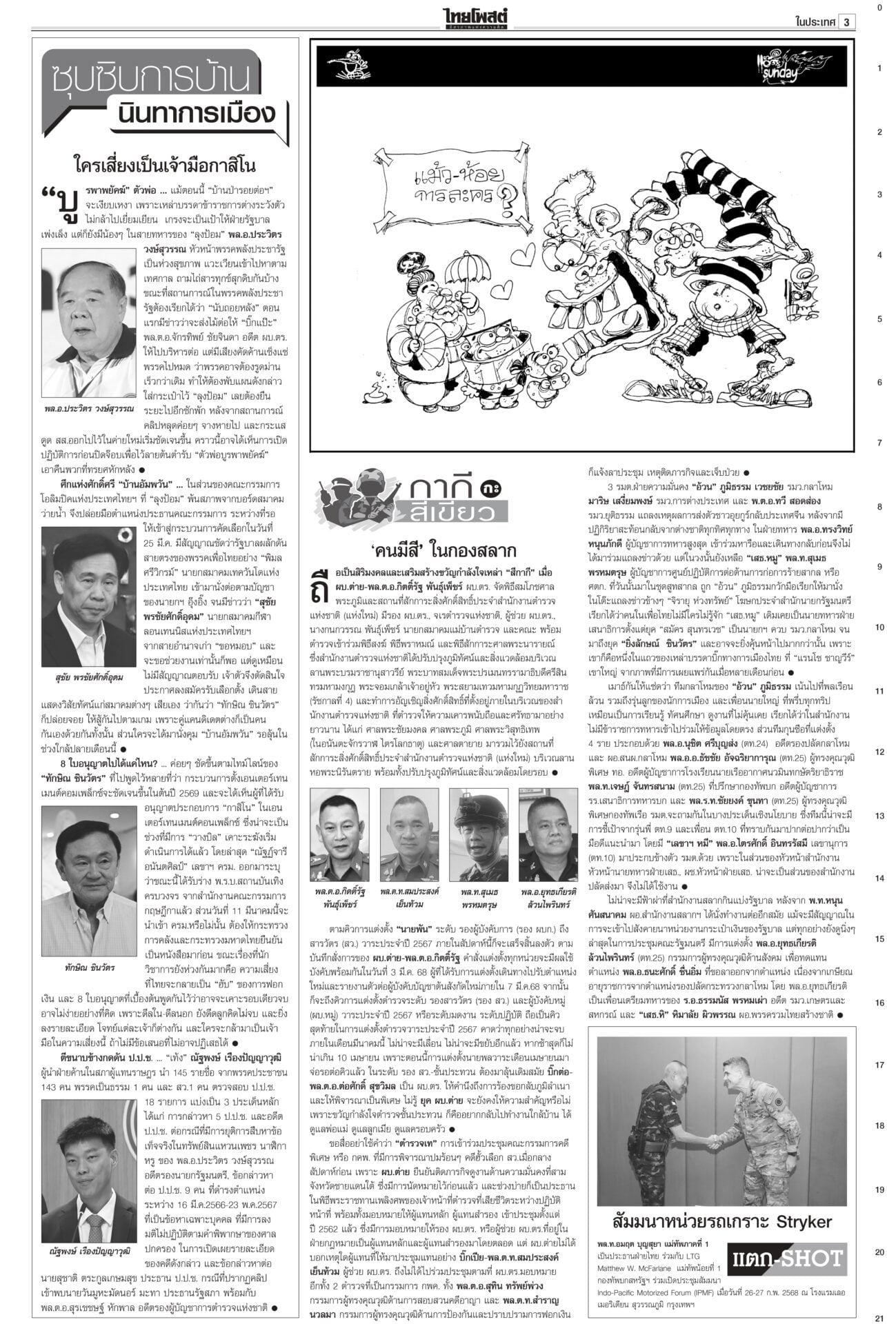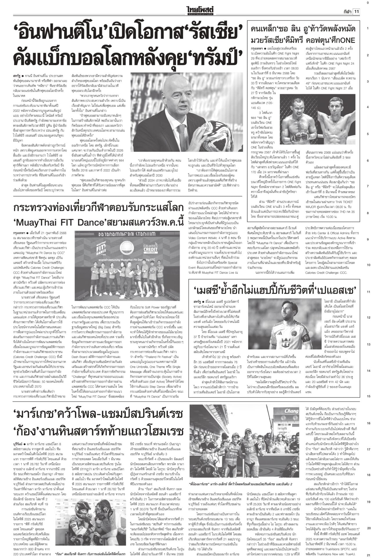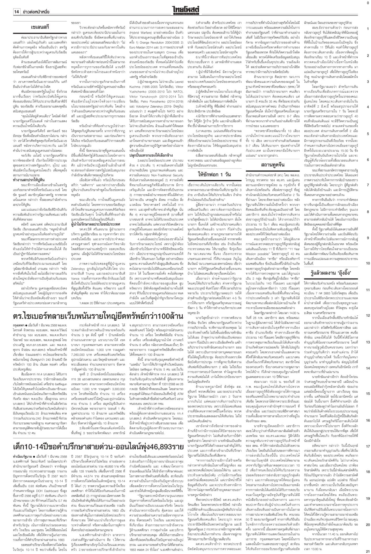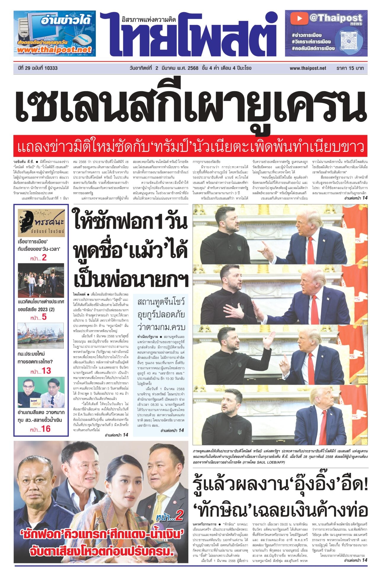 หนังสือพิมพ์ฉบับวันที่ 2 มีนาคม 2568ข่าวหน้าหนึ่งให้ซักฟอก 1 วัน พูดชื่อ ‘แม้ว’ ได้ เป็นพ่อนายกฯเพื่อไทยยันซักฟอกวันเดียวพอ เพราะอภิปรายนายกฯ คนเดียว “วิสุทธิ์” แนะใส่ให้เต็มที่ไม่ต้องขี่ม้าเลียบค่าย ไม่ถึงขั้นห้ามเอ่ยชื่อ “ทักษิณ” ถ้าบอกว่าเป็นพ่อของนายกฯ ไม่เป็นไร รู้แล้วผลงาน ‘อุ๊งอิ๊ง’ อืด! ‘ทักษิณ’ เฉลยเงินค้างท่อ“ทักษิณ” ยกคณะเยือนนครศรีฯ เป็นประธานพิธียกฉัตรพระประธานและทอดผ้าป่าสามัคคีสร้างอุโบสถ ประชาชนแห่ต้อนรับ บอกทำแต่งาน ได้ทำบุญบ้างสบายใจดี เซเลนสกีเผายูเครน แถลงข่าวมิติใหม่ซัดกับ ‘ทรัมป์’ นัวเนียตะเพิดพ้นทำ เนียบขาวมิติใหม่การแถลงข่าว “โดนัลด์ ทรัมป์” กับ “โวโลดิมีร์ เซเลนสกี” โต้เถียงกันดุเดือด จนผู้นำสหรัฐโกรธจัดและไล่ผู้นำยูเครนออกจากทำเนียบขาว ส่อแววล้มข้อตกลงสันติภาพรวมทั้งข้อตกลงการเข้าถึงแร่หายาก