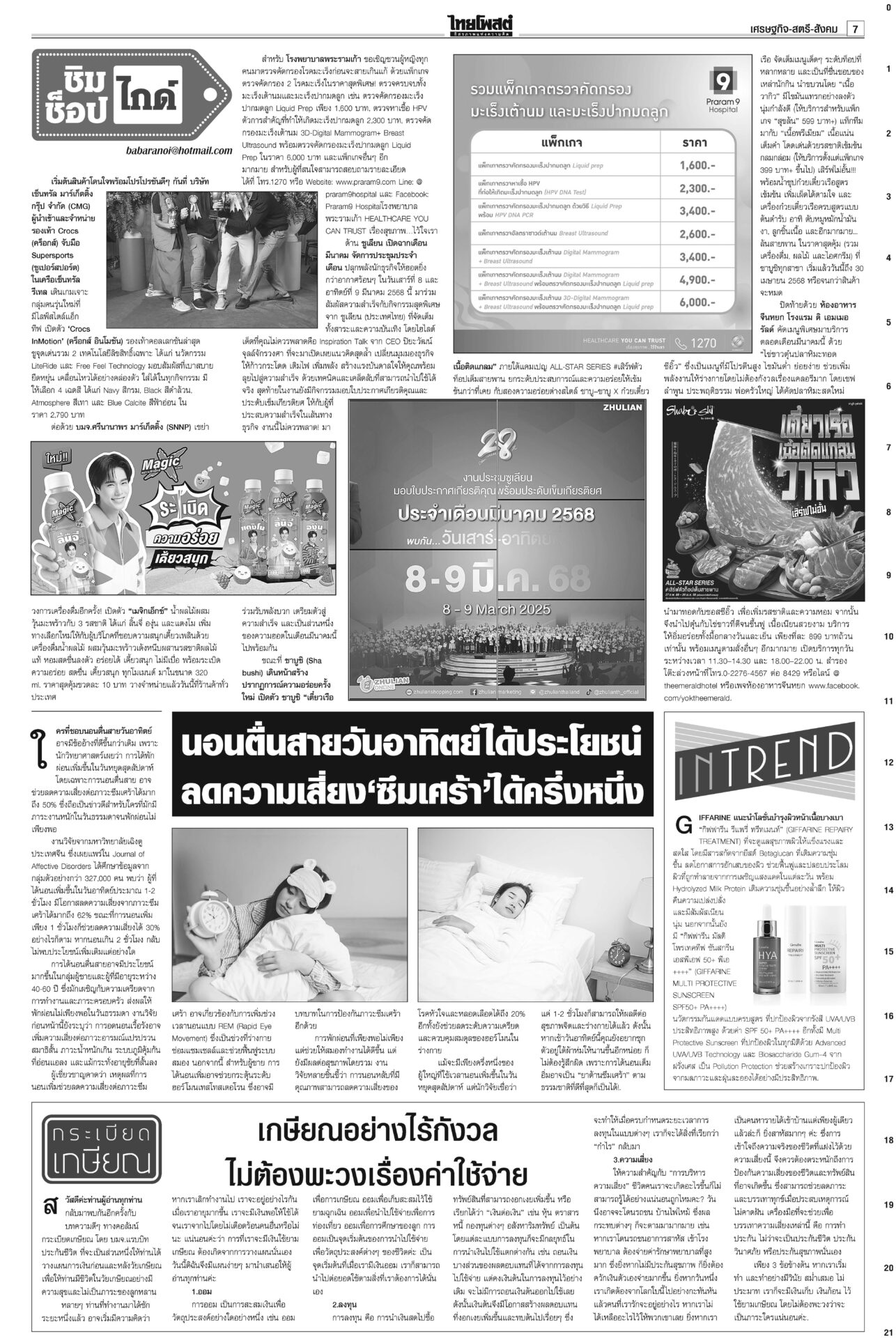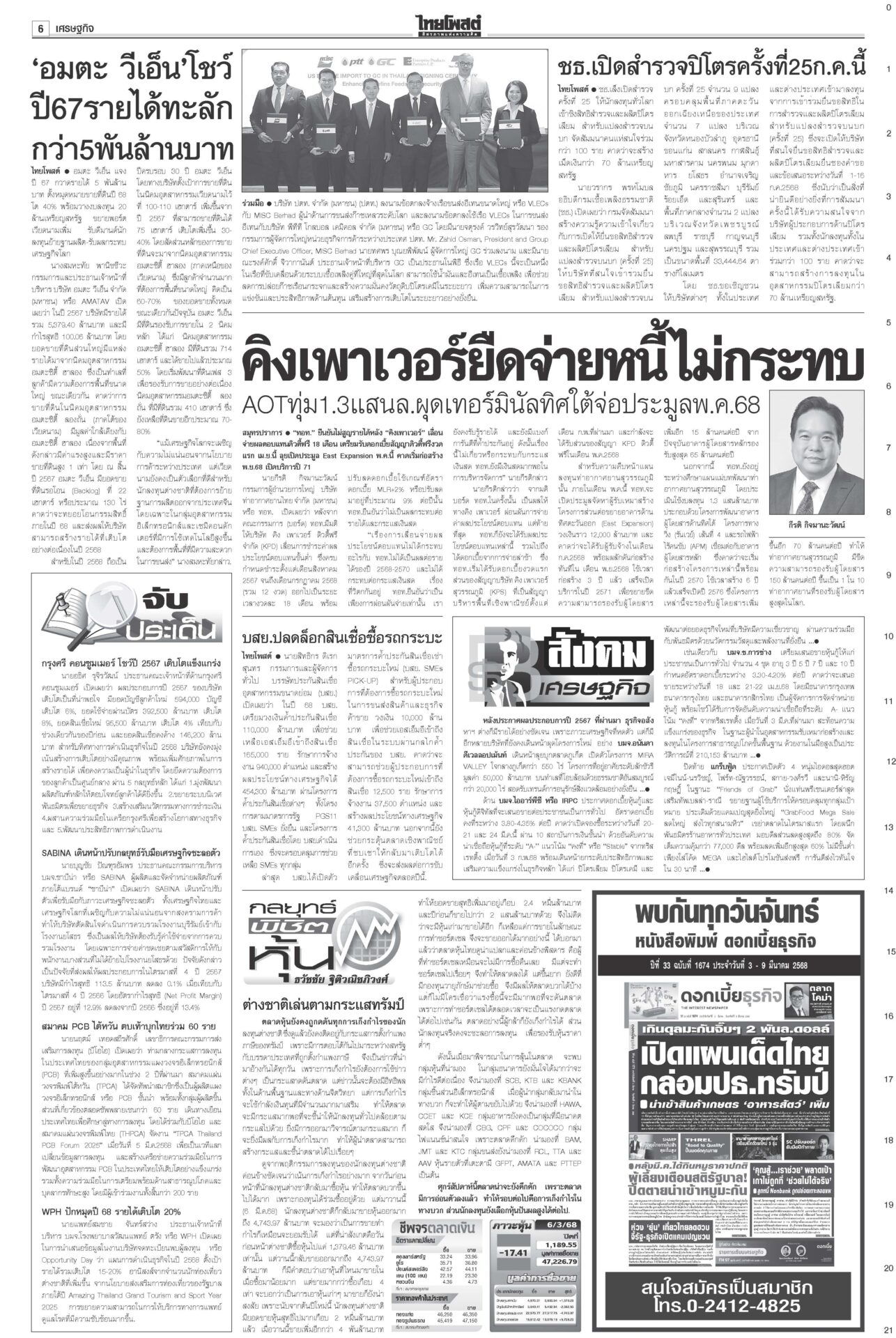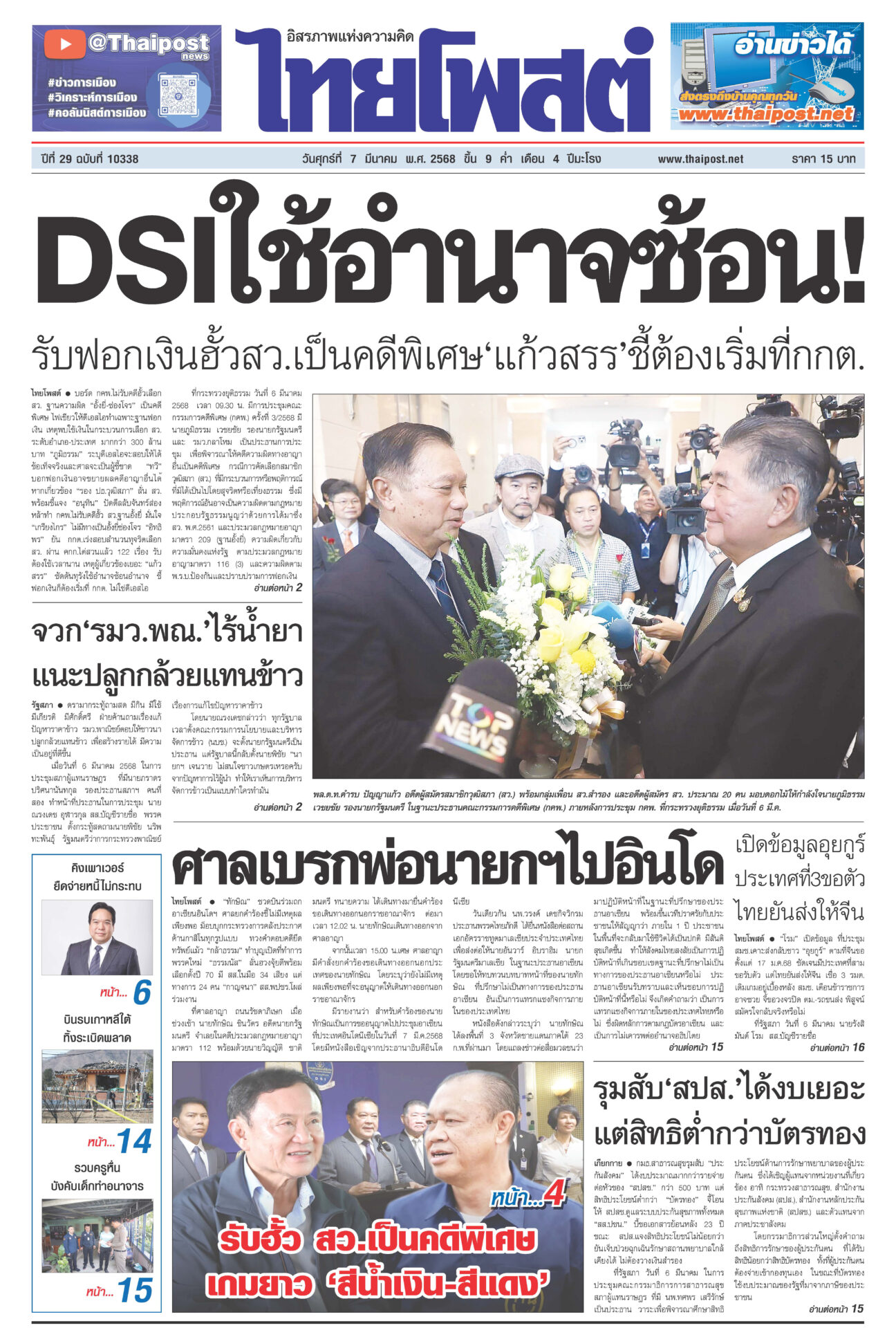 หนังสือพิมพ์ ฉบับวันที่ 7 มีนาคม 2568ข่าวหน้าหนึ่งDSIใช้อำนาจซ้อน! รับฟอกเงินฮั้วสว.เป็นคดีพิเศษ‘แก้วสรร’ชี้ต้องเริ่มที่กกต.บอร์ด กคพ.ไม่รับคดีฮั้วเลือก สว. ฐานความผิด “อั้งยี่-ซ่องโจร” เป็นคดีพิเศษ รุมสับ‘สปส.’ได้งบเยอะ แต่สิทธิตํ่ากว่าบัตรทองกมธ.สาธารณสุขรุมสับ “ประกันสังคม” ได้งบประมาณมากกว่ารายจ่ายต่อหัวของ ศาลเบรกพ่อนายกฯไปอินโด“ทักษิณ” ชวดบินร่วมถกอาเซียนอินโดฯ ศาลยกคำร้องชี้ไม่มีเหตุผลเพียงพอ จวก‘รมว.พณ.’ไร้นํ้ายา แนะปลูกกล้วยแทนข้าวดรามากระทู้ถามสด มีกิน มีใช้ มีเกียรติ มีศักดิ์ศรี ฝ่ายค้านถามเรื่องแก้ปัญหาราคาข้าว เปิดข้อมูลอุยกูร์ ประเทศที่3ขอตัว ไทยยันส่งให้จีน“โรม” เปิดข้อมูล ที่ประชุม สมช.เคาะส่งกลับชาว “อุยกูร์” ตามที่จีนขอตั้งแต่ 17 ม.ค.68