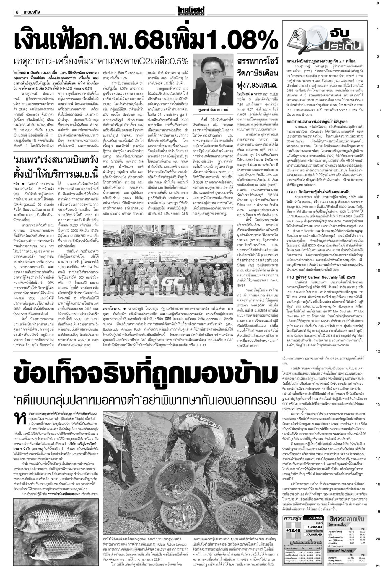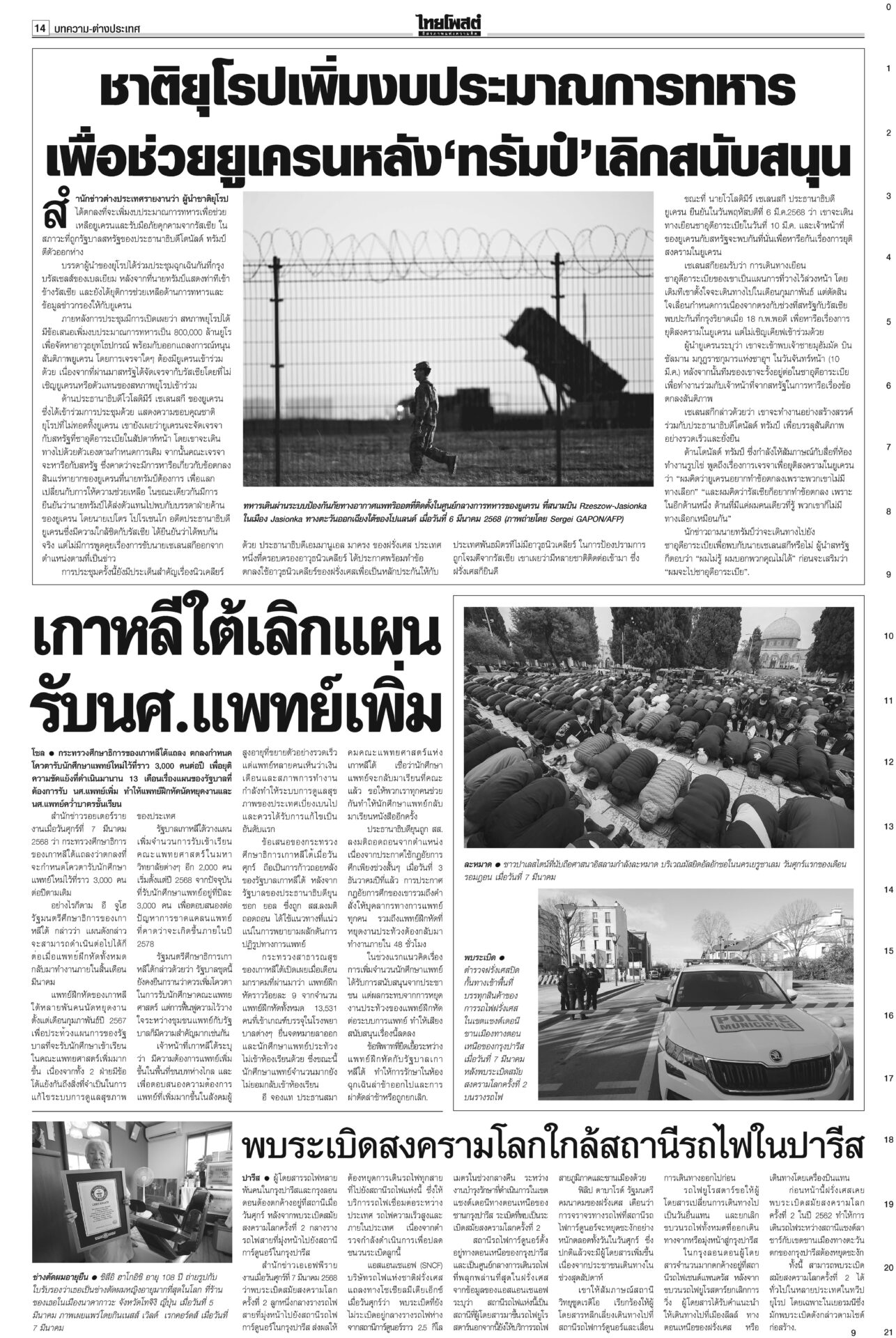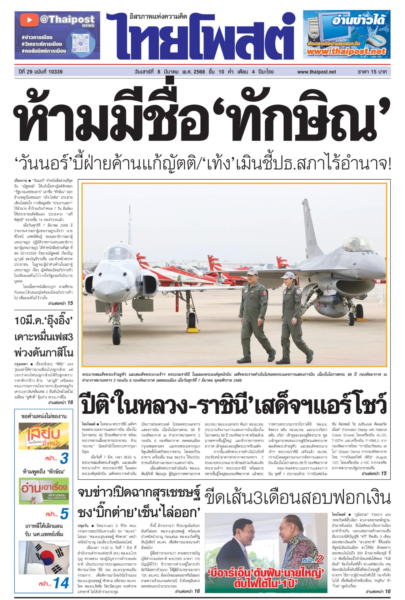 หนังสือพิมพ์ ฉบับวันที่ 8 มีนาคม 2568ข่าวหน้าหนึ่งห้ามมีชื่อ‘ทักษิณ’ ‘วันนอร์’บี้ฝ่ายค้านแก้ญัตติ/‘เท้ง’เมินชี้ปธ.สภาไร้อำนาจ!“วันนอร์” ทำหนังสือด่วนที่สุดถึง “ณัฐพงษ์” ให้แก้เนื้อหาญัตติซักฟอก ปีติ‘ในหลวง-ราชินี’เสด็จฯแอร์โชว์ในหลวง-พระราชินี เสด็จฯ ทอดพระเนตรการแสดงการบิน 10มี.ค.‘อุ๊งอิ๊ง’ เคาะหมื่นเฟส3 พ่วงดันกาสิโนเรื่องกล้วยๆ! “พิชัย” แจงวุ่นเปล่าให้ชาวนาเปลี่ยนไปปลูกกล้วย จบข่าว!ปิดฉากสุรเชชษฐ์ ชง‘บิ๊กต่าย’เซ็น‘ไล่ออก’ปิดฉากแมว 9 ชีวิต คณะกรรมการสอบวินัยเคาะแล้ว ชง “ผบ.ตร.” ไล่ออก “พล.ต.อ.สุรเชชษฐ์ หักพาล” งดบำเหน็จบำนาญ ปมเอี่ยวเว็บพนันออนไลน์ ขีดเส้น3เดือนสอบฟอกเงิน“ภูมิธรรม” ร่ายยาว แจง กคพ.รับคดีฮั้วเลือก สว.ตามพยานหลักฐาน-อำนาจดีเอสไอ