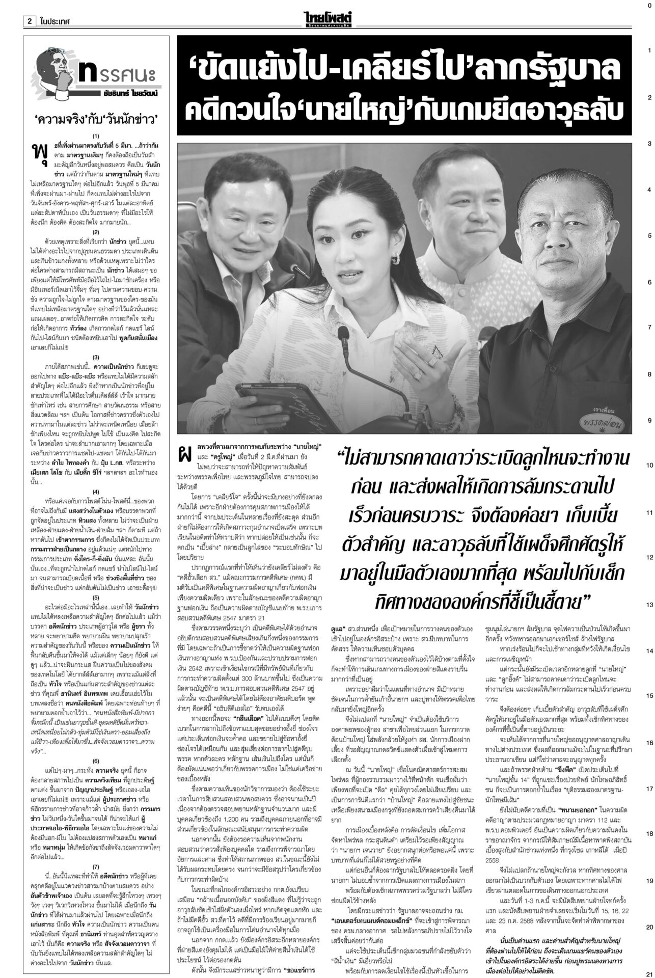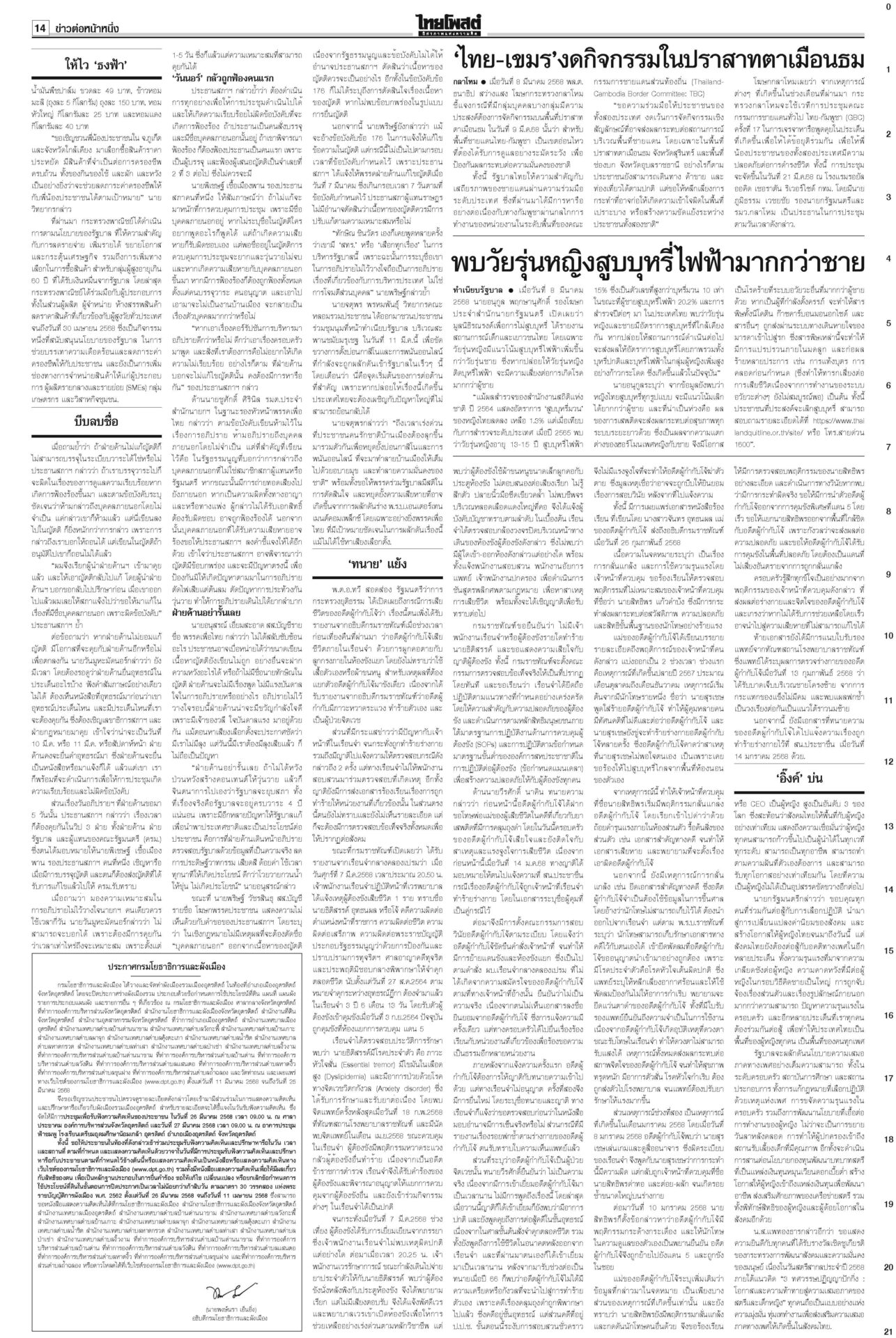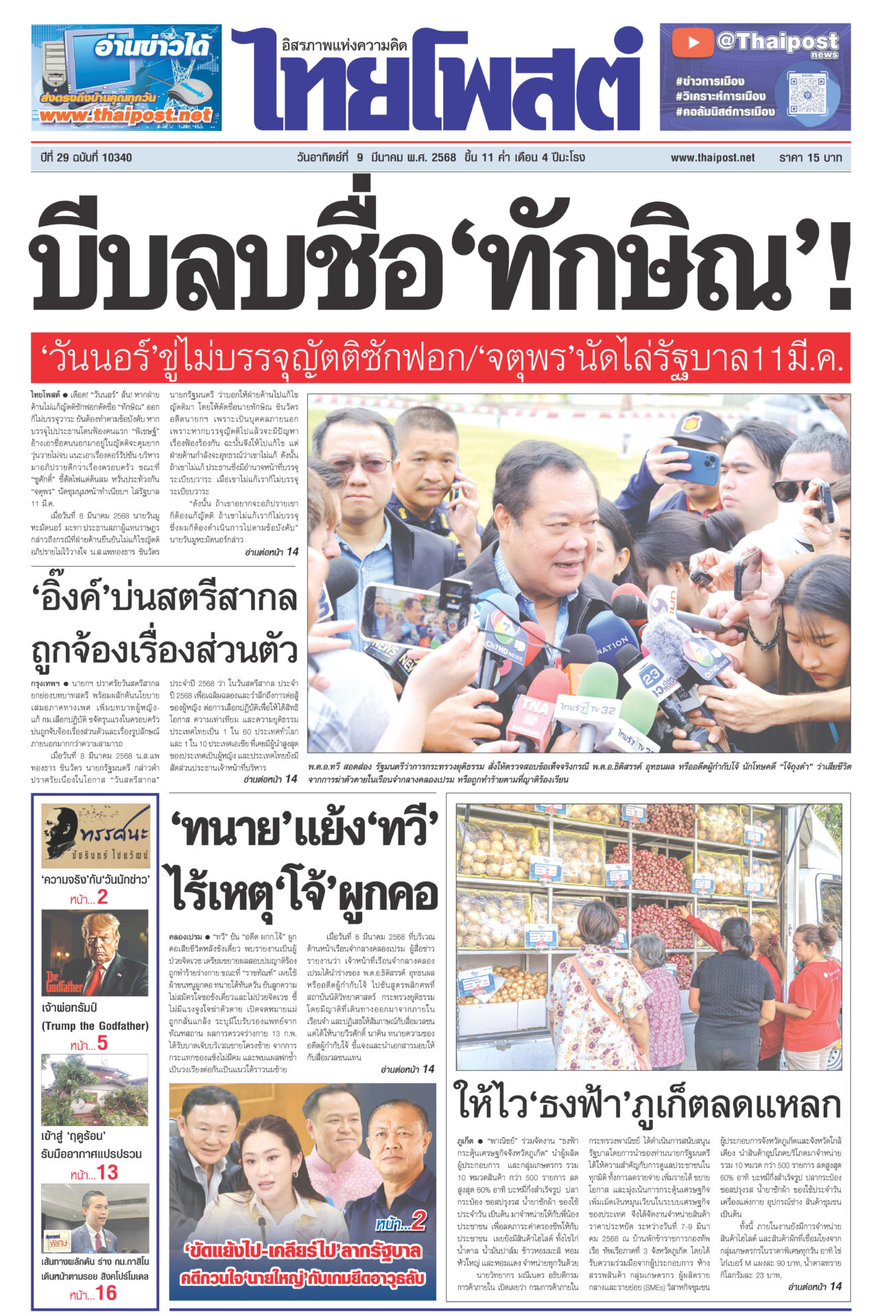 หนังสือพิมพ์ ฉบับวันที่ 9 มีนาคม 2568ข่าวหน้าหนึ่งบีบลบชื่อ‘ทักษิณ’! ‘วันนอร์’ขู่ไม่บรรจุญัตติซักฟอก/‘จตุพร’นัดไล่รัฐบาล11มี.ค.เดือด! “วันนอร์” ลั่น! หากฝ่ายค้านไม่แก้ญัตติซักฟอกตัดชื่อ “ทักษิณ” ออก ก็ไม่บรรจุวาระ ‘ทนาย’แย้ง‘ทวี’ ไร้เหตุ‘โจ้’ผูกคอ“ทวี” ยัน “ผกก.โจ้” ผูกคอเสียชีวิตหลังขังเดี่ยว พบรายงานเป็นผู้ป่วยจิตเวช ‘อิ๊งค์’บ่นสตรีสากล ถูกจ้องเรื่องส่วนตัวนายกฯ ปราศรัยวันสตรีสากล ยกย่องบทบาทสตรี ให้ไว‘ธงฟ้า’ภูเก็ตลดแหลก“พาณิชย์” ร่วมจัดงาน “ธงฟ้ากระตุ้นเศรษฐกิจจังหวัดภูเก็ต”