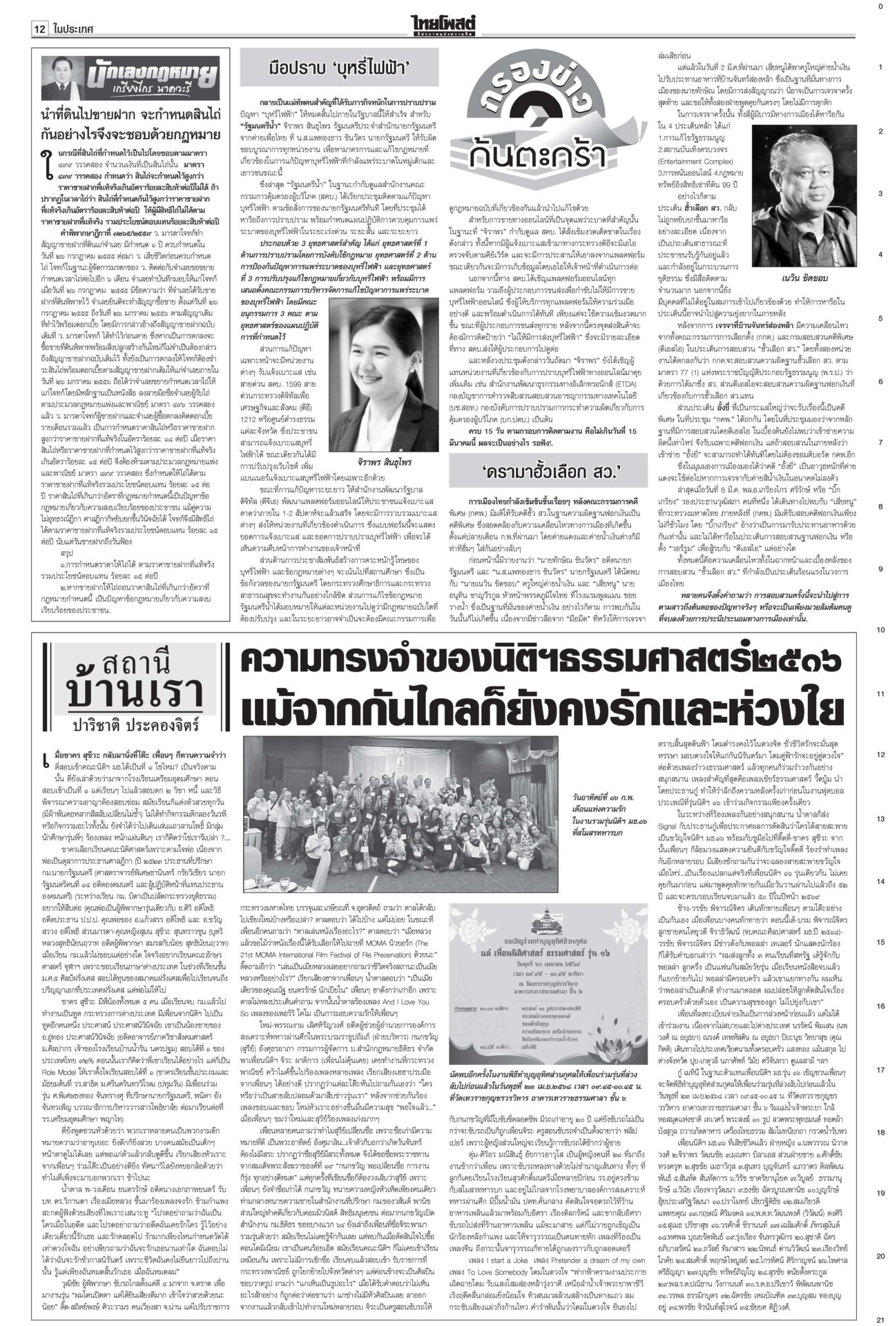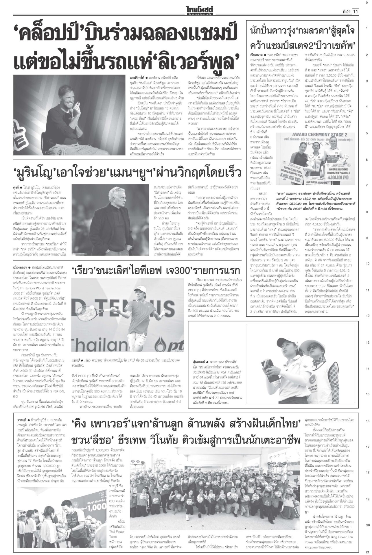 ฉบับวันที่ 9 มีนาคม 2568 9 มีนาคม 2568 เวลา 0:01 น. หนังสือพิมพ์ ฉบับวันที่ 9 มีนาคม 2568ข่าวหน้าหนึ่งบีบลบชื่อ‘ทักษิณ’! ‘วันนอร์’ขู่ไม่บรรจุญัตติซักฟอก/‘จตุพร’นัดไล่รัฐบาล11มี.ค.เดือด! “วันนอร์” ลั่น! หากฝ่ายค้านไม่แก้ญัตติซักฟอกตัดชื่อ “ทักษิณ” ออก ก็ไม่บรรจุวาระ ‘ทนาย’แย้ง‘ทวี’ ไร้เหตุ‘โจ้’ผูกคอ“ทวี” ยัน “ผกก.โจ้” ผูกคอเสียชีวิตหลังขังเดี่ยว พบรายงานเป็นผู้ป่วยจิตเวช ‘อิ๊งค์’บ่นสตรีสากล ถูกจ้องเรื่องส่วนตัวนายกฯ ปราศรัยวันสตรีสากล ยกย่องบทบาทสตรี ให้ไว‘ธงฟ้า’ภูเก็ตลดแหลก“พาณิชย์” ร่วมจัดงาน “ธงฟ้ากระตุ้นเศรษฐกิจจังหวัดภูเก็ต” Tagsรายวันหนังสือพิมพ์ ข่าวที่เกี่ยวข้อง ฉบับวันที่ 7 ธันวาคม 2568 ฉบับวันที่ 6 ธันวาคม 2568 ฉบับวันที่ 5 ธันวาคม 2568 ฉบับวันที่ 4 ธันวาคม 2568 ฉบับวันที่ 3 ธันวาคม 2568 ฉบับวันที่ 2 ธันวาคม 2568 NEWS UPDATE 1:00 น. มะม่วงหิมพานต์กับปาฏิหาริย์เรื่องราวแห่งแรงใจจากบ้านหาดไก่ต้อย จังหวัดอุตรดิตถ์ 0:01 น. หาดใหญ่-สแกมเมอร์ทำรบ.'แต้มหล่น' 'อนุทิน'เปิดหน้าชนกู้เรตติ้ง 21:16 น. จนท.ปกครองเดินฝ่าดงหนาม 4 กม. จับหนุ่มซุกยาบ้าในรูปู 126 เม็ด 20:58 น. ชาวบ้านริมน้ำสาละวิน มึนข้อมูลราชการสุดสับสน ไม่แน่ใจปลา-พืชริมน้ำกินได้หรือไม่ 19:07 น. ลมหนาวมาอีกระลอก! กรมอุตุฯ พยากรณ์อากาศ 7 วันข้างหน้า อุณหภูมิจะลดลง 2-4 องศา