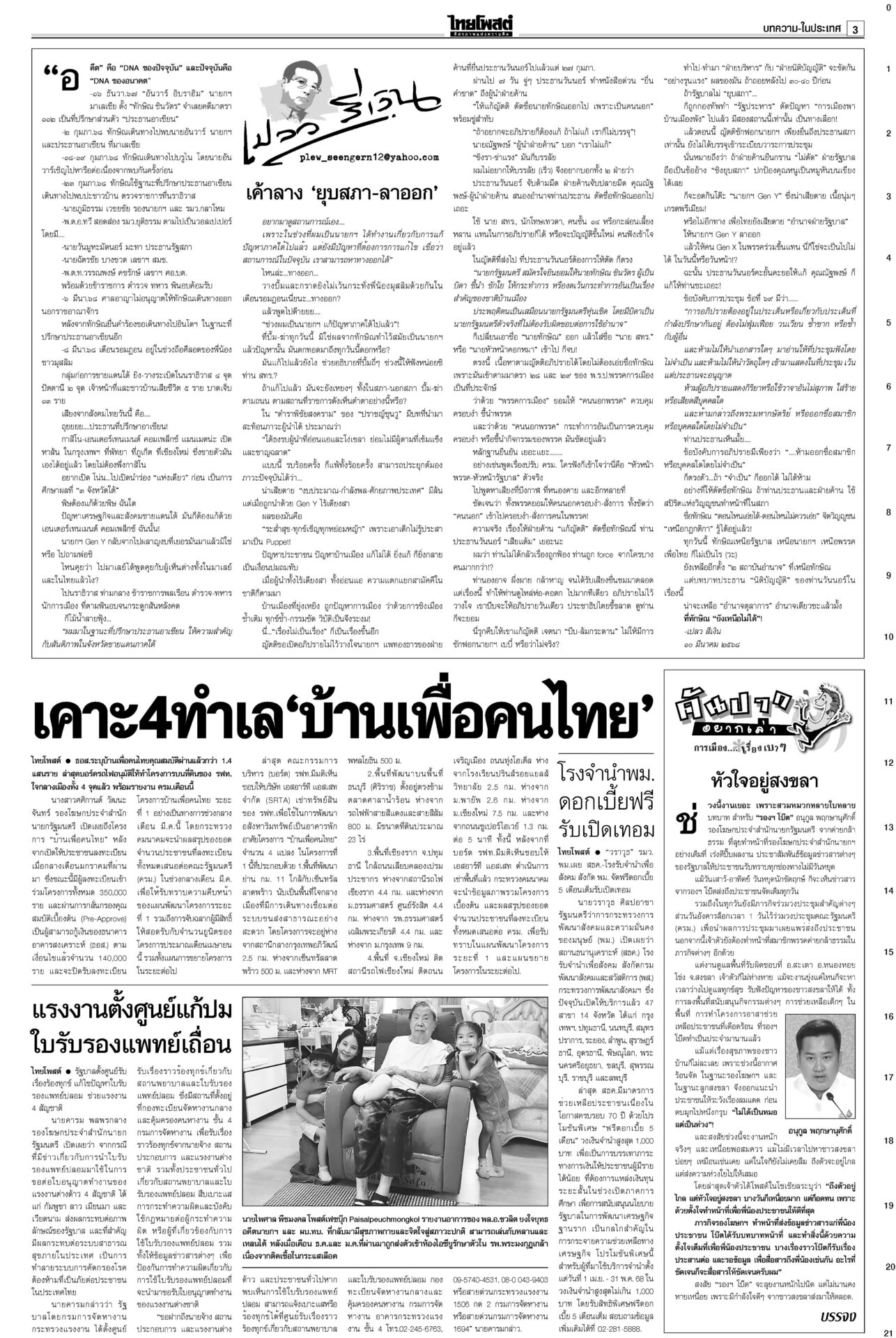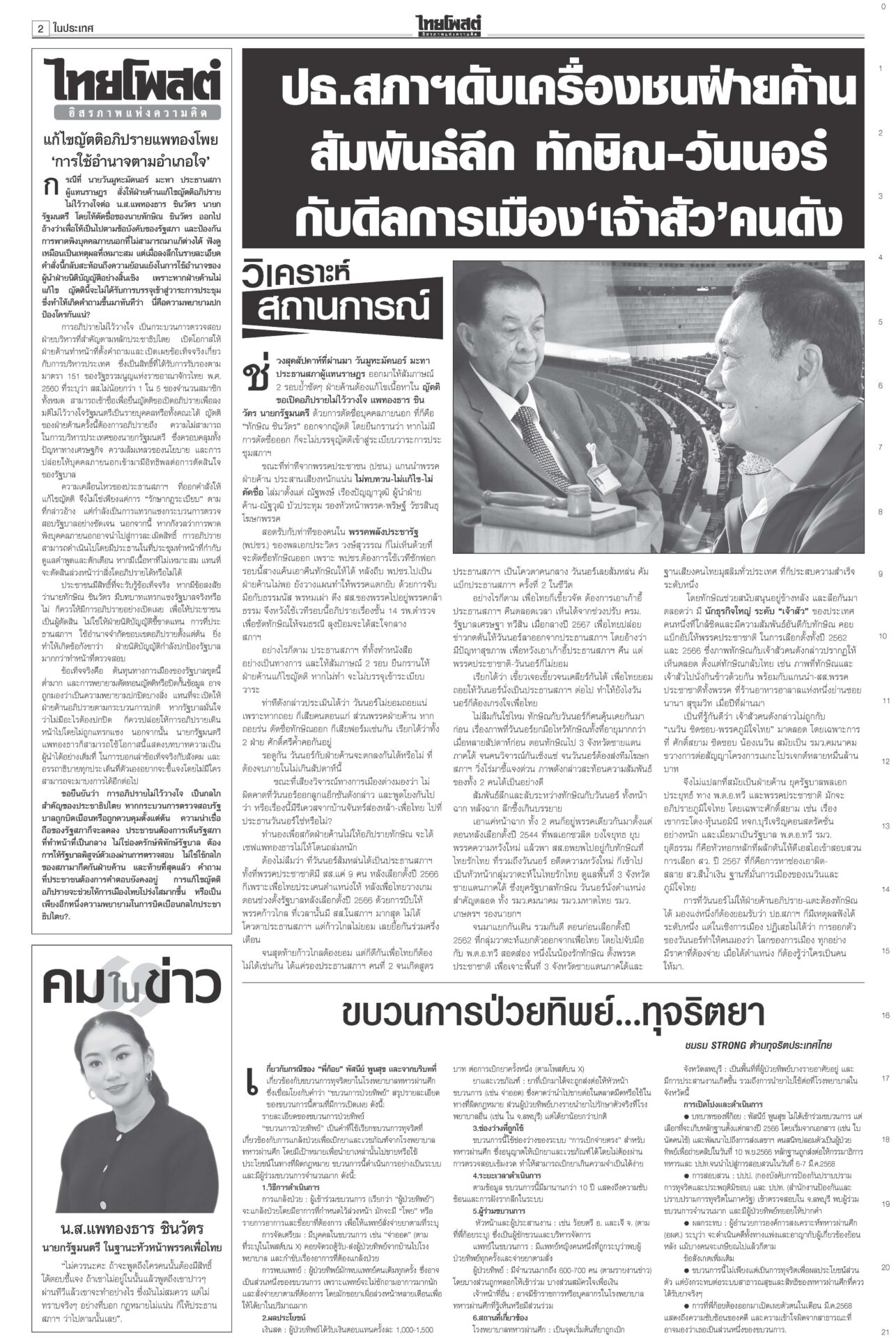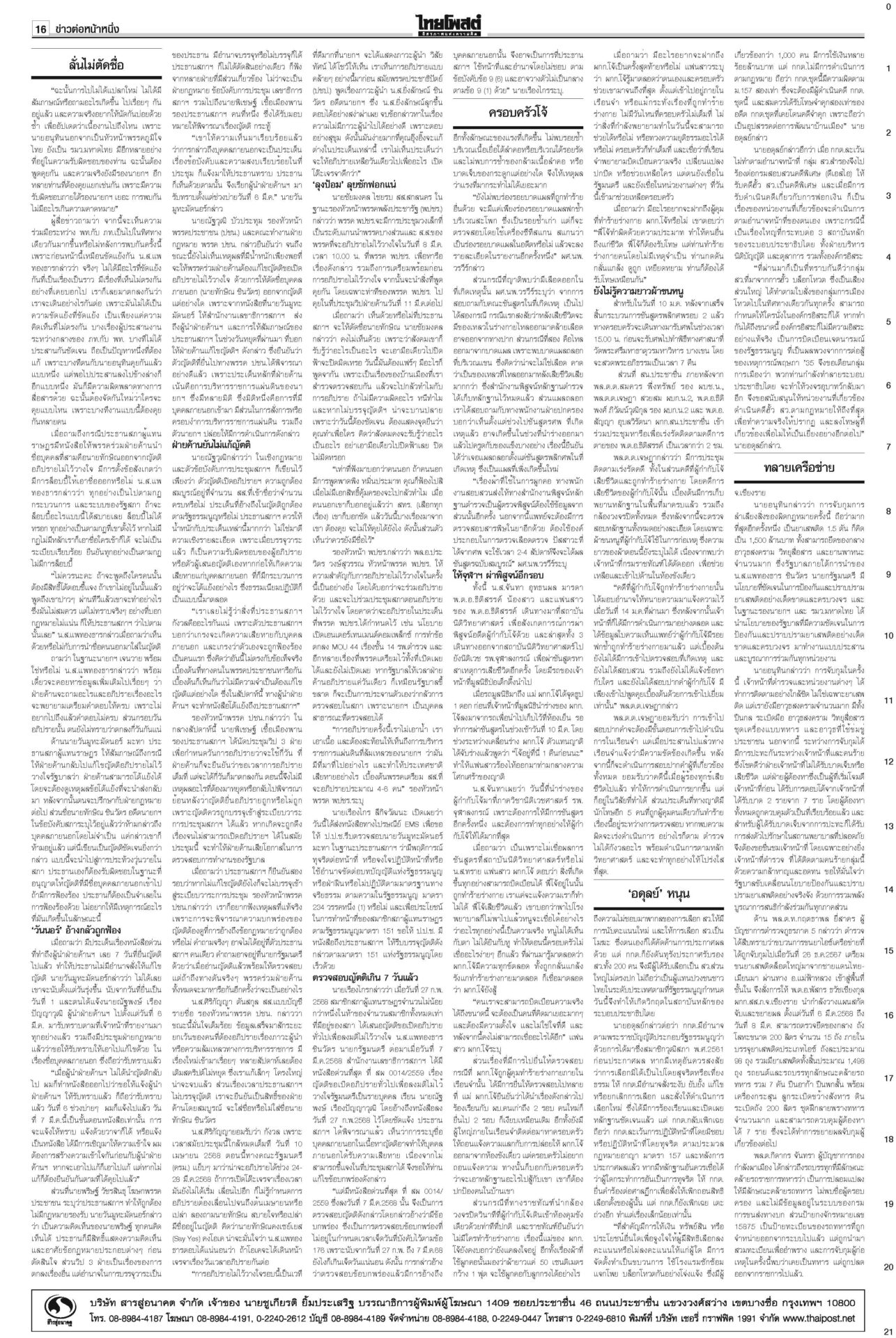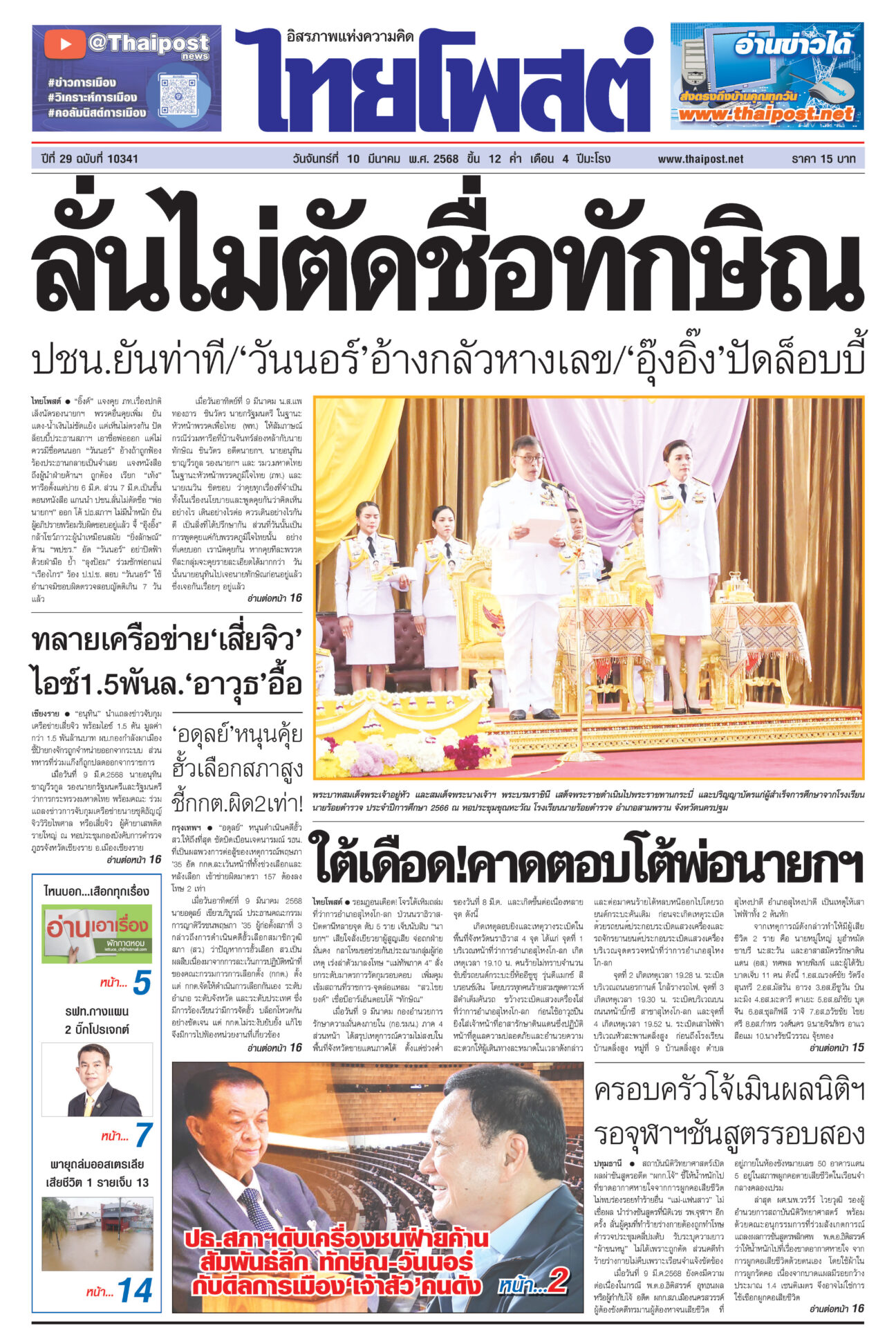 หนังสือพิมพ์ ฉบับวันที่ 10 มีนาคม 2568ข่าวหน้าหนึ่งลั่นไม่ตัดชื่อทักษิณ ปชน.ยันท่าที/‘วันนอร์’อ้างกลัวหางเลข/‘อุ๊งอิ๊ง’ปัดล็อบบี้“อิ๊งค์” แจงคุย ภท.เรื่องปกติ เล็งนัดรองนายกฯ พรรคอื่นคุยเพิ่ม ใต้เดือด!คาดตอบโต้พ่อนายกฯรอมฎอนเดือด! โจรใต้เหิมถล่มที่ว่าการอำเภอสุไหงโก-ลก ป่วนนราธิวาส-ปัตตานีหลายจุด ดับ 5 ราย ทลายเครือข่าย‘เสี่ยจิว’ ไอซ์1.5พันล.‘อาวุธ’อื้อ“อนุทิน” นำแถลงข่าวจับกุมเครือข่ายเสี่ยจิว พร้อมไอซ์ 1.5 ตัน มูลค่ากว่า 1.5 พันล้านบาท ‘อดุลย์’หนุนคุ้ย ฮั้วเลือกสภาสูง ชี้กกต.ผิด2เท่า!“อดุลย์” หนุนดำเนินคดีฮั้ว สว.ให้ถึงที่สุด ซัดบิดเบือนเจตนารมณ์ ครอบครัวโจ้เมินผลนิติฯ รอจุฬาฯชันสูตรรอบสองสถาบันนิติวิทยาศาสตร์เปิดผลผ่าชันสูตรอดีต “ผกก.โจ้” ชี้ให้น้ำหนักไปที่ขาดอากาศหายใจจากการผูกคอเสียชีวิต
