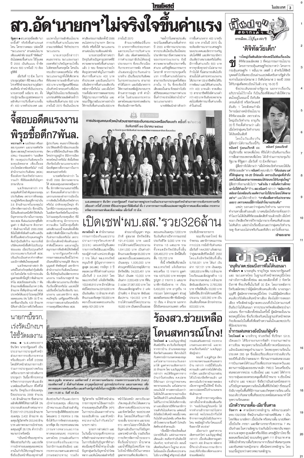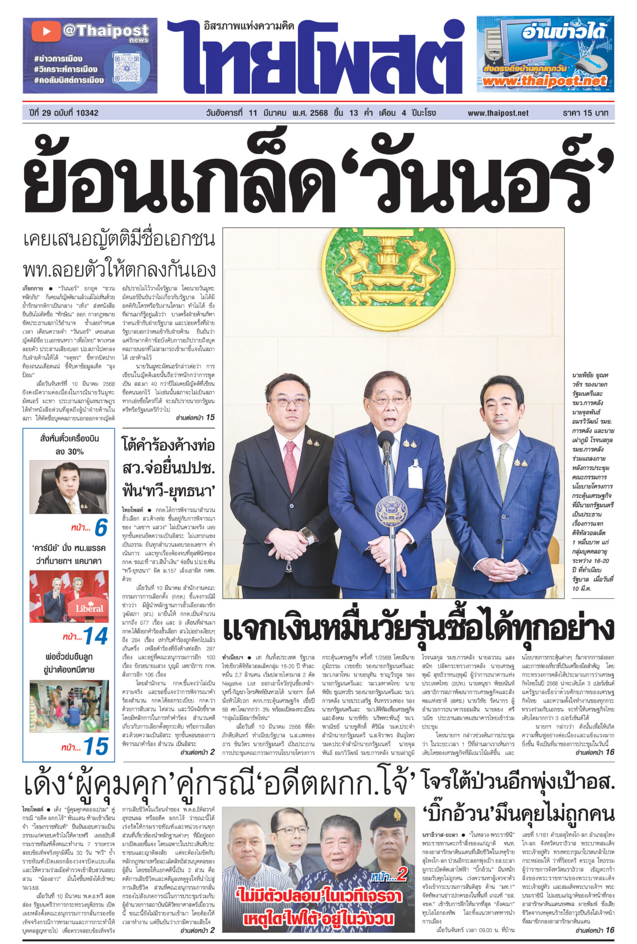 หนังสือพิมพ์ ฉบับวันที่ 11 มีนาคม 2568ข่าวหน้าหนึ่งย้อนเกล็ด‘วันนอร์’ เคยเสนอญัตติมีชื่อเอกชน พท.ลอยตัวให้ตกลงกันเอง“วันนอร์” ยกยุค “ชวน หลีกภัย” ก็เคยแก้ญัตติมาแล้วแม้ไม่เห็นด้วย แจกเงินหมื่นวัยรุ่นซื้อได้ทุกอย่างเฮ! กันทั้งประเทศ รัฐบาลไฟเขียวดิจิทัลวอลเล็ตกลุ่ม 16-20 ปี หัวละหมื่น 2.7 ล้านคน เด้ง‘ผู้คุมคุก’คู่กรณี‘อดีตผกก.โจ้’เด้ง “ผู้คุมคุกคลองเปรม” คู่กรณี “อดีต ผกก.โจ้” พ้นแดน-ห้ามเข้าเรือนจำ โจรใต้ป่วนอีกพุ่งเป้าอส. ‘บิ๊กอ้วน’มึนคุยไม่ถูกคน“ในหลวง-พระราชินี” พระราชทานตะกร้าสิ่งของแก่ญาติ จนท.กองอาสารักษาดินแดนที่เสียชีวิตในเหตุร้ายสุไหงโก-ลก โต้คำร้องค้างท่อ สว.จ่อยื่นปปช. ฟัน‘ทวี-ยุทธนา’กกต.โต้การพิจารณาสำนวนฮั้วเลือก สว. ค้างท่อ ขึ้นอยู่กับการพิจารณาของ “เลขาฯ แสวง” ไม่เป็นความจริง