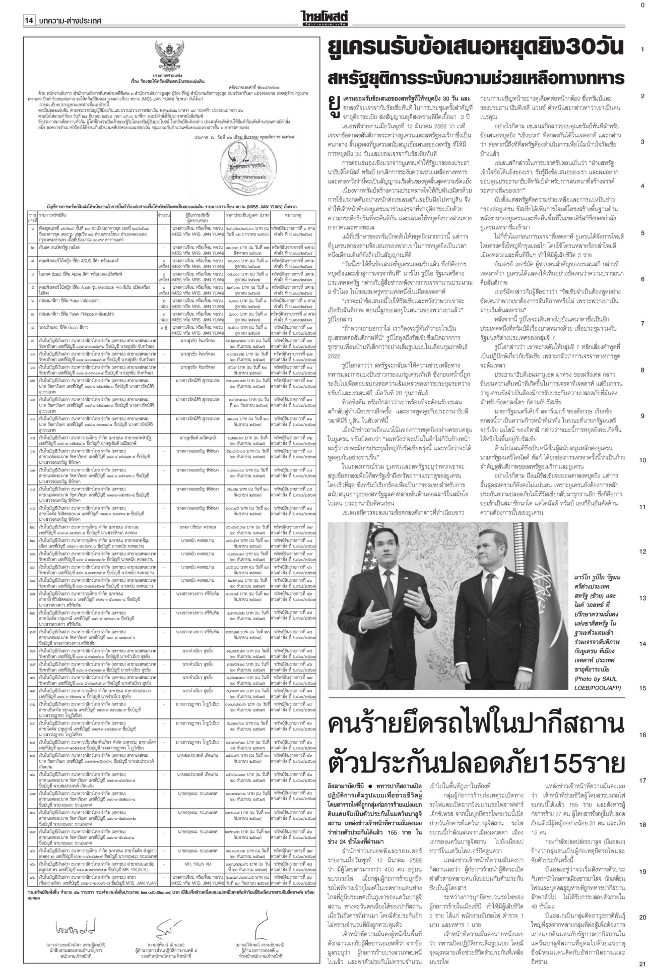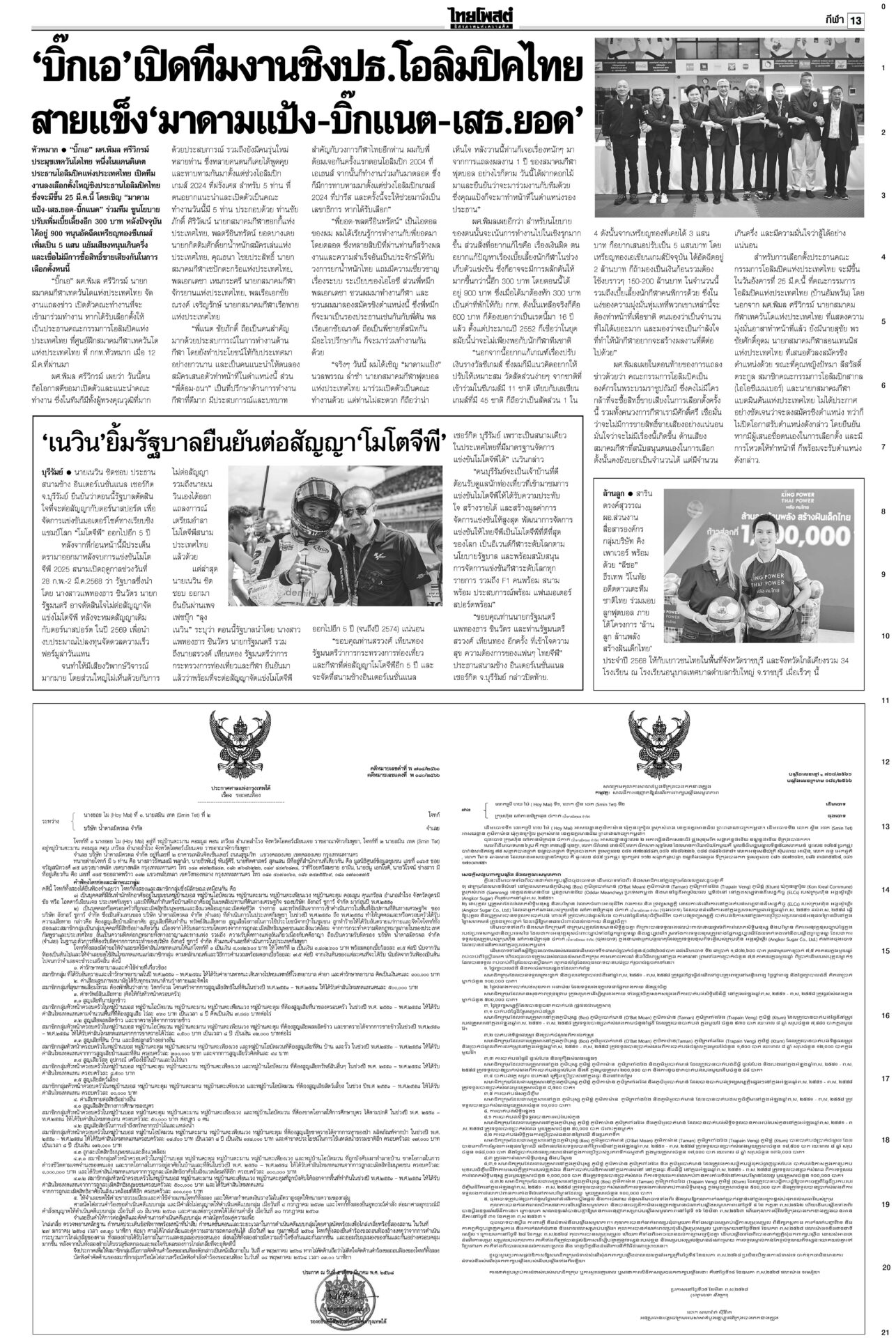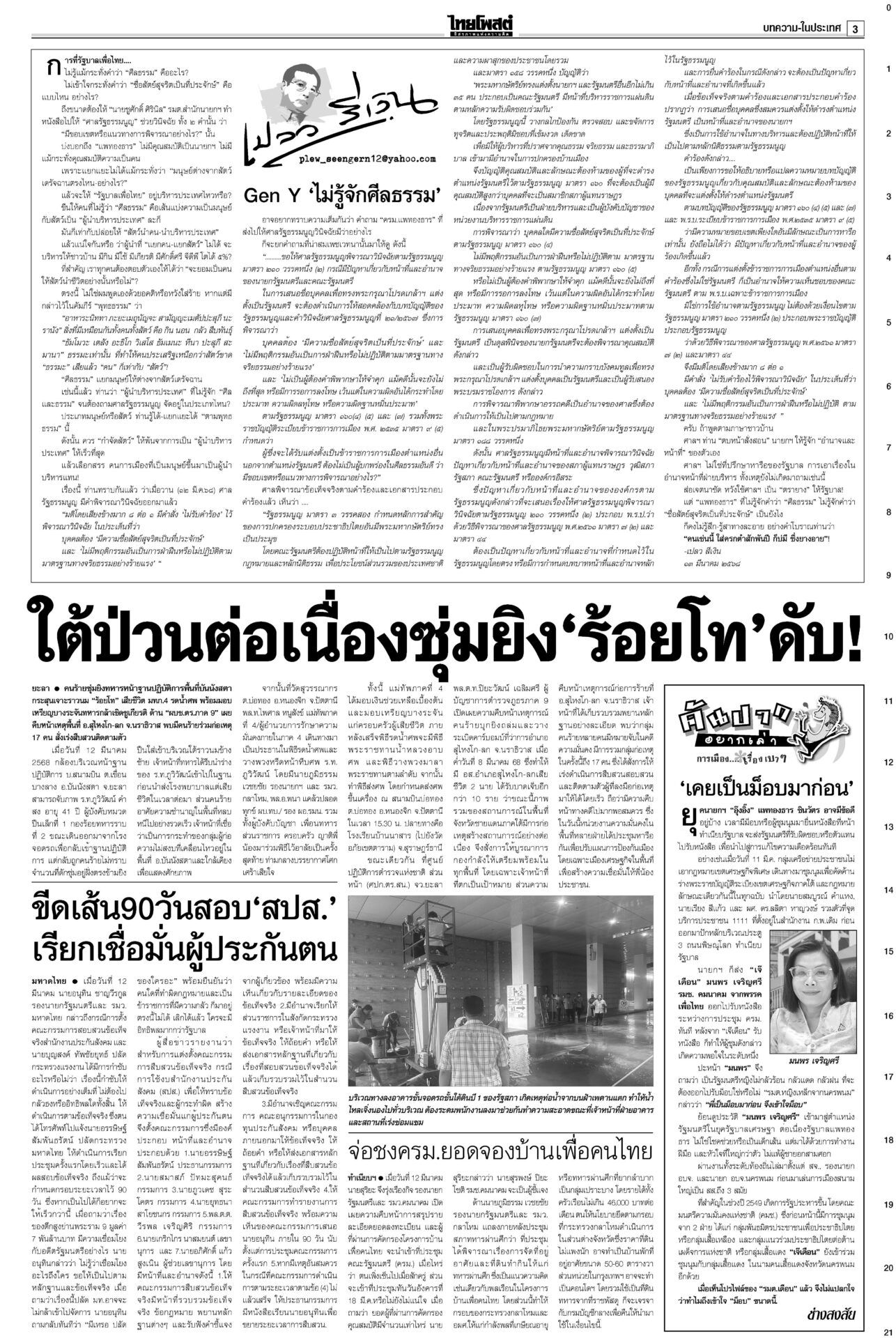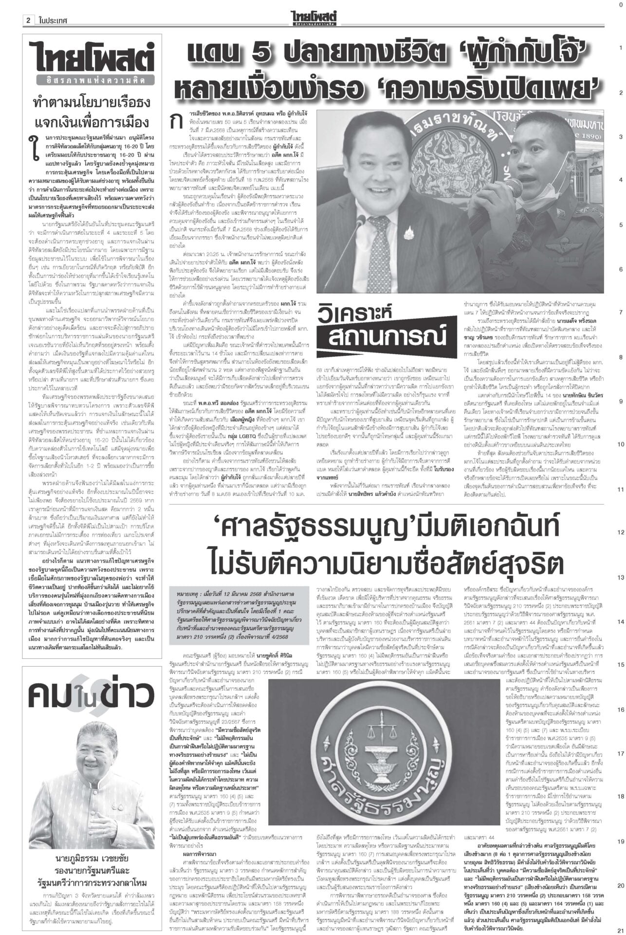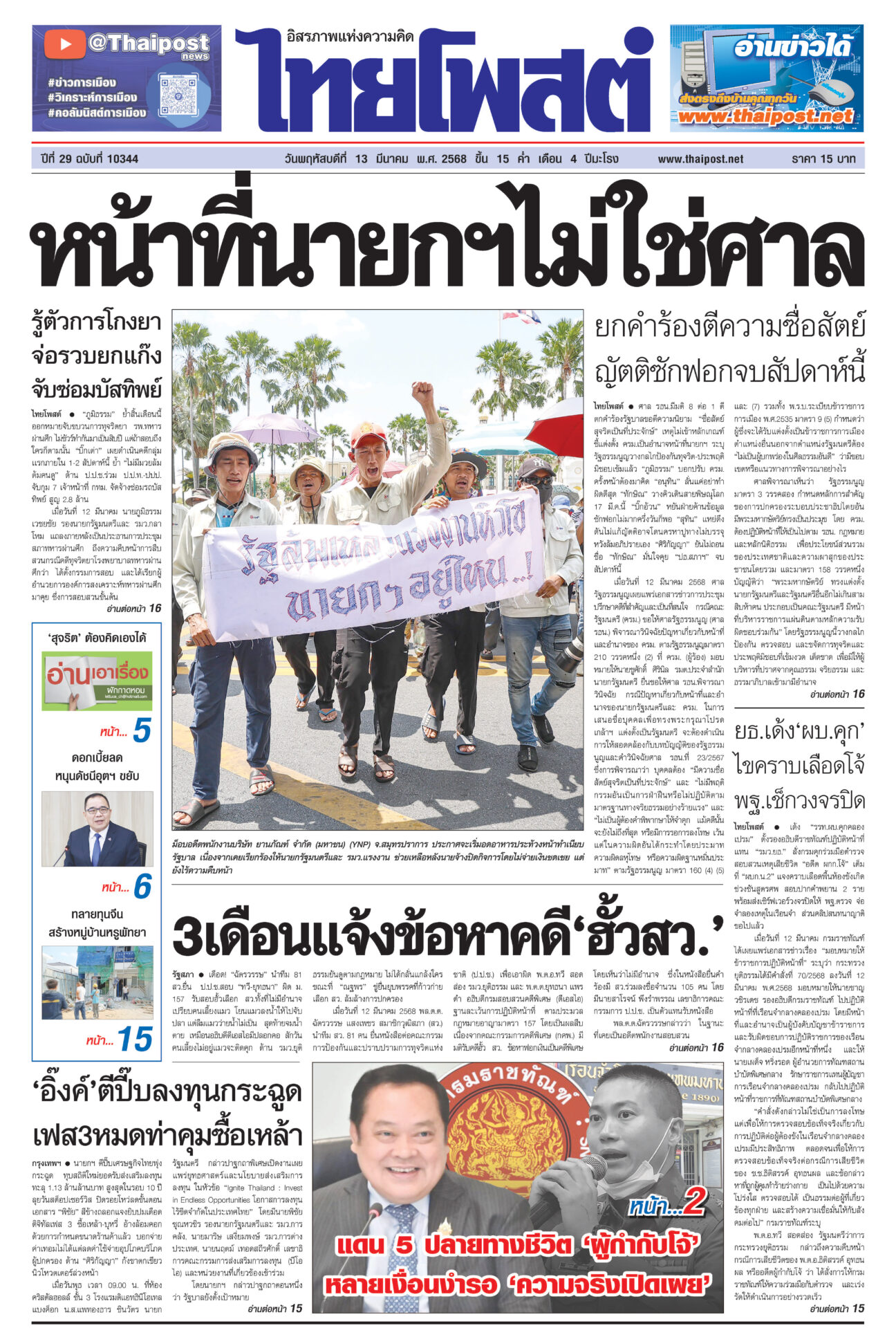 หนังสือพิมพ์ ฉบับวันที่ 13 มีนาคม 2568ข่าวหน้าหนึ่งหน้าที่นายกฯไม่ใช่ศาล ยกคำร้องตีความซื่อสัตย์ ญัตติซักฟอกจบสัปดาห์นี้ศาล รธน.มีมติ 8 ต่อ 1 ตีตกคำร้องรัฐบาลขอตีความนิยาม “ซื่อสัตย์สุจริตเป็นที่ประจักษ์” เหตุไม่เข้าหลักเกณฑ์ รู้ตัวการโกงยา จ่อรวบยกแก๊ง จับซ่อมบัสทิพย์“ภูมิธรรม” ย้ำสิ้นเดือนนี้ออกหมายจับขบวนการทุจริตยา รพ.ทหารผ่านศึก ‘อิ๊งค์’ตีปี๊บลงทุนกระฉูด เฟส3หมดท่าคุมซื้อเหล้านายกฯ ตีปี๊บเศรษฐกิจไทยพุ่งกระฉูด ทุบสถิติใหม่ยอดรับส่งเสริมลงทุนทะลุ 1.13 ล้านล้านบาท 3เดือนแจ้งข้อหาคดี‘ฮั้วสว.’เดือด! “ฉัตรวรรษ” นำทีม 81 สว.ยื่น ป.ป.ช.สอบ “ทวี-ยุทธนา” ผิด ม.157 ยธ.เด้ง‘ผบ.คุก’ ไขคราบเลือดโจ้ พฐ.เช็กวงจรปิดเด้ง “รรท.ผบ.คุกคลองเปรม” ตั้งรองอธิบดีราชทัณฑ์ปฏิบัติหน้าที่แทน
