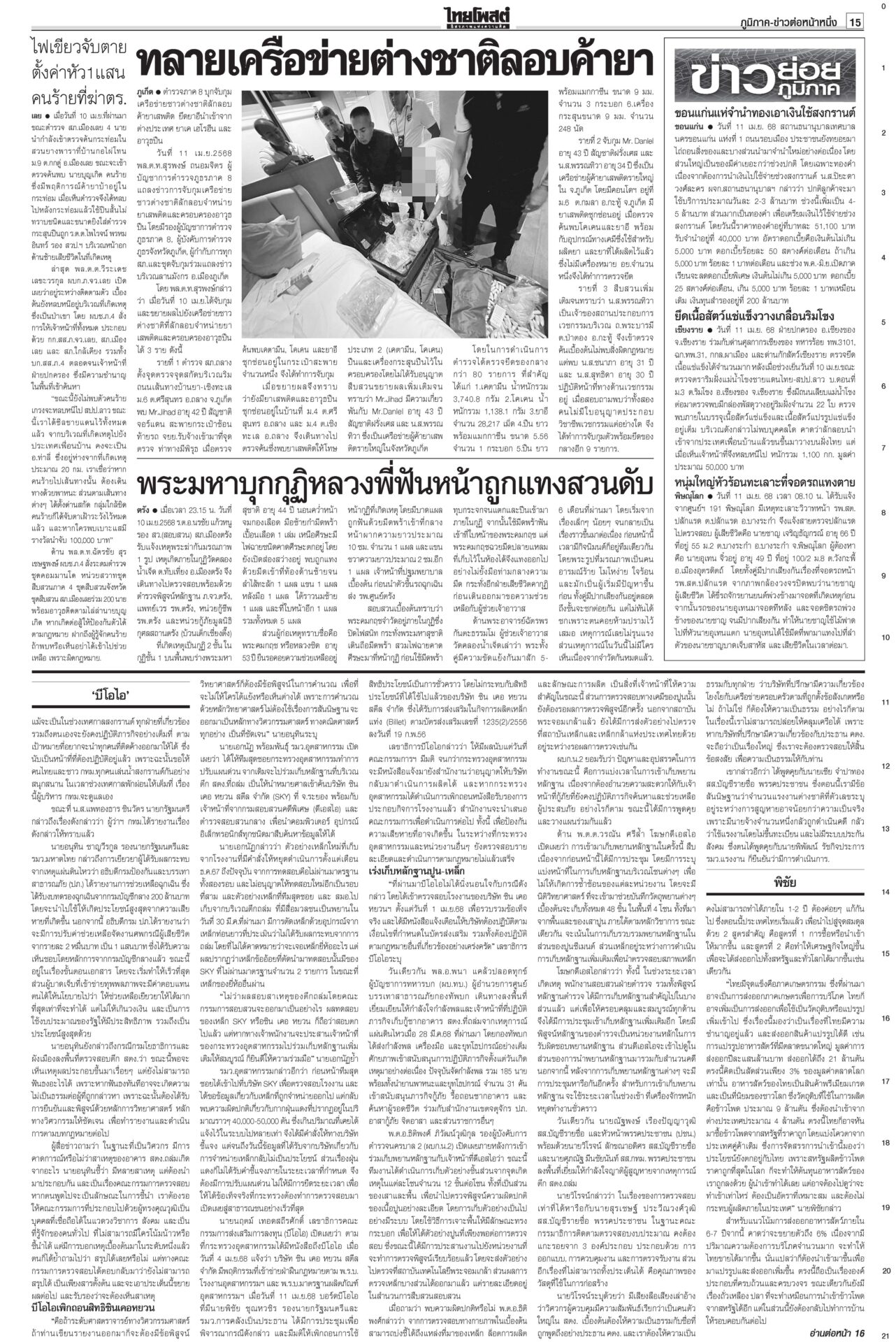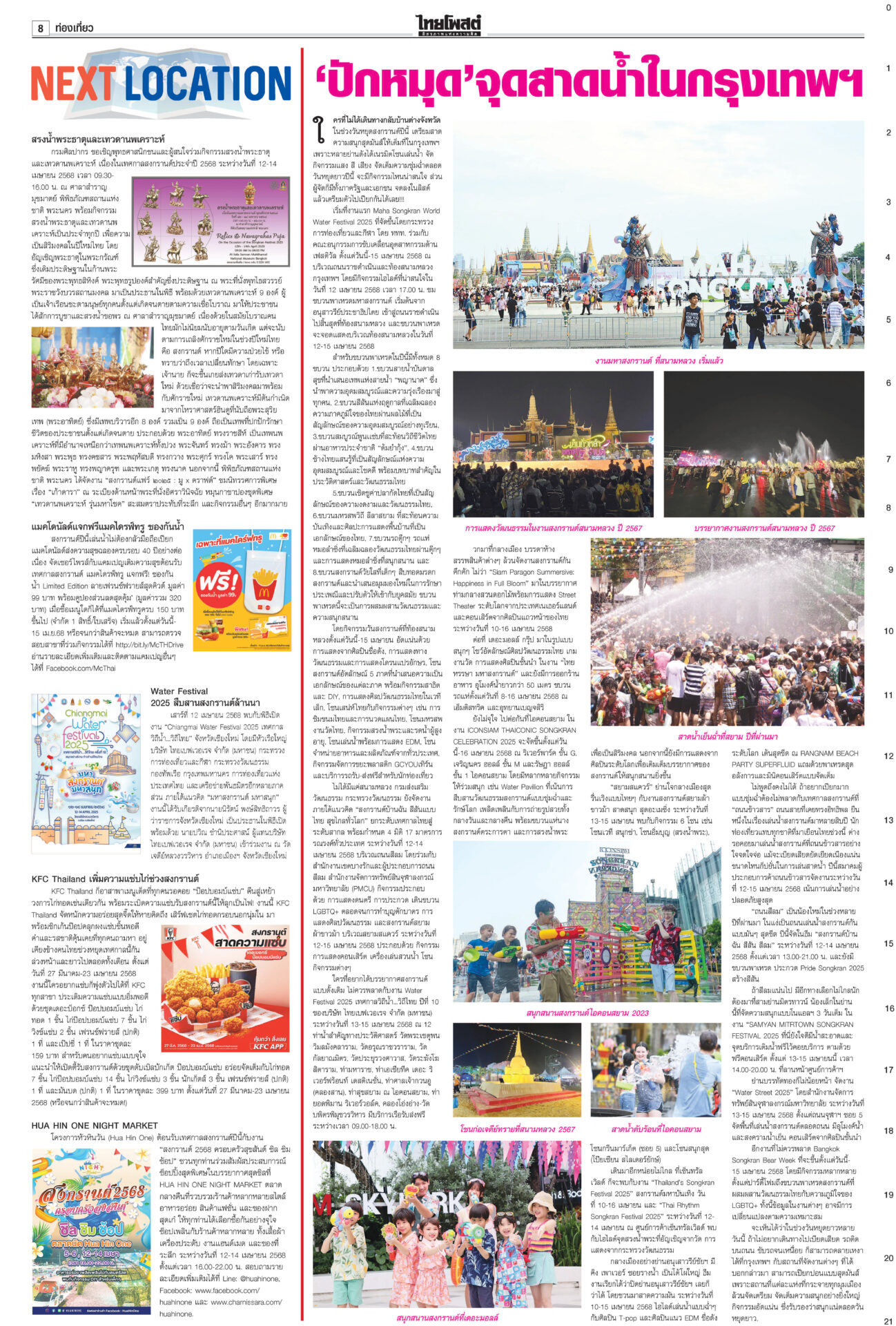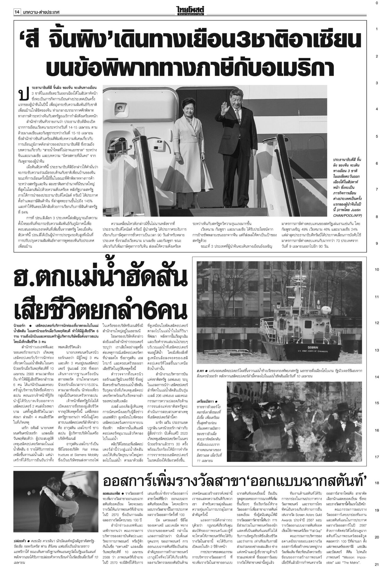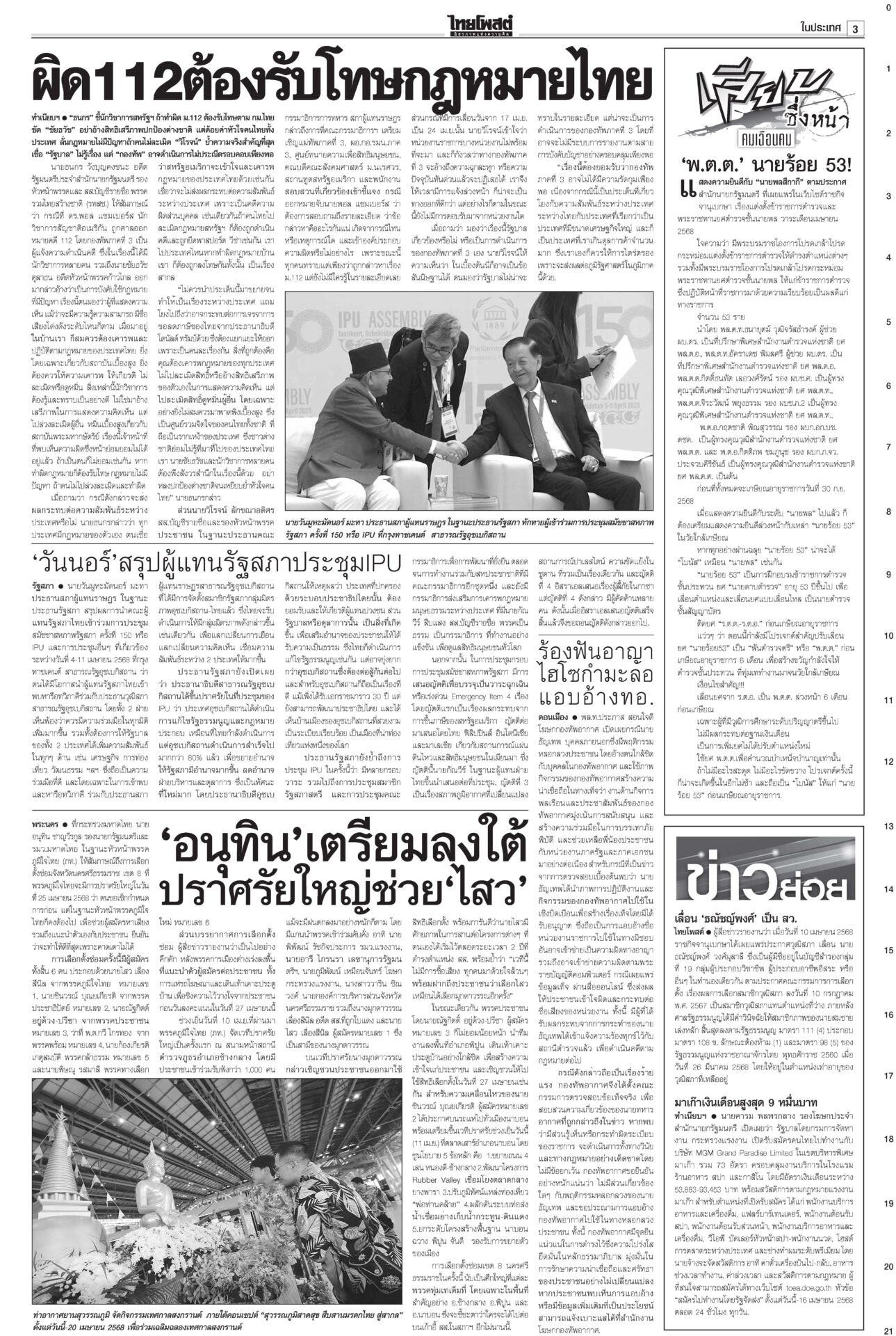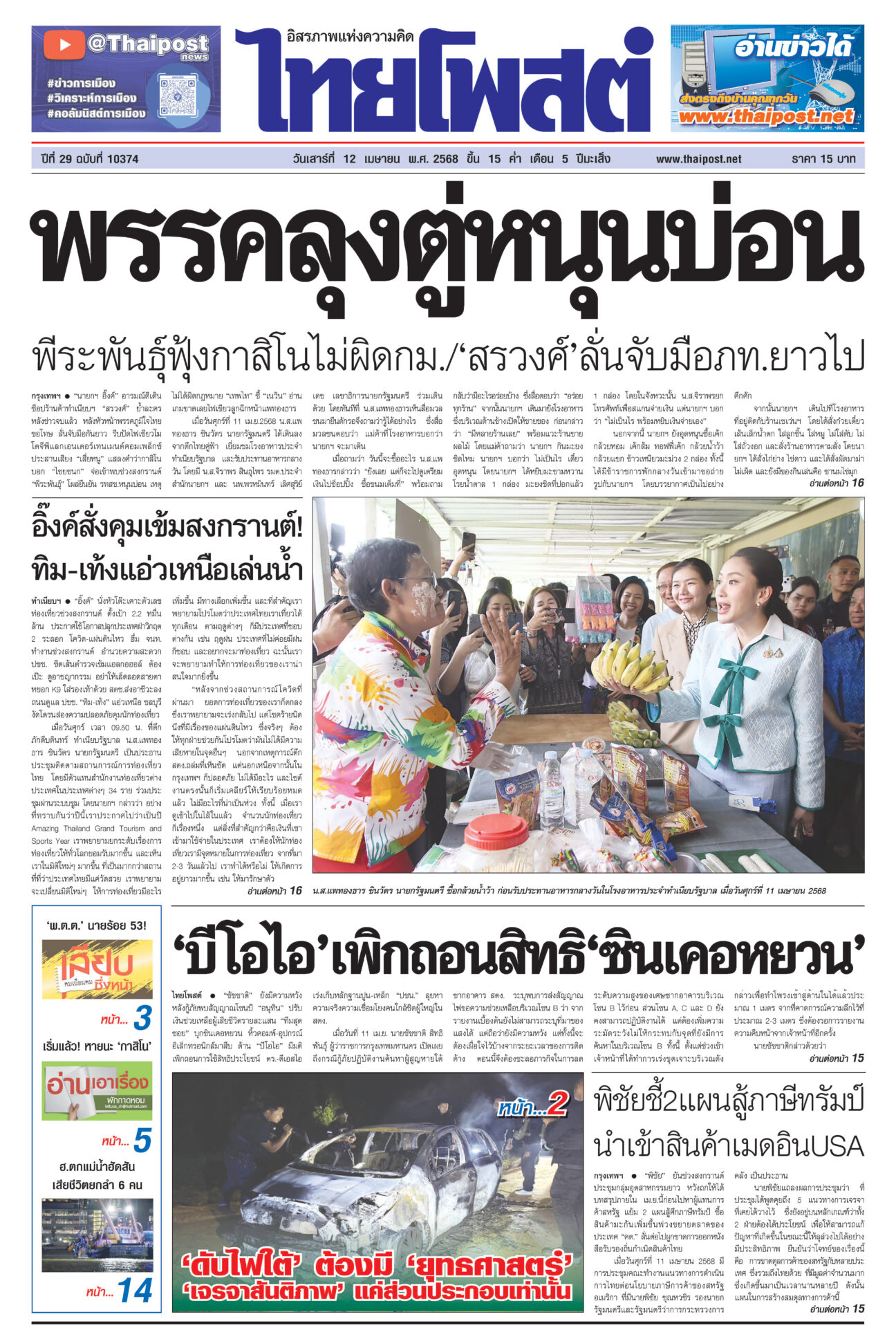 หนังสือพิมพ์ ฉบับวันที่ 12 เมษายน 2568ข่าวหน้าหนึ่งพรรคลุงตู่หนุนบ่อน พีระพันธุ์ฟุ้งกาสิโนไม่ผิดกม./‘สรวงศ์’ลั่นจับมือภท.ยาวไป“นายกฯ อิ๊งค์” อารมณ์ดีเดินช็อปร้านค้าทำเนียบฯ “สรวงศ์” ย้ำละครหลังข่าวจบแล้ว ‘บีโอไอ’เพิกถอนสิทธิ‘ซินเคอหยวน’“ชัชชาติ” ยังมีความหวัง หลังกู้ภัยพบสัญญาณโซนบี “อนุทิน” ปรับเงินช่วยเหลือผู้เสียชีวิตรายละแสน “ทีมสุดซอย” อิ๊งค์สั่งคุมเข้มสงกรานต์! ทิม-เท้งแอ่วเหนือเล่นน้ำ“อิ๊งค์” นั่งหัวโต๊ะเคาะตัวเลขท่องเที่ยวช่วงสงกรานต์ ตั้งเป้า 2.2 หมื่นล้าน พิชัยชี้2แผนสู้ภาษีทรัมป์ นำเข้าสินค้าเมดอินUSA“พิชัย” ยันช่วงสงกรานต์ประชุมกลุ่มอุตสาหกรรมยาว หวังถกให้ได้บทสรุปภายใน เม.ย.นี้