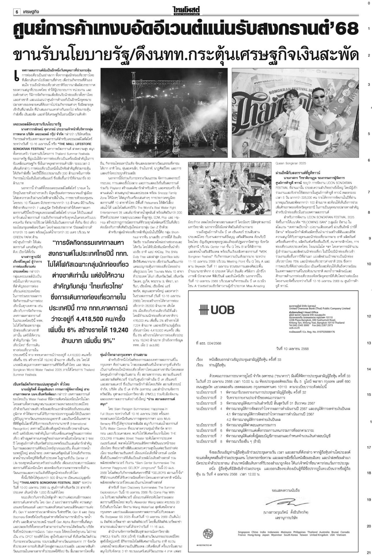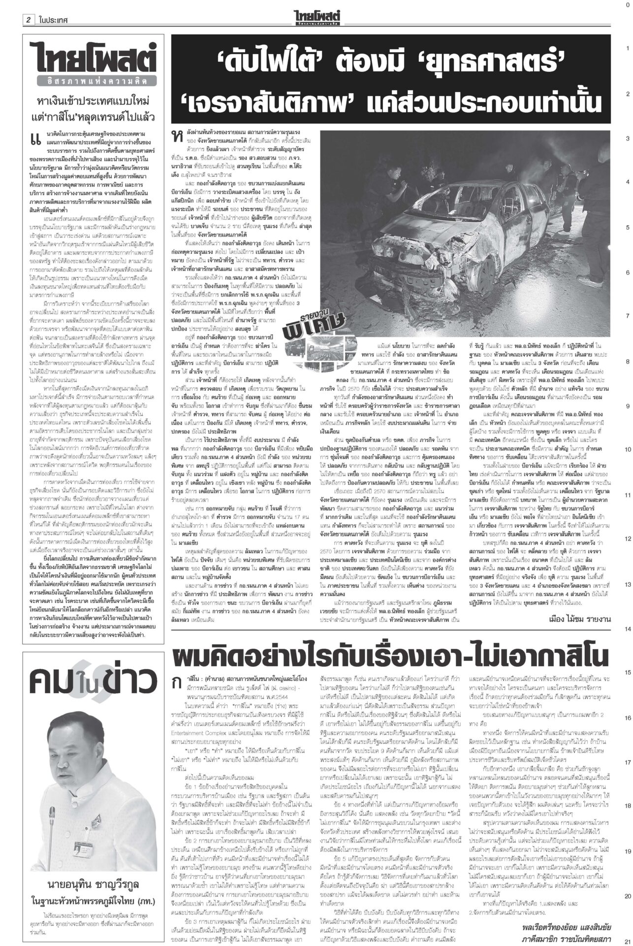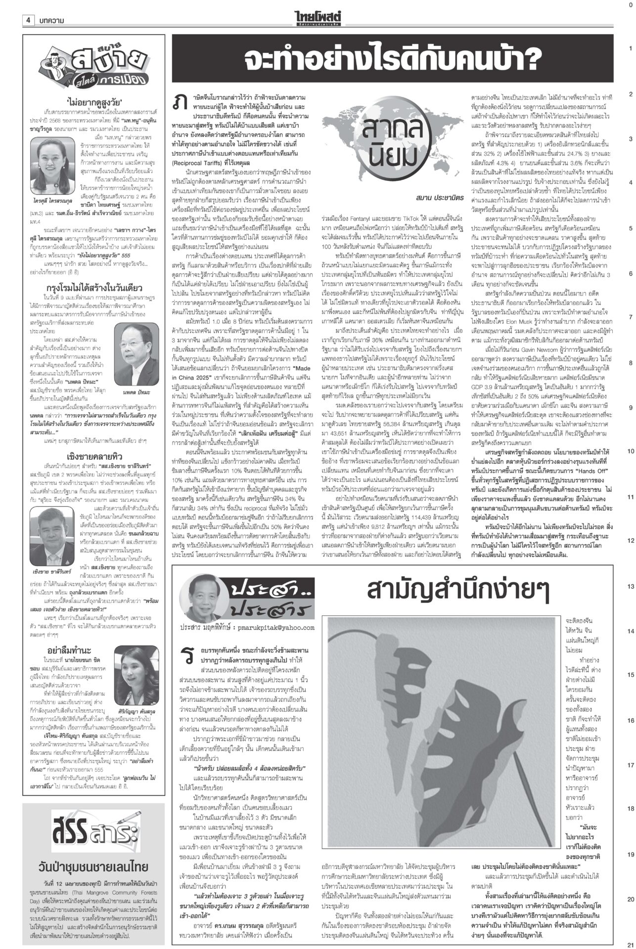 ฉบับวันที่ 12 เมษายน 2568 12 เมษายน 2568 เวลา 0:01 น. หนังสือพิมพ์ ฉบับวันที่ 12 เมษายน 2568ข่าวหน้าหนึ่งพรรคลุงตู่หนุนบ่อน พีระพันธุ์ฟุ้งกาสิโนไม่ผิดกม./‘สรวงศ์’ลั่นจับมือภท.ยาวไป“นายกฯ อิ๊งค์” อารมณ์ดีเดินช็อปร้านค้าทำเนียบฯ “สรวงศ์” ย้ำละครหลังข่าวจบแล้ว ‘บีโอไอ’เพิกถอนสิทธิ‘ซินเคอหยวน’“ชัชชาติ” ยังมีความหวัง หลังกู้ภัยพบสัญญาณโซนบี “อนุทิน” ปรับเงินช่วยเหลือผู้เสียชีวิตรายละแสน “ทีมสุดซอย” อิ๊งค์สั่งคุมเข้มสงกรานต์! ทิม-เท้งแอ่วเหนือเล่นน้ำ“อิ๊งค์” นั่งหัวโต๊ะเคาะตัวเลขท่องเที่ยวช่วงสงกรานต์ ตั้งเป้า 2.2 หมื่นล้าน พิชัยชี้2แผนสู้ภาษีทรัมป์ นำเข้าสินค้าเมดอินUSA“พิชัย” ยันช่วงสงกรานต์ประชุมกลุ่มอุตสาหกรรมยาว หวังถกให้ได้บทสรุปภายใน เม.ย.นี้ Tagsรายวันหนังสือพิมพ์ ข่าวที่เกี่ยวข้อง ฉบับวันที่ 6 ธันวาคม 2568 ฉบับวันที่ 5 ธันวาคม 2568 ฉบับวันที่ 4 ธันวาคม 2568 ฉบับวันที่ 3 ธันวาคม 2568 ฉบับวันที่ 2 ธันวาคม 2568 ฉบับวันที่ 1 ธันวาคม 2568 NEWS UPDATE 0:01 น. หาดใหญ่-สแกมเมอร์ทำรบ.'แต้มหล่น' 'อนุทิน'เปิดหน้าชนกู้เรตติ้ง 21:16 น. จนท.ปกครองเดินฝ่าดงหนาม 4 กม. จับหนุ่มซุกยาบ้าในรูปู 126 เม็ด 20:58 น. ชาวบ้านริมน้ำสาละวิน มึนข้อมูลราชการสุดสับสน ไม่แน่ใจปลา-พืชริมน้ำกินได้หรือไม่ 19:07 น. ลมหนาวมาอีกระลอก! กรมอุตุฯ พยากรณ์อากาศ 7 วันข้างหน้า อุณหภูมิจะลดลง 2-4 องศา 19:05 น. ภัยพิบัติสแกมเมอร์ | ห้องข่าวไทยโพสต์สุดสัปดาห์