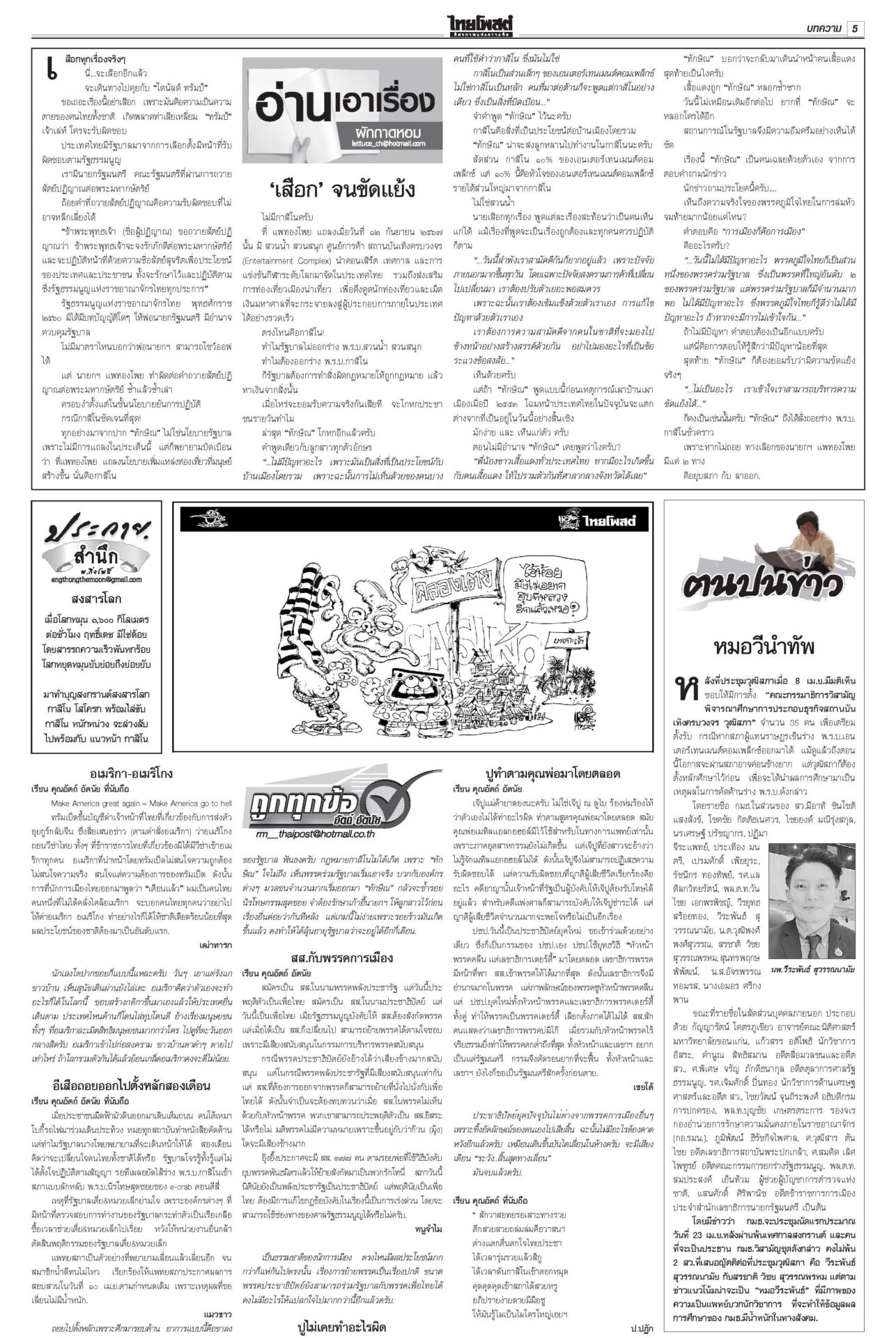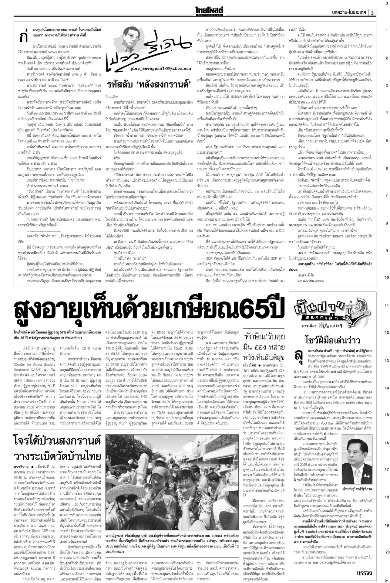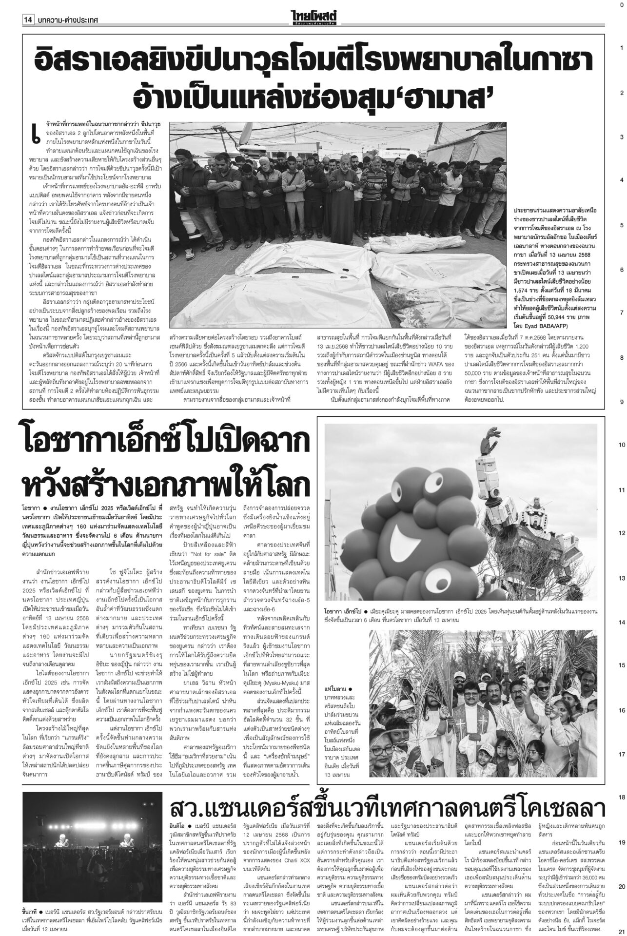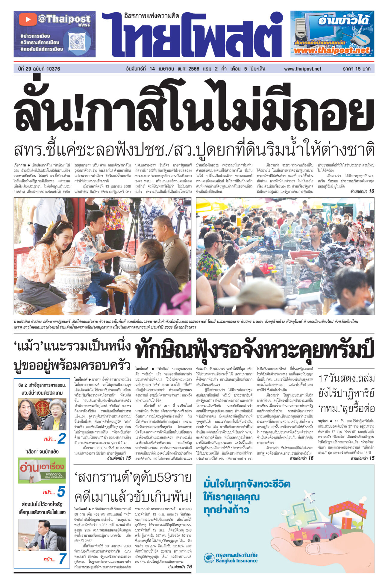 หนังสือพิมพ์ ฉบับวันที่ 14 เมษายน 2568ข่าวหน้าหนึ่งลั่น!กาสิโนไม่มีถอย สทร.ชี้แค่ชะลอฟังปชช./สว.ปูดยกที่ดินริมนํ้าให้ต่างชาติเปิดบ่อนกาสิโน “ทักษิณ” ไม่ถอย อ้างเป็นสิ่งที่เป็นประโยชน์กับบ้านเมือง จวกพวกบิดเบือน ทักษิณฟุ้งรอจังหวะคุยทรัมป์“ทักษิณ” บอกคุยคนรอบตัว “ทรัมป์” แล้ว วอนอย่ากีดกันการค้าประเทศกำลังพัฒนา ‘แม้ว’แนะรวมเป็นหนึ่ง ปูขออยู่พร้อมครอบครัวนายกฯ อิ๊งค์กล่าวอวยพรเนื่องในโอกาสสงกรานต์ ขอให้ทุกคนมีความสุข ‘สงกรานต์’ดุดับ59ราย คดีเมาแล้วขับเกินพัน!2 วันอันตรายดับรับสงกรานต์ 59 ราย เจ็บ 458 คน กทม.แชมป์ “ทวี” ขึงขังกำชับใช้กฎหมายเข้มข้น กรมคุมประพฤติเผยมีคดีกว่า 1,037 คดี 17วันสตง.ถล่ม ยังไร้ปาฏิหาริย์ ‘กทม.’ลุยรื้อต่อ17 วัน สตง.ไร้ปาฏิหาริย์เพิ่ม กทม.สรุปยอดเสียชีวิต 37 ราย อยู่ระหว่างค้นหาอีก 57 ราย