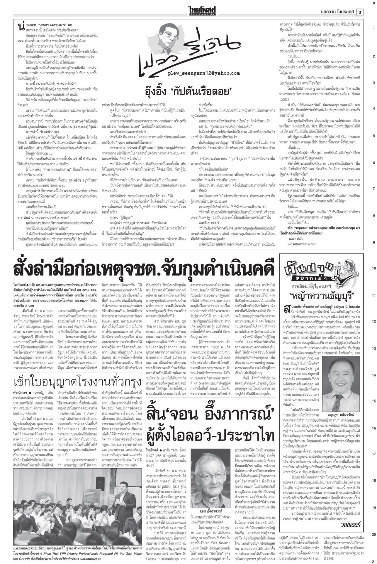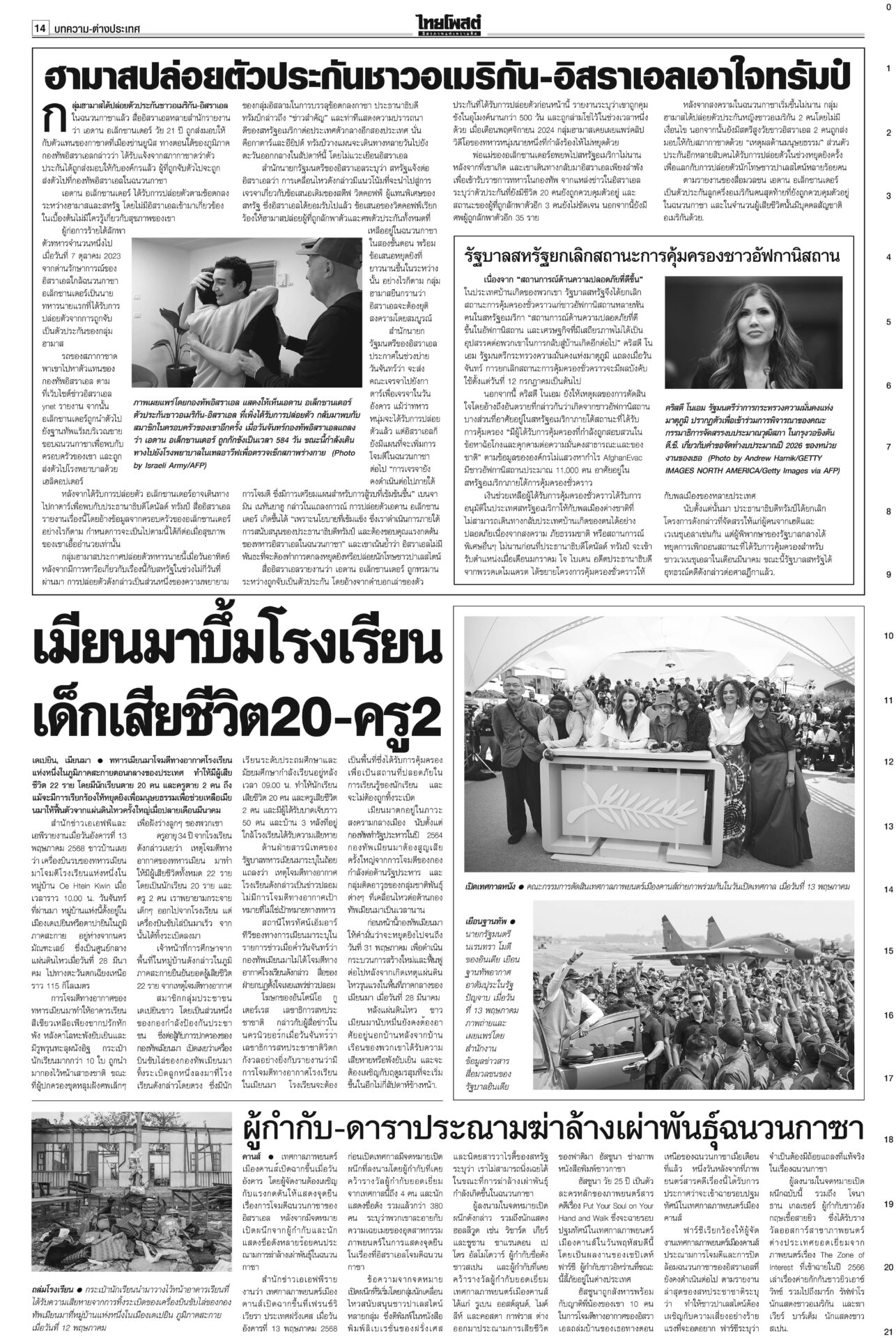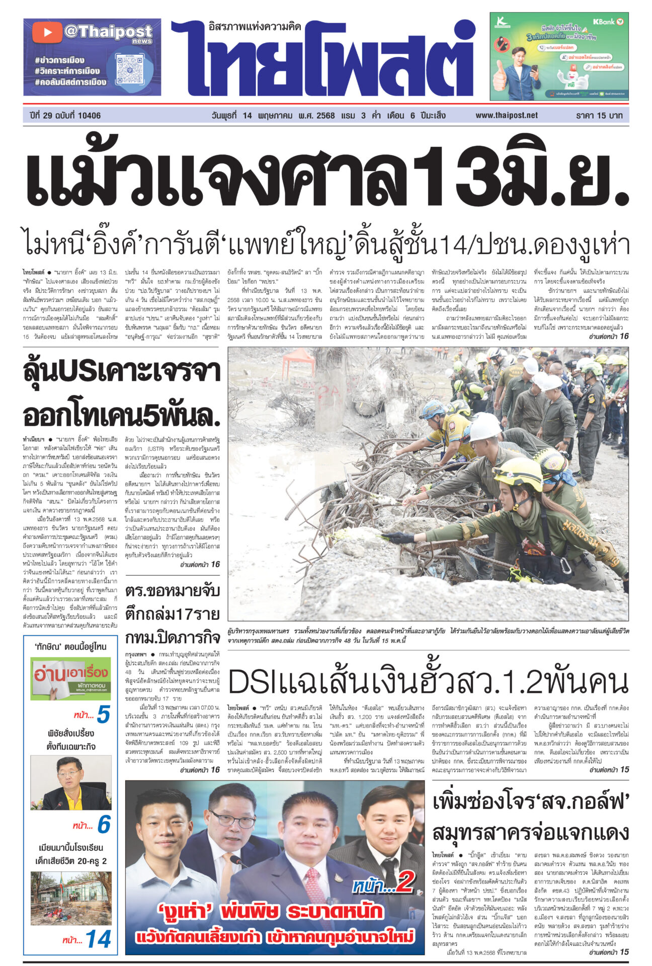 หนังสือพิมพ์ ฉบับวันที่ 14 พฤษภาคม 2568ข่าวหน้าหนึ่งแม้วแจงศาล13มิ.ย. ไม่หนี‘อิ๊งค์’การันตี‘แพทย์ใหญ่’ดิ้นสู้ชั้น14/ปชน.ดองงูเห่า“นายกฯ อิ๊งค์” เผย 13 มิ.ย. “ทักษิณ” ไปแจงศาลเอง เสียงแข็งพ่อป่วยจริง ลุ้นUSเคาะเจรจา ออกโทเคน5พันล.“นายกฯ อิ๊งค์” พ้อไทยเสียโอกาส! หลังศาลไม่ไฟเขียวให้ “พ่อ” เดินทางไปกาตาร์พบทรัมป์ DSIแฉเส้นเงินฮั้วสว.1.2พันคน“ทวี” เหน็บ สว.คนมีเกียรติ ต้องให้เกียรติคนอื่นก่อน ยันทำคดีฮั้ว สว.ไม่กระทบสัมพันธ์ รมต. เพิ่มซ่องโจร‘สจ.กอล์ฟ’ สมุทรสาครจ่อแจกแดง“บิ๊กอู๊ด” เข้าเยี่ยม “ดาบตำรวจ” หลังถูก “สจ.กอล์ฟ” ทำร้าย ยันคนผิดต้องไม่มีที่ยืนในสังคม ตร.แจ้งเพิ่มข้อหาซ่องโจร ตร.ขอหมายจับ ตึกถล่ม17ราย กทม.ปิดภารกิจกทม.ทำบุญอุทิศส่วนกุศลให้ผู้ประสบภัยตึก สตง.ถล่ม ก่อนปิดฉากภารกิจ 48 วัน