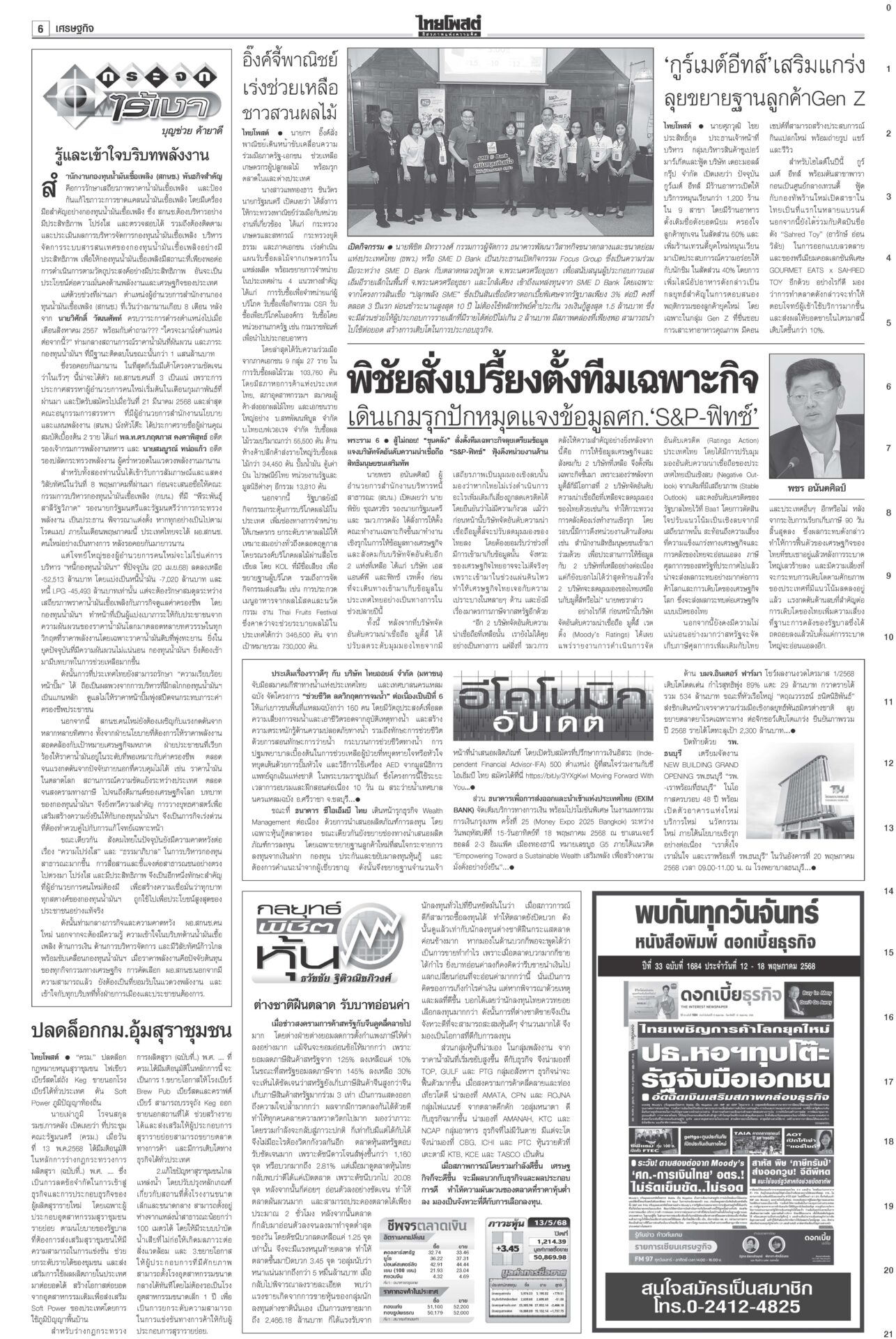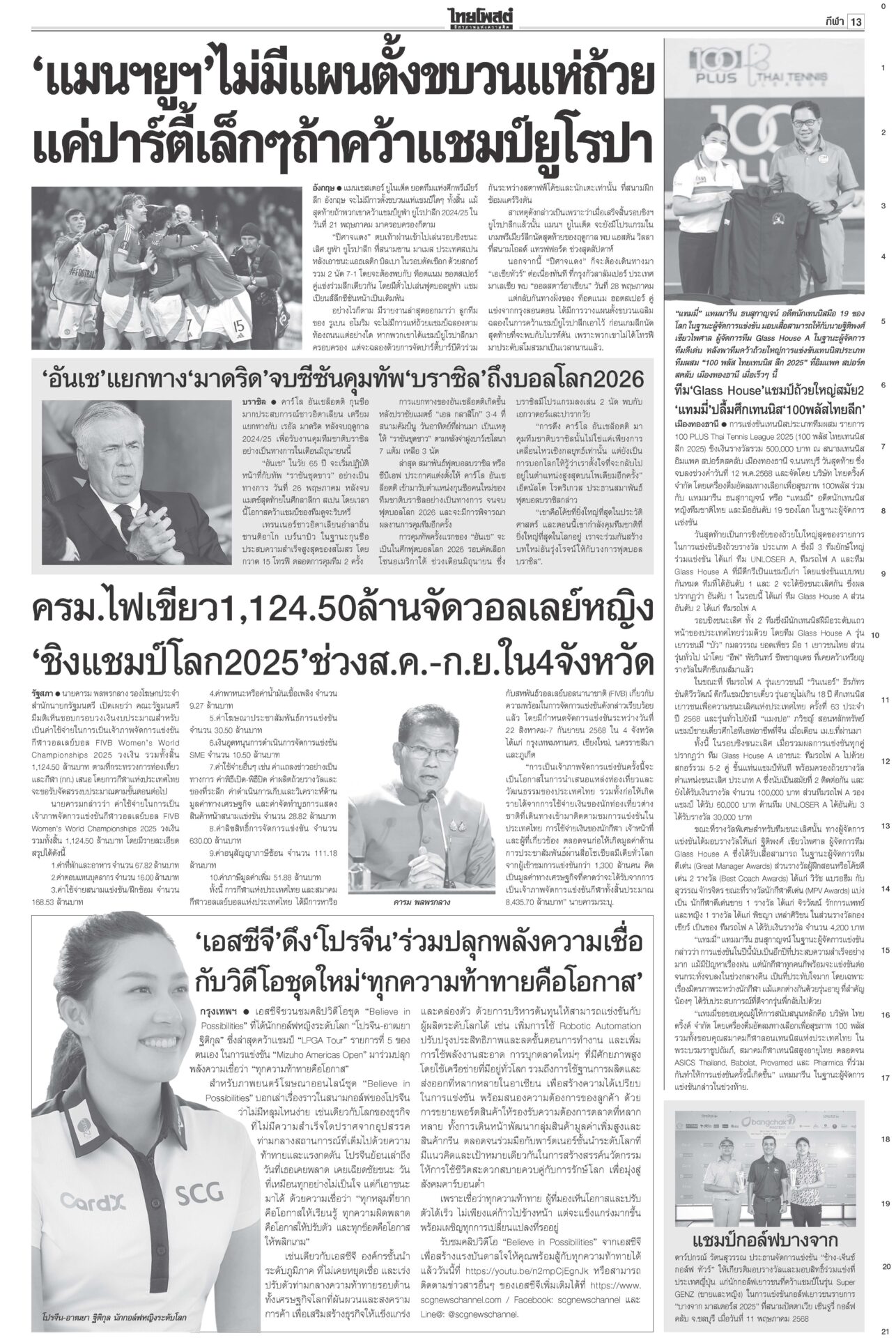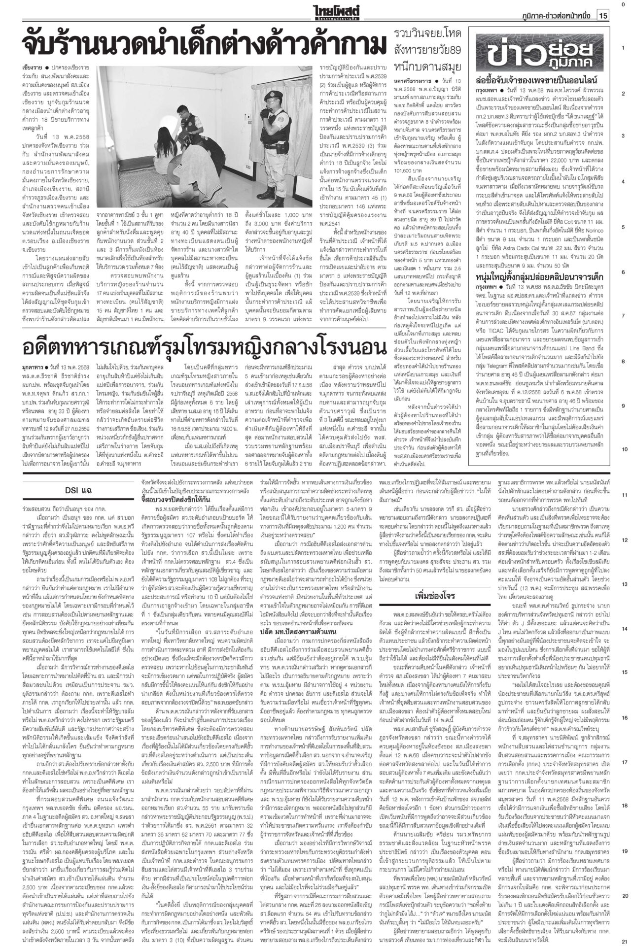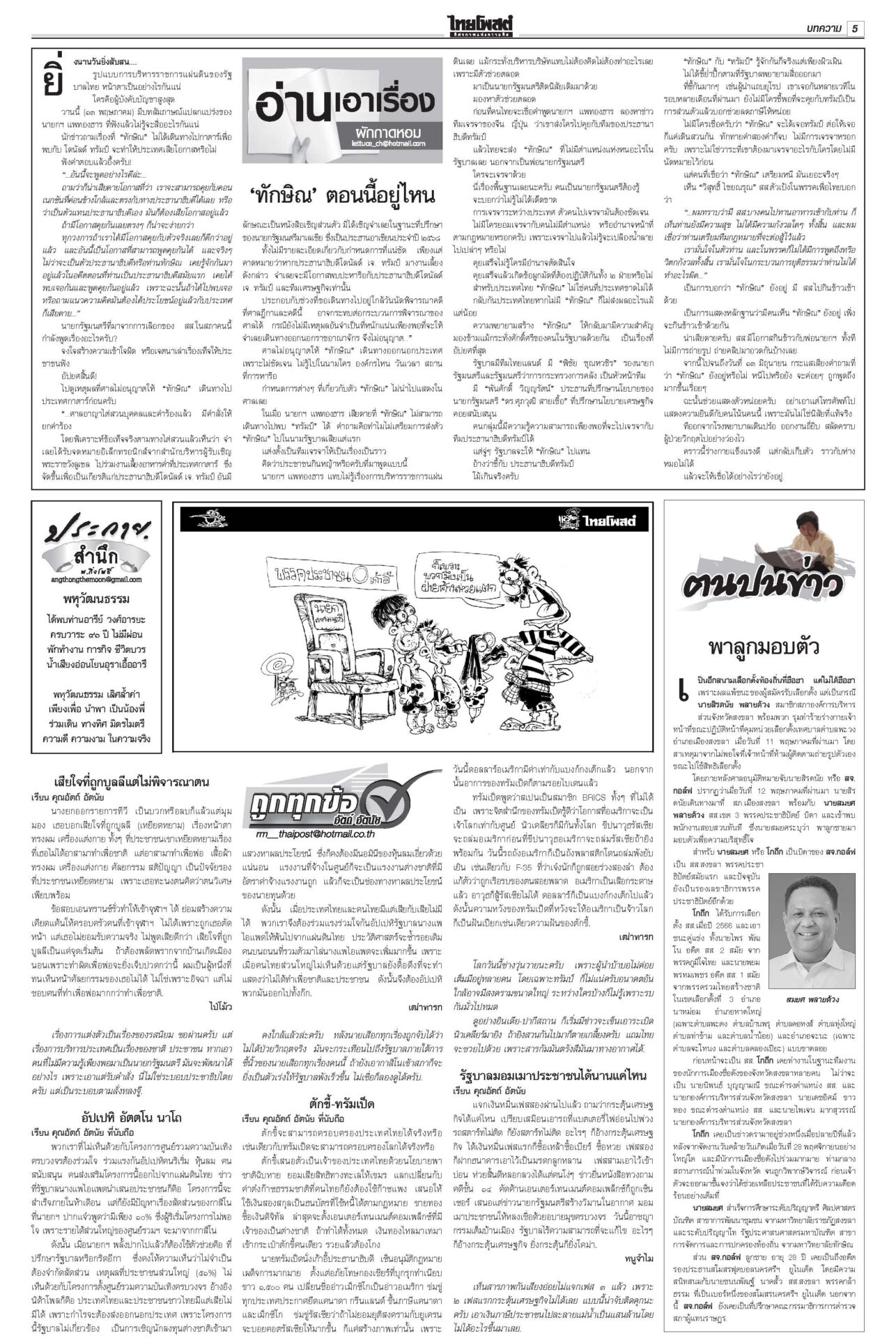 หนังสือพิมพ์ ฉบับวันที่ 14 พฤษภาคม 2568ข่าวหน้าหนึ่งแม้วแจงศาล13มิ.ย. ไม่หนี‘อิ๊งค์’การันตี‘แพทย์ใหญ่’ดิ้นสู้ชั้น14/ปชน.ดองงูเห่า“นายกฯ อิ๊งค์” เผย 13 มิ.ย. “ทักษิณ” ไปแจงศาลเอง เสียงแข็งพ่อป่วยจริง ลุ้นUSเคาะเจรจา ออกโทเคน5พันล.“นายกฯ อิ๊งค์” พ้อไทยเสียโอกาส! หลังศาลไม่ไฟเขียวให้ “พ่อ” เดินทางไปกาตาร์พบทรัมป์ DSIแฉเส้นเงินฮั้วสว.1.2พันคน“ทวี” เหน็บ สว.คนมีเกียรติ ต้องให้เกียรติคนอื่นก่อน ยันทำคดีฮั้ว สว.ไม่กระทบสัมพันธ์ รมต. เพิ่มซ่องโจร‘สจ.กอล์ฟ’ สมุทรสาครจ่อแจกแดง“บิ๊กอู๊ด” เข้าเยี่ยม “ดาบตำรวจ” หลังถูก “สจ.กอล์ฟ” ทำร้าย ยันคนผิดต้องไม่มีที่ยืนในสังคม ตร.แจ้งเพิ่มข้อหาซ่องโจร ตร.ขอหมายจับ ตึกถล่ม17ราย กทม.ปิดภารกิจกทม.ทำบุญอุทิศส่วนกุศลให้ผู้ประสบภัยตึก สตง.ถล่ม ก่อนปิดฉากภารกิจ 48 วัน