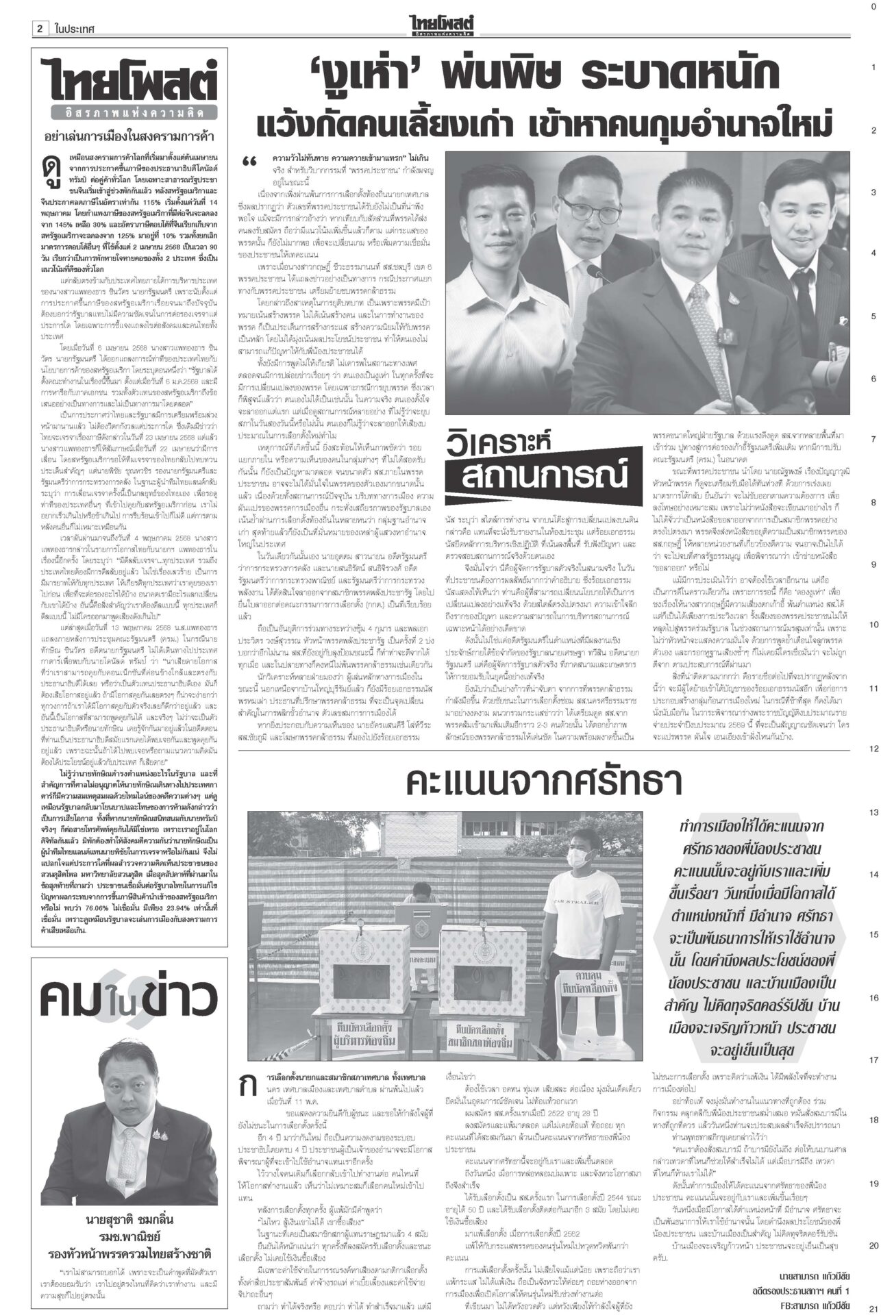 ฉบับวันที่ 14 พฤษภาคม 2568 14 พฤษภาคม 2568 เวลา 0:01 น. หนังสือพิมพ์ ฉบับวันที่ 14 พฤษภาคม 2568ข่าวหน้าหนึ่งแม้วแจงศาล13มิ.ย. ไม่หนี‘อิ๊งค์’การันตี‘แพทย์ใหญ่’ดิ้นสู้ชั้น14/ปชน.ดองงูเห่า“นายกฯ อิ๊งค์” เผย 13 มิ.ย. “ทักษิณ” ไปแจงศาลเอง เสียงแข็งพ่อป่วยจริง ลุ้นUSเคาะเจรจา ออกโทเคน5พันล.“นายกฯ อิ๊งค์” พ้อไทยเสียโอกาส! หลังศาลไม่ไฟเขียวให้ “พ่อ” เดินทางไปกาตาร์พบทรัมป์ DSIแฉเส้นเงินฮั้วสว.1.2พันคน“ทวี” เหน็บ สว.คนมีเกียรติ ต้องให้เกียรติคนอื่นก่อน ยันทำคดีฮั้ว สว.ไม่กระทบสัมพันธ์ รมต. เพิ่มซ่องโจร‘สจ.กอล์ฟ’ สมุทรสาครจ่อแจกแดง“บิ๊กอู๊ด” เข้าเยี่ยม “ดาบตำรวจ” หลังถูก “สจ.กอล์ฟ” ทำร้าย ยันคนผิดต้องไม่มีที่ยืนในสังคม ตร.แจ้งเพิ่มข้อหาซ่องโจร ตร.ขอหมายจับ ตึกถล่ม17ราย กทม.ปิดภารกิจกทม.ทำบุญอุทิศส่วนกุศลให้ผู้ประสบภัยตึก สตง.ถล่ม ก่อนปิดฉากภารกิจ 48 วัน Tagsรายวันหนังสือพิมพ์ ข่าวที่เกี่ยวข้อง ฉบับวันที่ 6 ธันวาคม 2568 ฉบับวันที่ 5 ธันวาคม 2568 ฉบับวันที่ 4 ธันวาคม 2568 ฉบับวันที่ 3 ธันวาคม 2568 ฉบับวันที่ 2 ธันวาคม 2568 ฉบับวันที่ 1 ธันวาคม 2568 NEWS UPDATE 21:16 น. จนท.ปกครองเดินฝ่าดงหนาม 4 กม. จับหนุ่มซุกยาบ้าในรูปู 126 เม็ด 20:58 น. ชาวบ้านริมน้ำสาละวิน มึนข้อมูลราชการสุดสับสน ไม่แน่ใจปลา-พืชริมน้ำกินได้หรือไม่ 19:07 น. ลมหนาวมาอีกระลอก! กรมอุตุฯ พยากรณ์อากาศ 7 วันข้างหน้า อุณหภูมิจะลดลง 2-4 องศา 19:05 น. ภัยพิบัติสแกมเมอร์ | ห้องข่าวไทยโพสต์สุดสัปดาห์ 18:49 น. 'GULF-AIS'บอลไทยเพื่อคนไทย ร่วมหนุน'เกษตรศาสตร์ FC' สู้ศึกT2ยกกีฬาคู่การศึกษา