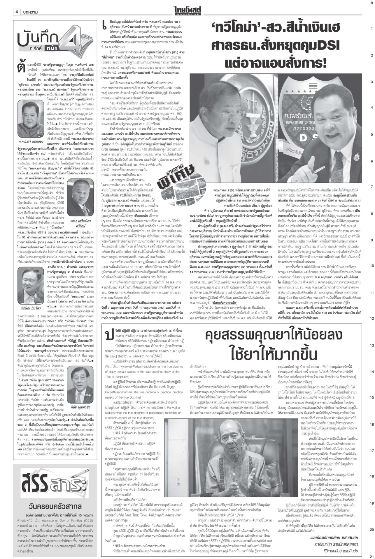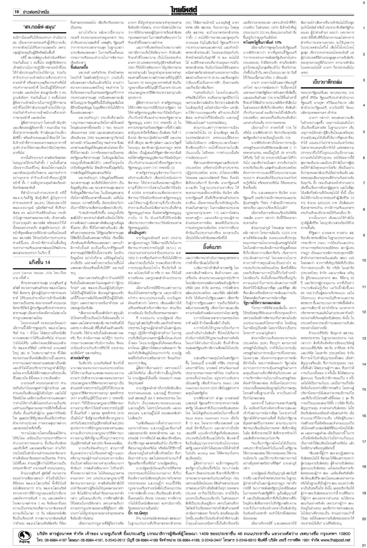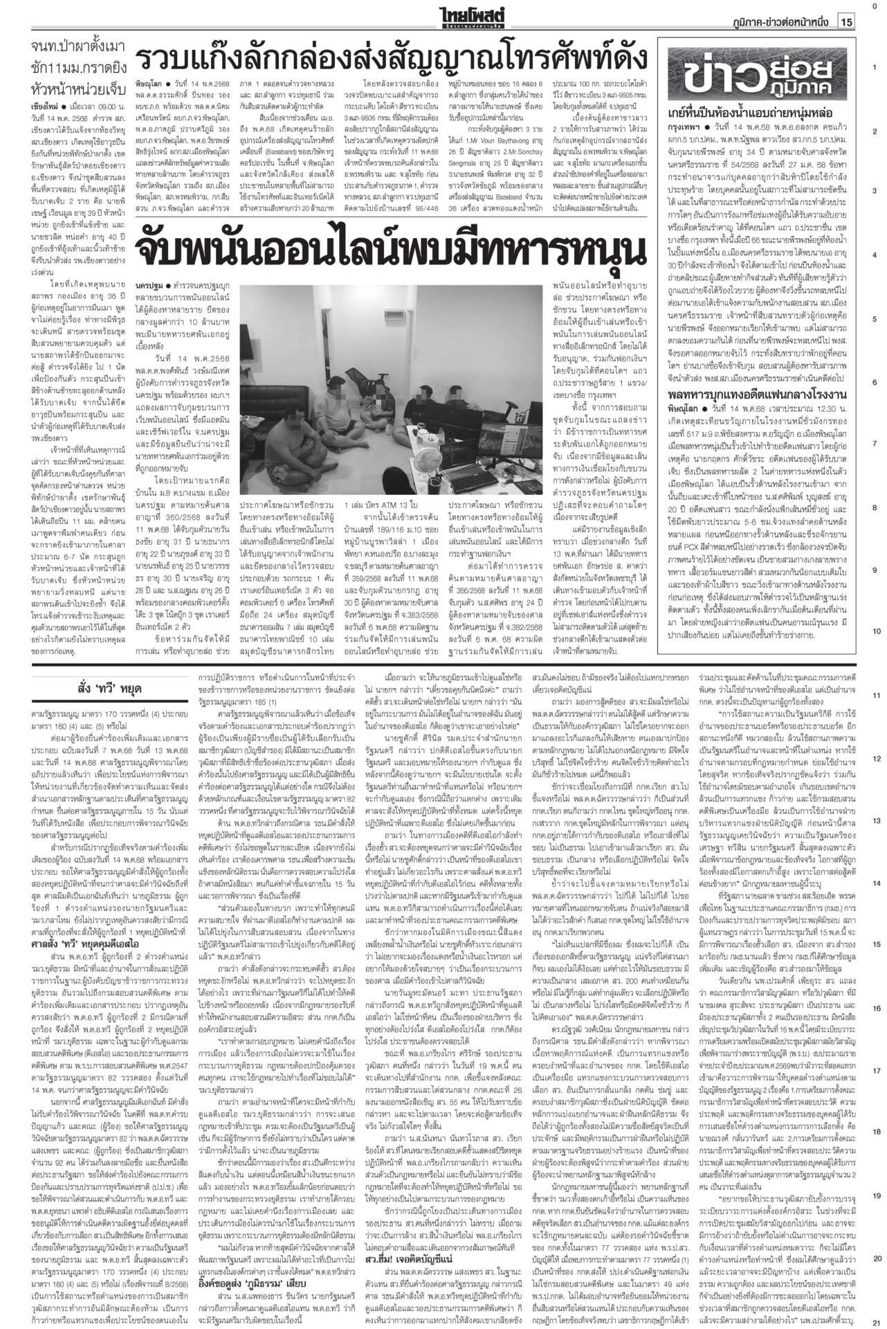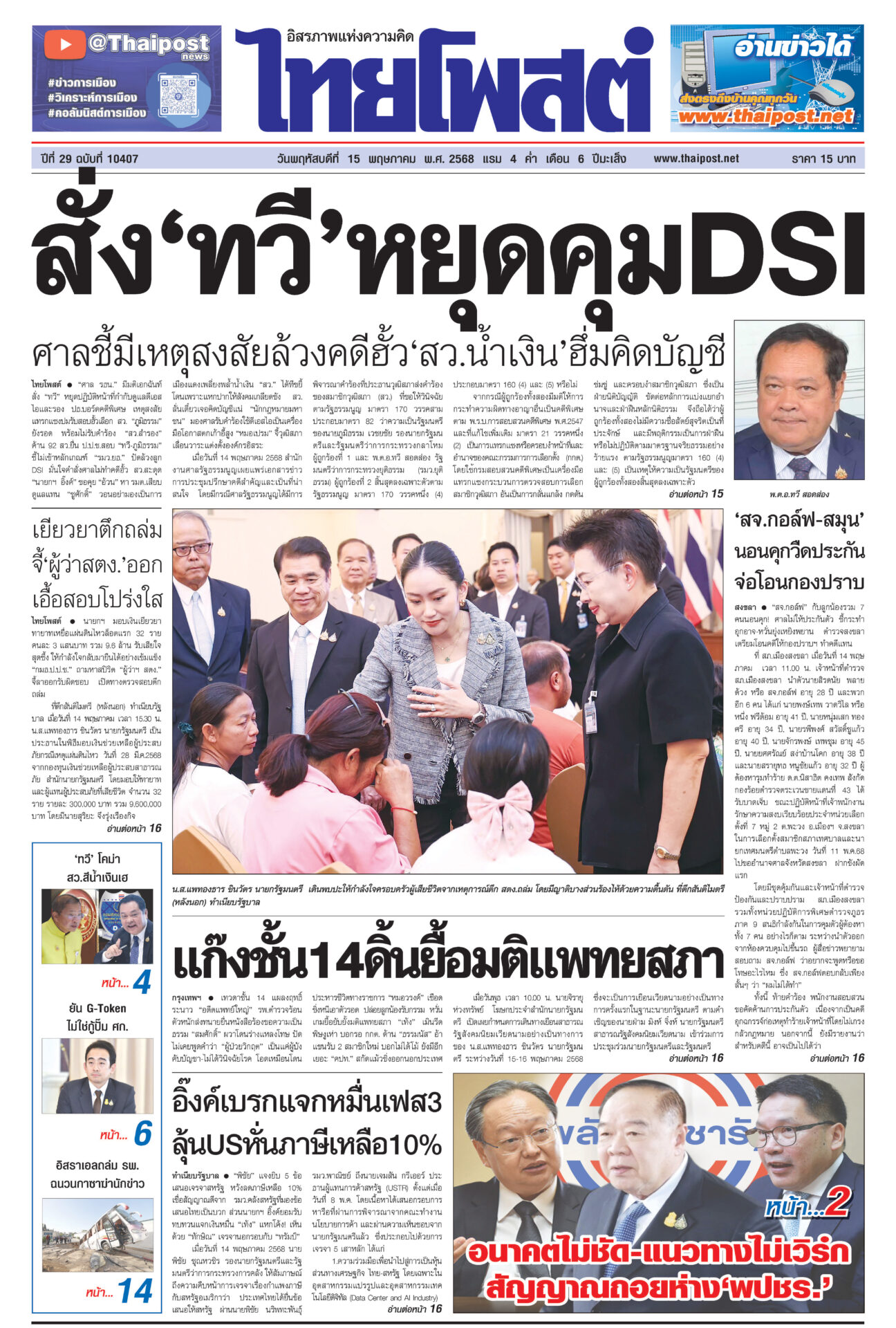 หนังสือพิมพ์ ฉบับวันที่ 15 พฤษภาคม 2568ข่าวหน้าหนึ่งสั่ง‘ทวี’หยุดคุมDSI ศาลชี้มีเหตุสงสัยล้วงคดีฮั้ว‘สว.นํ้าเงิน’ฮึ่มคิดบัญชี“ศาล รธน.” มีมติเอกฉันท์ สั่ง “ทวี” หยุดปฏิบัติหน้าที่กำกับดูแลดีเอสไอและรอง ปธ.บอร์ดคดีพิเศษ แก๊งชั้น14ดิ้นยื้อมติแพทยสภาเทวดาชั้น 14 แผลงฤทธิ์ระนาว “อดีตแพทย์ใหญ่” รพ.ตำรวจร้อนตัวหนักส่งทนายยื่นหนังสือร้องขอความเป็นธรรม อิ๊งค์เบรกแจกหมื่นเฟส3 ลุ้นUSหั่นภาษีเหลือ10%“พิชัย” แจงยิบ 5 ข้อเสนอเจรจาสหรัฐ หวังลดภาษีเหลือ 10% เชื่อสัญญาณดีจาก รมว.คลังสหรัฐที่มองข้อเสนอไทยเป็นบวก ‘สจ.กอล์ฟ-สมุน’ นอนคุกวืดประกัน จ่อโอนกองปราบ“สจ.กอล์ฟ” กับลูกน้องรวม 7 คนนอนคุก! ศาลไม่ให้ประกันตัว เยียวยาตึกถล่ม จี้‘ผู้ว่าสตง.’ออก เอื้อสอบโปร่งใสนายกฯ มอบเงินเยียวยาทายาทเหยื่อแผ่นดินไหวล็อตแรก 32 ราย คนละ 3 แสนบาท รวม 9.6 ล้าน