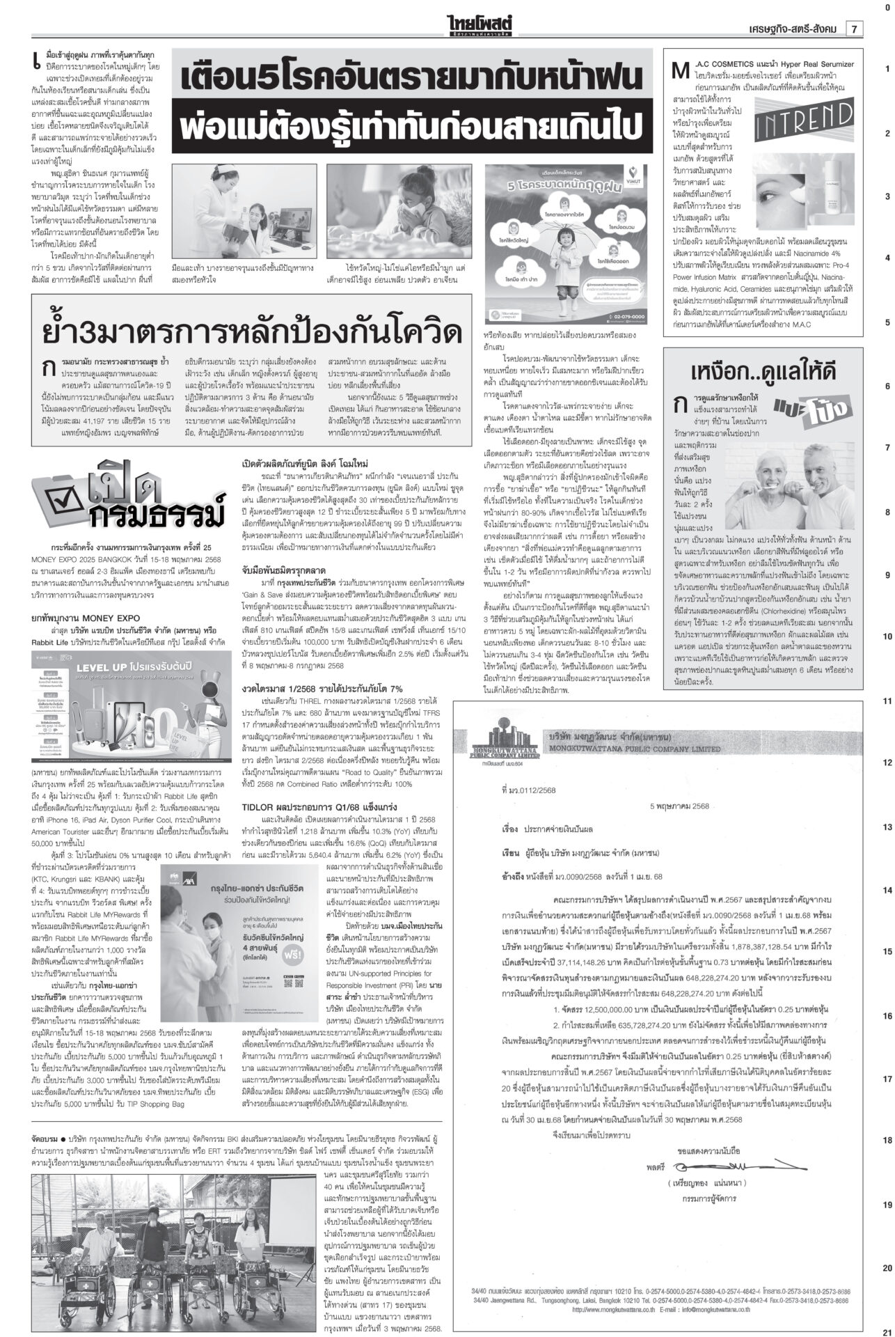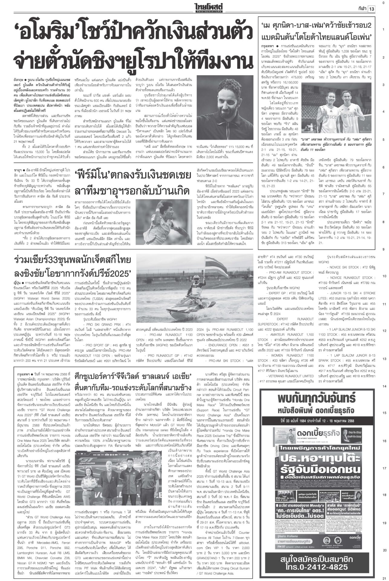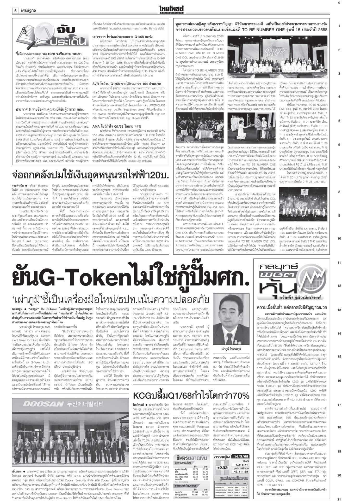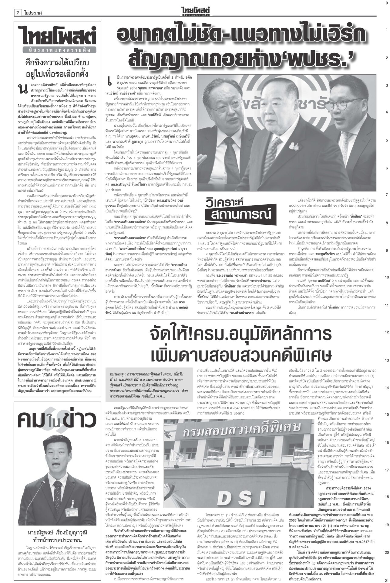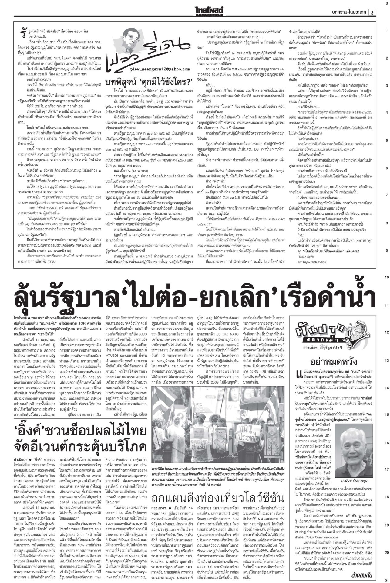 หนังสือพิมพ์ ฉบับวันที่ 15 พฤษภาคม 2568ข่าวหน้าหนึ่งสั่ง‘ทวี’หยุดคุมDSI ศาลชี้มีเหตุสงสัยล้วงคดีฮั้ว‘สว.นํ้าเงิน’ฮึ่มคิดบัญชี“ศาล รธน.” มีมติเอกฉันท์ สั่ง “ทวี” หยุดปฏิบัติหน้าที่กำกับดูแลดีเอสไอและรอง ปธ.บอร์ดคดีพิเศษ แก๊งชั้น14ดิ้นยื้อมติแพทยสภาเทวดาชั้น 14 แผลงฤทธิ์ระนาว “อดีตแพทย์ใหญ่” รพ.ตำรวจร้อนตัวหนักส่งทนายยื่นหนังสือร้องขอความเป็นธรรม อิ๊งค์เบรกแจกหมื่นเฟส3 ลุ้นUSหั่นภาษีเหลือ10%“พิชัย” แจงยิบ 5 ข้อเสนอเจรจาสหรัฐ หวังลดภาษีเหลือ 10% เชื่อสัญญาณดีจาก รมว.คลังสหรัฐที่มองข้อเสนอไทยเป็นบวก ‘สจ.กอล์ฟ-สมุน’ นอนคุกวืดประกัน จ่อโอนกองปราบ“สจ.กอล์ฟ” กับลูกน้องรวม 7 คนนอนคุก! ศาลไม่ให้ประกันตัว เยียวยาตึกถล่ม จี้‘ผู้ว่าสตง.’ออก เอื้อสอบโปร่งใสนายกฯ มอบเงินเยียวยาทายาทเหยื่อแผ่นดินไหวล็อตแรก 32 ราย คนละ 3 แสนบาท รวม 9.6 ล้าน