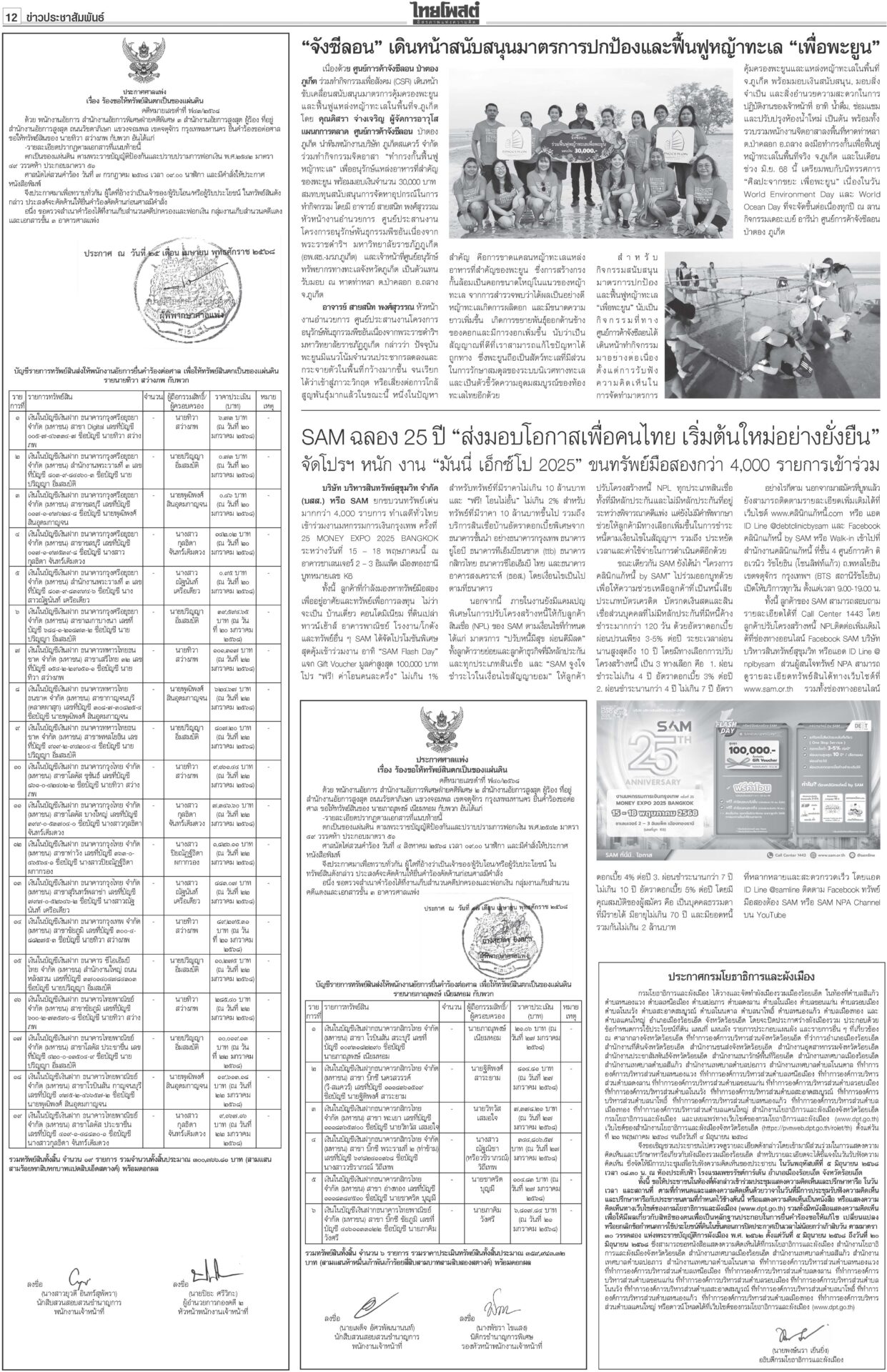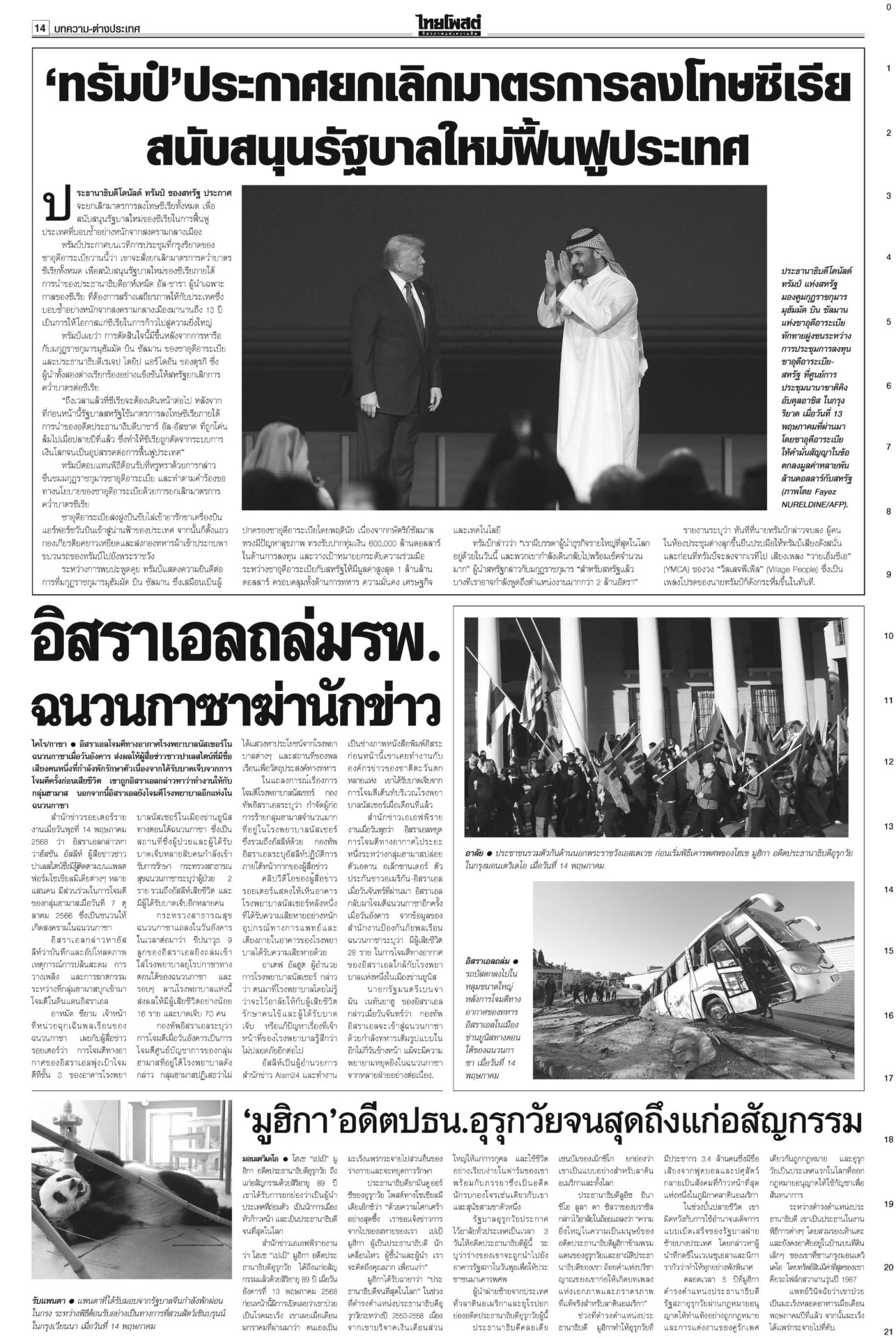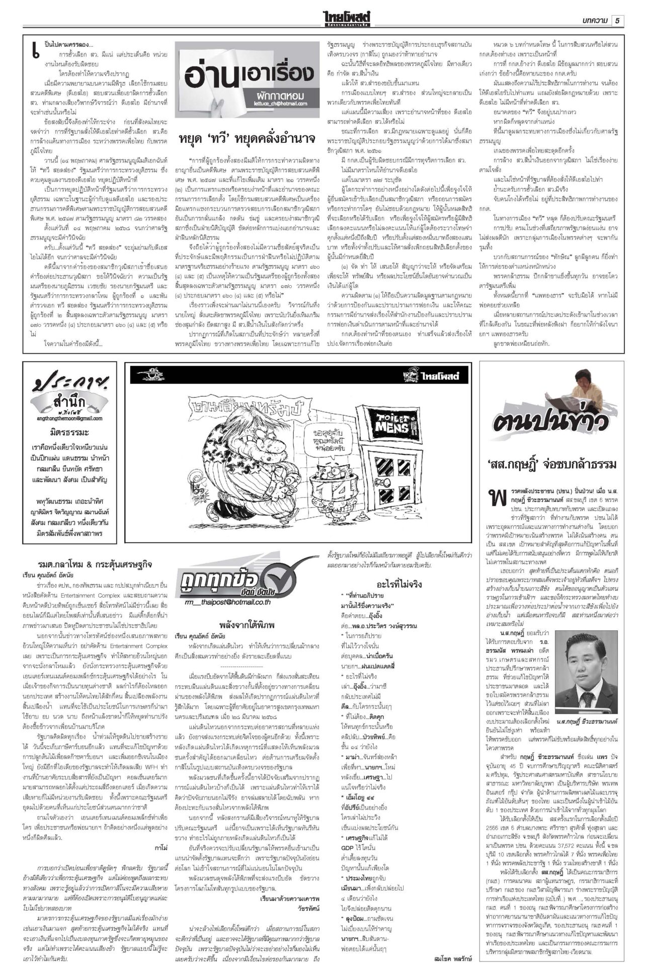 ฉบับวันที่ 15 พฤษภาคม 2568 15 พฤษภาคม 2568 เวลา 0:01 น. หนังสือพิมพ์ ฉบับวันที่ 15 พฤษภาคม 2568ข่าวหน้าหนึ่งสั่ง‘ทวี’หยุดคุมDSI ศาลชี้มีเหตุสงสัยล้วงคดีฮั้ว‘สว.นํ้าเงิน’ฮึ่มคิดบัญชี“ศาล รธน.” มีมติเอกฉันท์ สั่ง “ทวี” หยุดปฏิบัติหน้าที่กำกับดูแลดีเอสไอและรอง ปธ.บอร์ดคดีพิเศษ แก๊งชั้น14ดิ้นยื้อมติแพทยสภาเทวดาชั้น 14 แผลงฤทธิ์ระนาว “อดีตแพทย์ใหญ่” รพ.ตำรวจร้อนตัวหนักส่งทนายยื่นหนังสือร้องขอความเป็นธรรม อิ๊งค์เบรกแจกหมื่นเฟส3 ลุ้นUSหั่นภาษีเหลือ10%“พิชัย” แจงยิบ 5 ข้อเสนอเจรจาสหรัฐ หวังลดภาษีเหลือ 10% เชื่อสัญญาณดีจาก รมว.คลังสหรัฐที่มองข้อเสนอไทยเป็นบวก ‘สจ.กอล์ฟ-สมุน’ นอนคุกวืดประกัน จ่อโอนกองปราบ“สจ.กอล์ฟ” กับลูกน้องรวม 7 คนนอนคุก! ศาลไม่ให้ประกันตัว เยียวยาตึกถล่ม จี้‘ผู้ว่าสตง.’ออก เอื้อสอบโปร่งใสนายกฯ มอบเงินเยียวยาทายาทเหยื่อแผ่นดินไหวล็อตแรก 32 ราย คนละ 3 แสนบาท รวม 9.6 ล้าน Tagsรายวันหนังสือพิมพ์ ข่าวที่เกี่ยวข้อง ฉบับวันที่ 6 ธันวาคม 2568 ฉบับวันที่ 5 ธันวาคม 2568 ฉบับวันที่ 4 ธันวาคม 2568 ฉบับวันที่ 3 ธันวาคม 2568 ฉบับวันที่ 2 ธันวาคม 2568 ฉบับวันที่ 1 ธันวาคม 2568 NEWS UPDATE 21:16 น. จนท.ปกครองเดินฝ่าดงหนาม 4 กม. จับหนุ่มซุกยาบ้าในรูปู 126 เม็ด 20:58 น. ชาวบ้านริมน้ำสาละวิน มึนข้อมูลราชการสุดสับสน ไม่แน่ใจปลา-พืชริมน้ำกินได้หรือไม่ 19:07 น. ลมหนาวมาอีกระลอก! กรมอุตุฯ พยากรณ์อากาศ 7 วันข้างหน้า อุณหภูมิจะลดลง 2-4 องศา 19:05 น. ภัยพิบัติสแกมเมอร์ | ห้องข่าวไทยโพสต์สุดสัปดาห์ 18:49 น. 'GULF-AIS'บอลไทยเพื่อคนไทย ร่วมหนุน'เกษตรศาสตร์ FC' สู้ศึกT2ยกกีฬาคู่การศึกษา