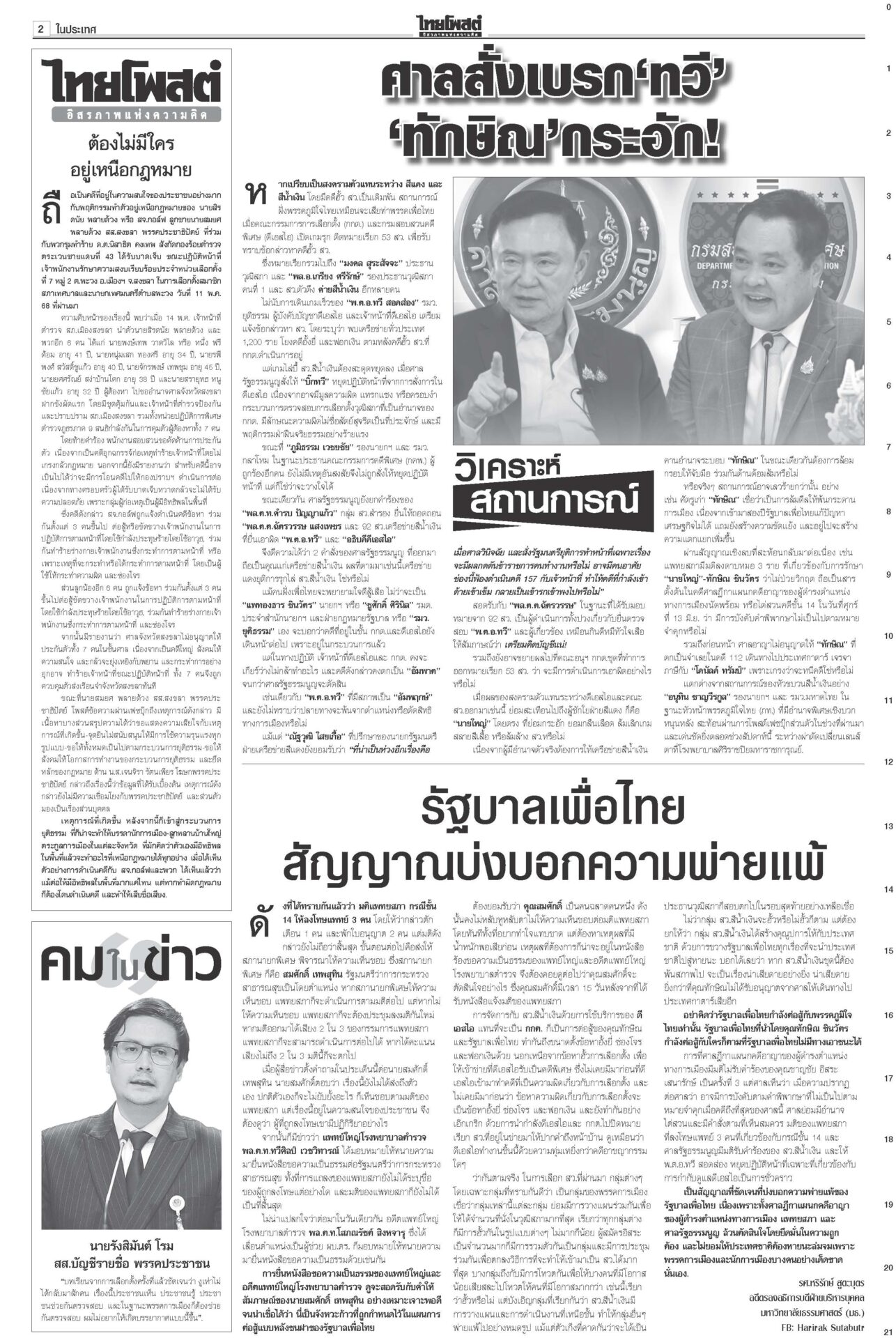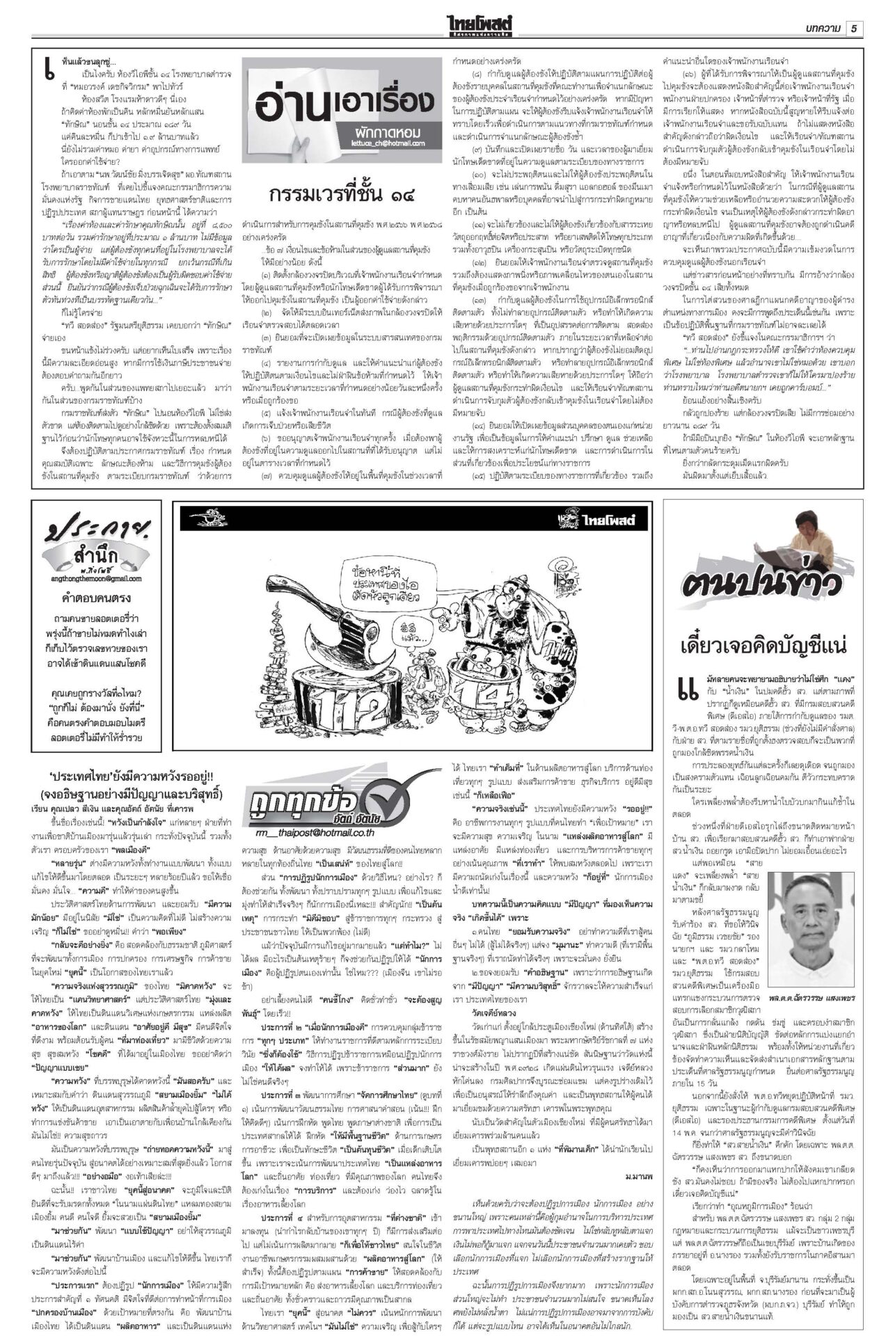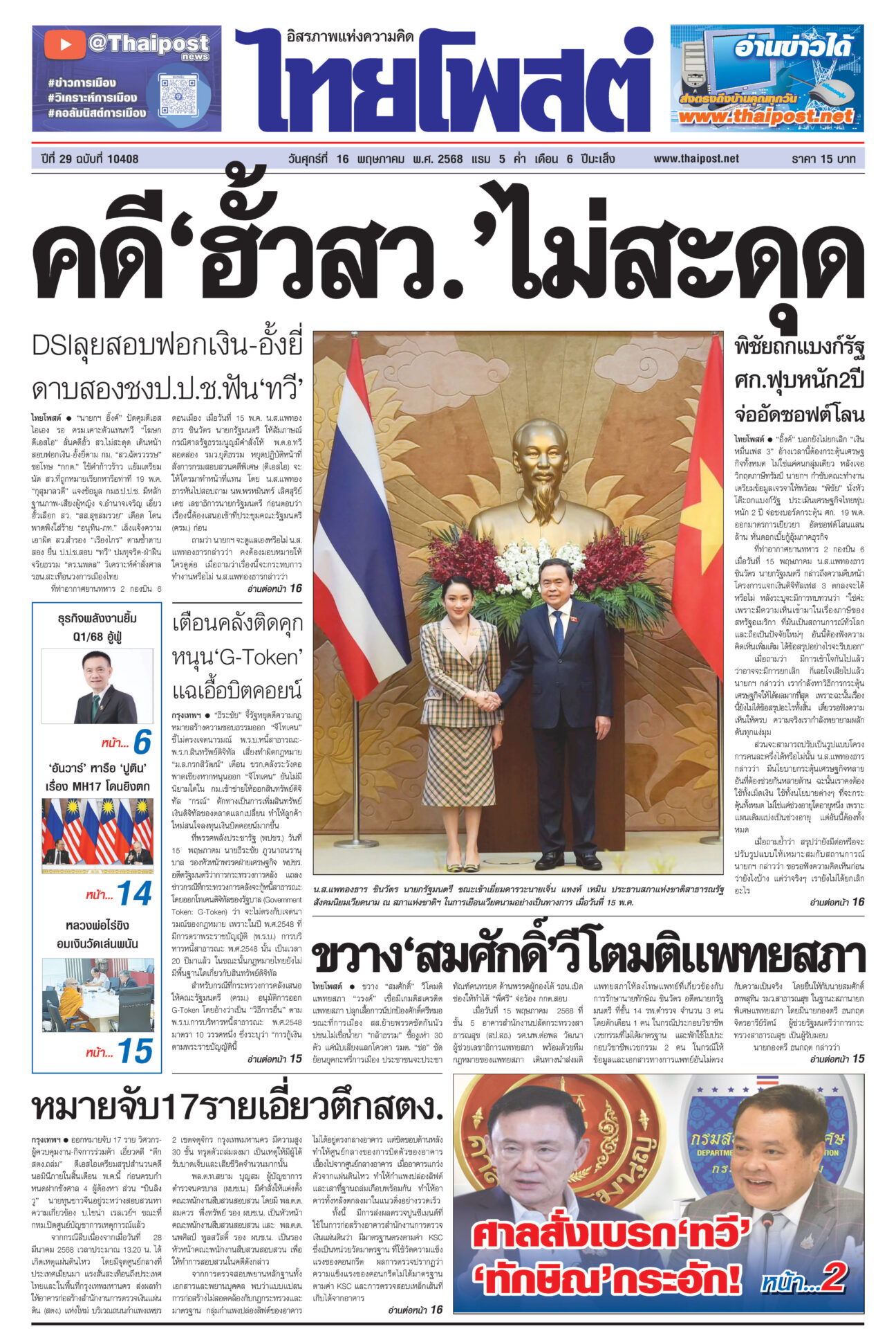 หนังสือพิมพ์ ฉบับวันที่ 16 พฤษภาคม 2568ข่าวหน้าหนึ่งคดี‘ฮั้วสว.’ไม่สะดุด DSIลุยสอบฟอกเงิน-อั้งยี่ ดาบสองชงป.ป.ช.ฟัน‘ทวี’“นายกฯ อิ๊งค์” ปัดคุมดีเอสไอเอง รอ ครม.เคาะตัวแทนทวี “โฆษกดีเอสไอ” ลั่นคดีฮั้ว สว.ไม่สะดุด เดินหน้าสอบฟอกเงิน-อังยี่ตาม กม. ขวาง‘สมศักดิ์’วีโตมติแพทยสภาขวาง “สมศักดิ์” วีโตมติแพทยสภา “วรงค์” เชื่อมีเกมดิสเครดิตแพทยสภา หมายจับ17รายเอี่ยวตึกสตง.ออกหมายจับ 17 ราย วิศวกร-ผู้ควบคุมงาน-กิจการร่วมค้า เอี่ยวคดี “ตึก สตง.ถล่ม” พิชัยถกแบงก์รัฐ ศก.ฟุบหนัก2ปี จ่ออัดซอฟต์โลน“อิ๊งค์” บอกยังไม่ยกเลิก “เงินหมื่นเฟส 3” อ้างเวลานี้ต้องกระตุ้นเศรษฐกิจทั้งหมด เตือนคลังติดคุก หนุน‘G-Token’ แฉเอื้อบิตคอยน์“ธีระชัย” จี้รัฐหยุดตีความกฎหมายสร้างความชอบธรรมออก “จีโทเคน” ชี้ไม่ตรงเจตนารมณ์ พ.ร.บ.หนี้