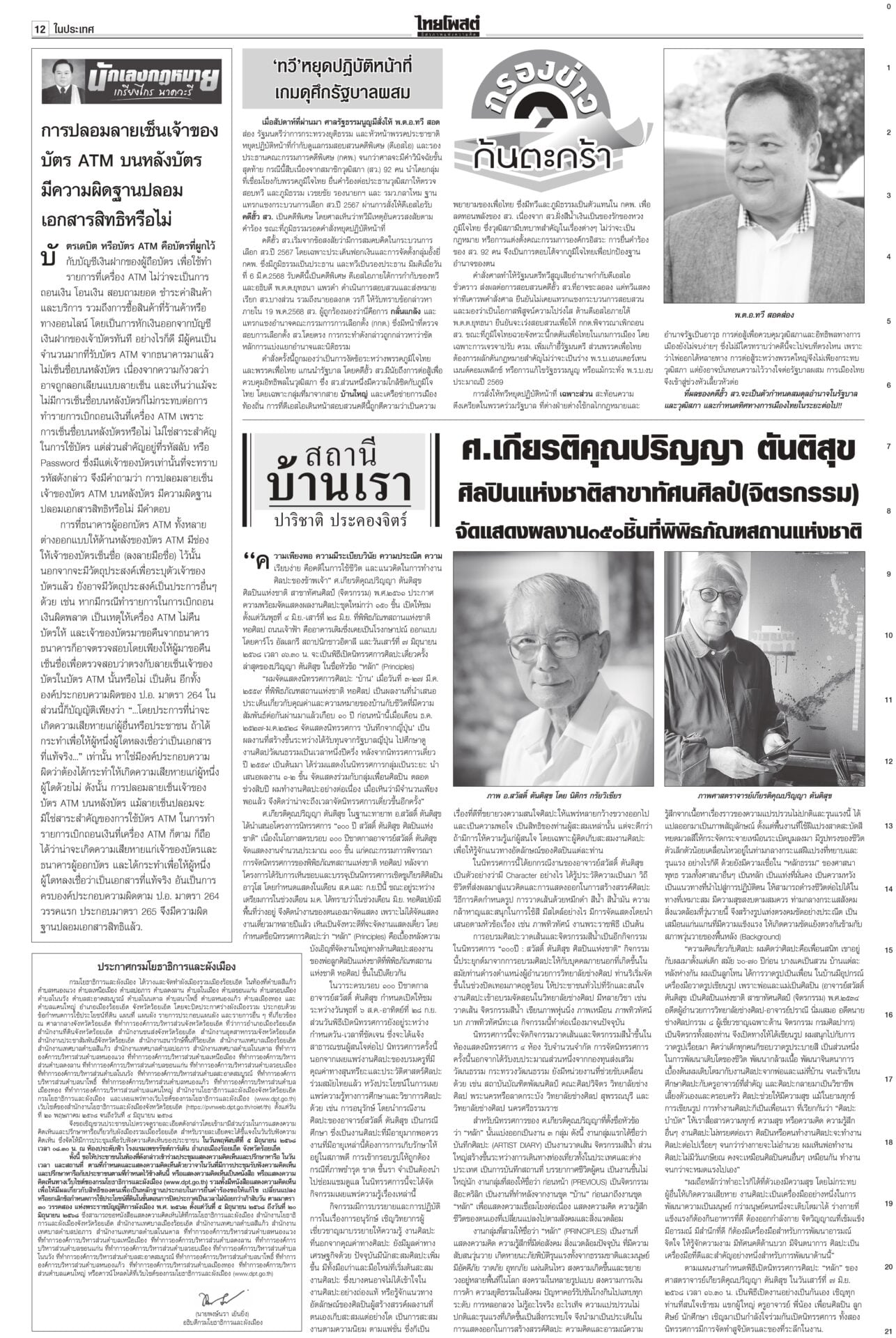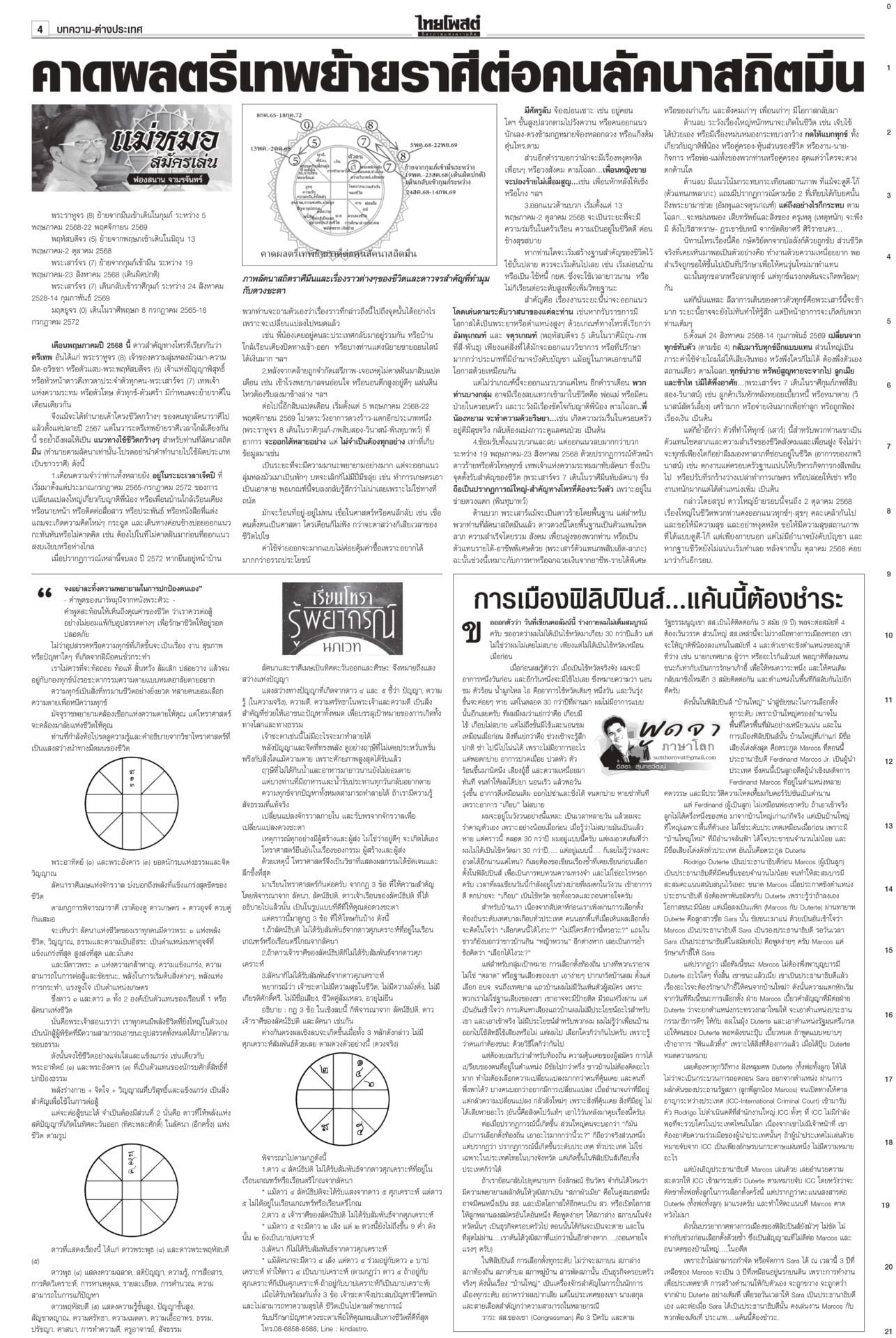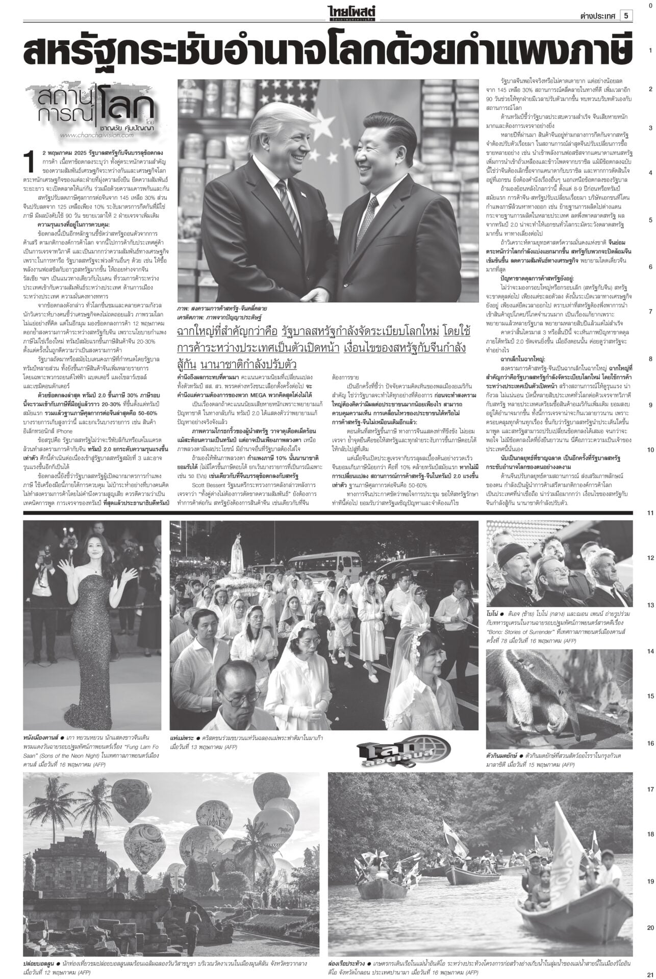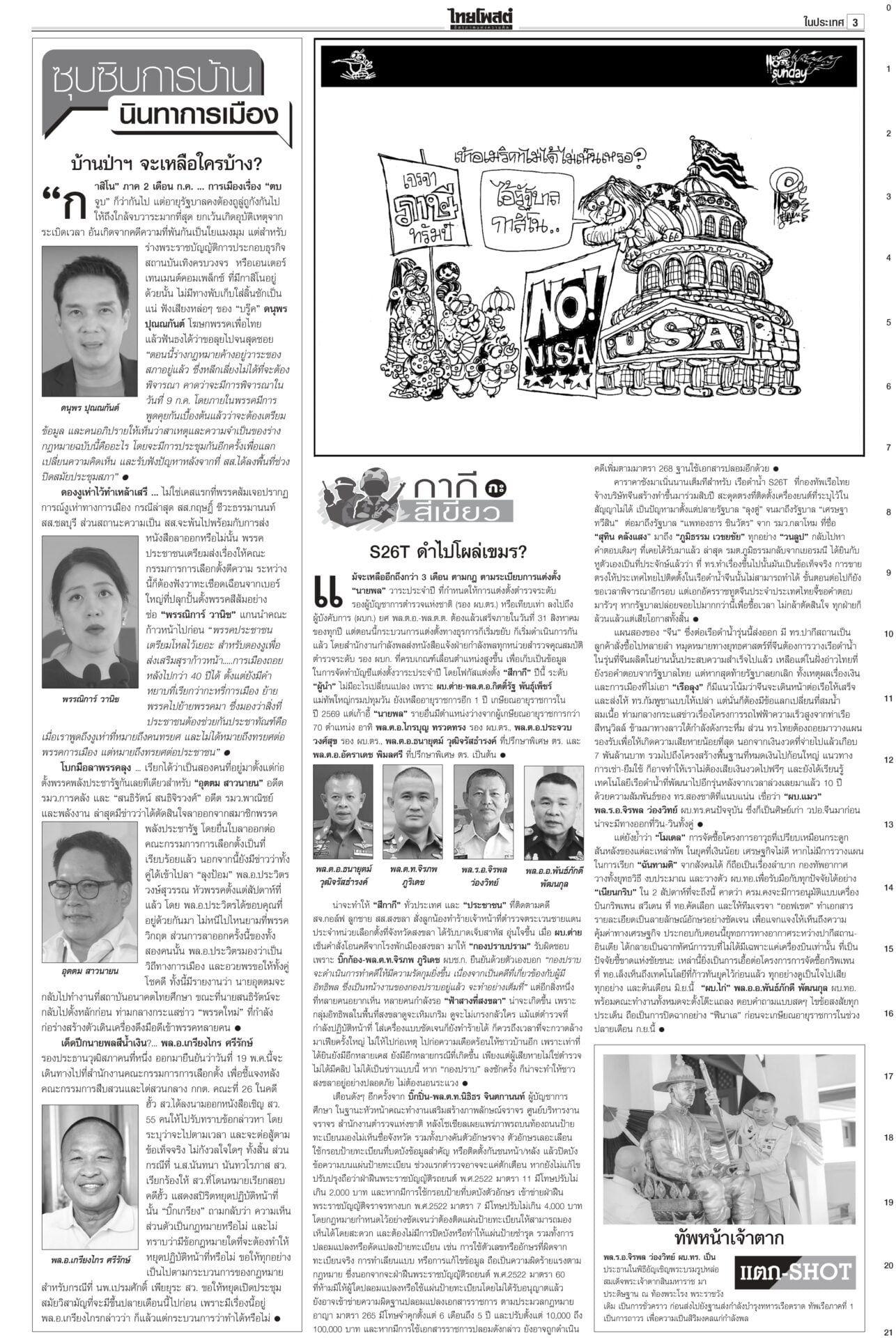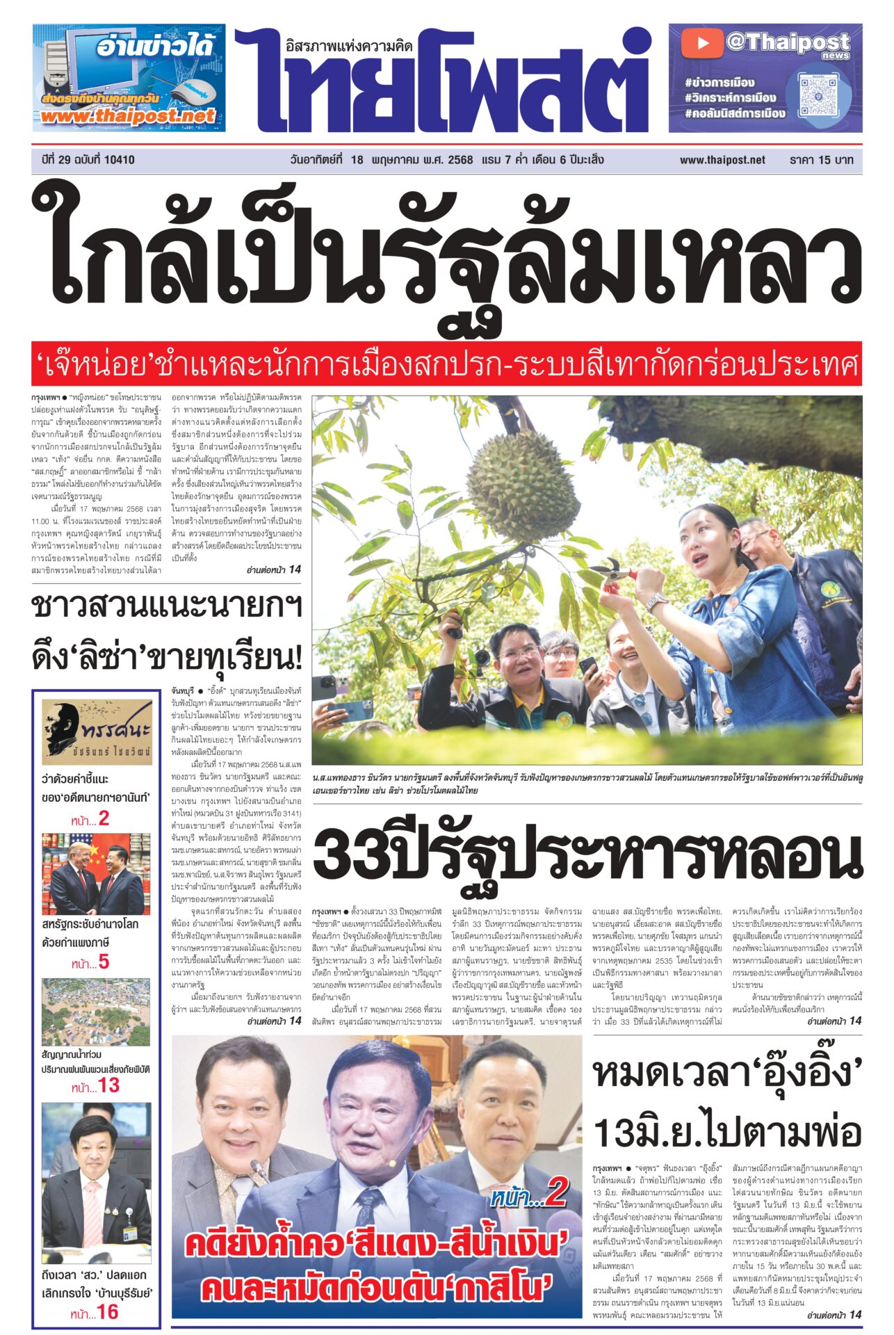หนังสือพิมพ์ฉบับวันที่ 18 พฤษภาคม 2568ข่าวหน้าหนึ่งใกล้เป็นรัฐล้มเหลว ‘เจ๊หน่อย’ ชำแหละนักการเมืองสกปรก-ระบบสีเทากัดกร่อนประเทศ“หญิงหน่อย” ขอโทษประชาชน ปล่อยงูเห่าแฝงตัวในพรรค รับ “อนุดิษฐ์-การุณ” เข้าคุยเรื่องออกจากพรรคหลายครั้ง ยันจากกันด้วยดี ชี้บ้านเมืองถูกกัดกร่อนจากนักการเมืองสกปรกจนใกล้เป็นรัฐล้มเหลว หมดเวลา‘อุ๊งอิ๊ง’ 13มิ.ย.ไปตามพ่อ“จตุพร” ฟันธงเวลา “อุ๊งอิ๊ง” ใกล้หมดแล้ว ถ้าพ่อไปก็ไปตามพ่อ เชื่อ 13 มิ.ย. ตัดสินสถานการณ์การเมือง แนะ “ทักษิณ” ใช้ความกล้าหาญเป็นครั้งแรก ชาวสวนแนะนายกฯ ดึง‘ลิซ่า’ขายทุเรียน!“อิ๊งค์” บุกสวนทุเรียนเมืองจันท์ รับฟังปัญหา ตัวแทนเกษตรกรเสนอดึง “ลิซ่า” ช่วยโปรโมตผลไม้ไทย หวังช่วยขยายฐานลูกค้า-เพิ่มยอดขาย นายกฯ ชวนประชาชนกินผลไม้ไทยเยอะๆ ให้กำลังใจเกษตรกร หลังผลผลิตปีนี้ออกมาก 33ปีรัฐประหารหลอนตั้งวงเสวนา 33 ปีพฤษภาทมิฬ “ชัชชาติ” เผยเหตุการณ์นี้นั่งร้องไห้กับเพื่อนที่อเมริกา ปัจจุบันยังต้องสู้กับประชาธิปไตยสีเทา “เท้ง” ลั่นเป็นตัวแทนคน