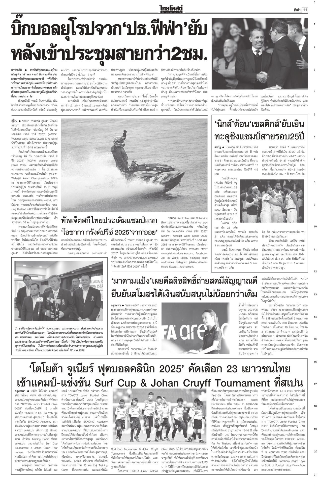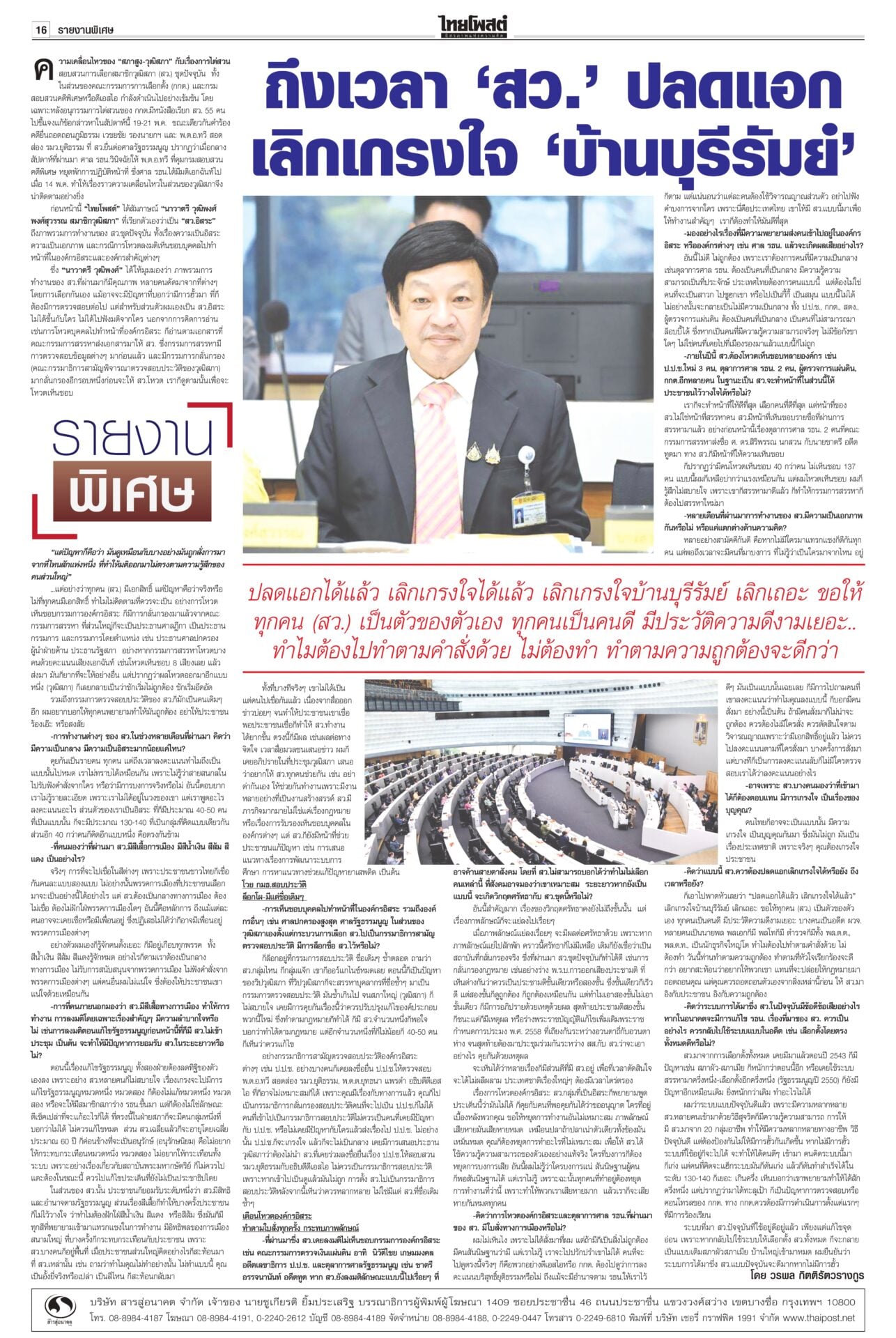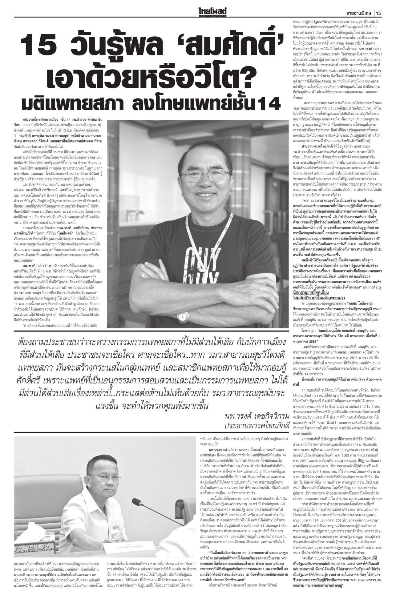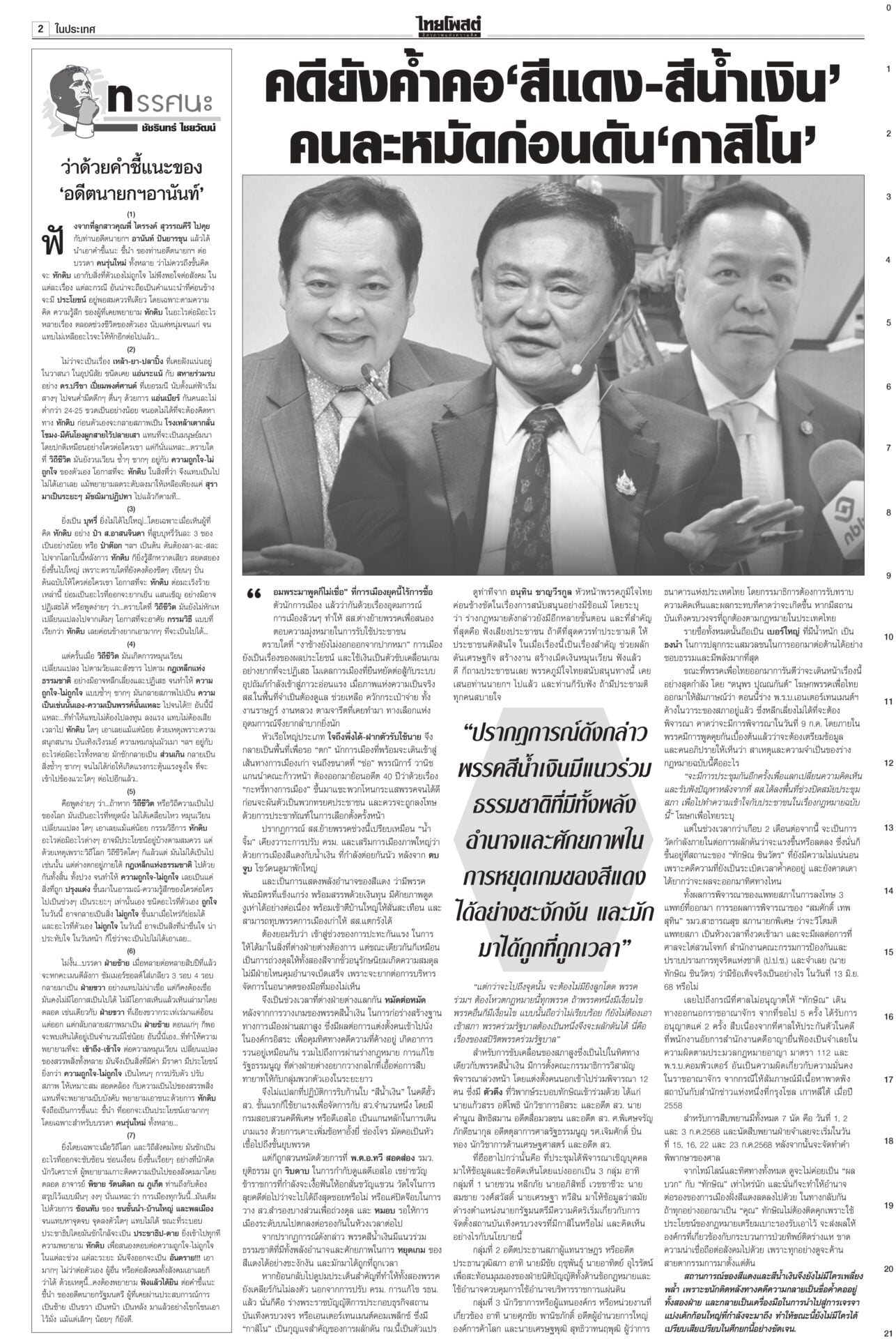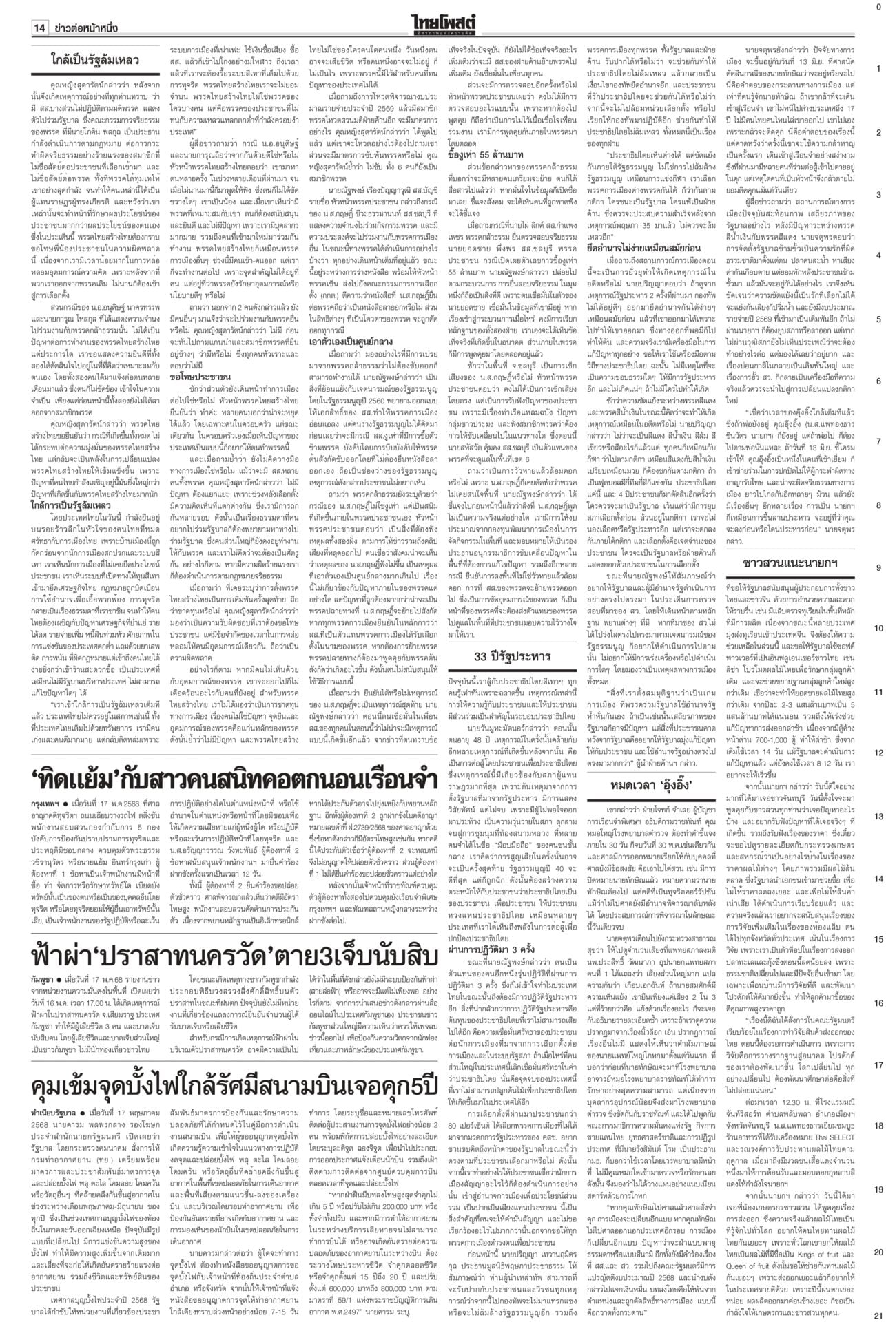 หนังสือพิมพ์ฉบับวันที่ 18 พฤษภาคม 2568ข่าวหน้าหนึ่งใกล้เป็นรัฐล้มเหลว ‘เจ๊หน่อย’ ชำแหละนักการเมืองสกปรก-ระบบสีเทากัดกร่อนประเทศ“หญิงหน่อย” ขอโทษประชาชน ปล่อยงูเห่าแฝงตัวในพรรค รับ “อนุดิษฐ์-การุณ” เข้าคุยเรื่องออกจากพรรคหลายครั้ง ยันจากกันด้วยดี ชี้บ้านเมืองถูกกัดกร่อนจากนักการเมืองสกปรกจนใกล้เป็นรัฐล้มเหลว หมดเวลา‘อุ๊งอิ๊ง’ 13มิ.ย.ไปตามพ่อ“จตุพร” ฟันธงเวลา “อุ๊งอิ๊ง” ใกล้หมดแล้ว ถ้าพ่อไปก็ไปตามพ่อ เชื่อ 13 มิ.ย. ตัดสินสถานการณ์การเมือง แนะ “ทักษิณ” ใช้ความกล้าหาญเป็นครั้งแรก ชาวสวนแนะนายกฯ ดึง‘ลิซ่า’ขายทุเรียน!“อิ๊งค์” บุกสวนทุเรียนเมืองจันท์ รับฟังปัญหา ตัวแทนเกษตรกรเสนอดึง “ลิซ่า” ช่วยโปรโมตผลไม้ไทย หวังช่วยขยายฐานลูกค้า-เพิ่มยอดขาย นายกฯ ชวนประชาชนกินผลไม้ไทยเยอะๆ ให้กำลังใจเกษตรกร หลังผลผลิตปีนี้ออกมาก 33ปีรัฐประหารหลอนตั้งวงเสวนา 33 ปีพฤษภาทมิฬ “ชัชชาติ” เผยเหตุการณ์นี้นั่งร้องไห้กับเพื่อนที่อเมริกา ปัจจุบันยังต้องสู้กับประชาธิปไตยสีเทา “เท้ง” ลั่นเป็นตัวแทนคน