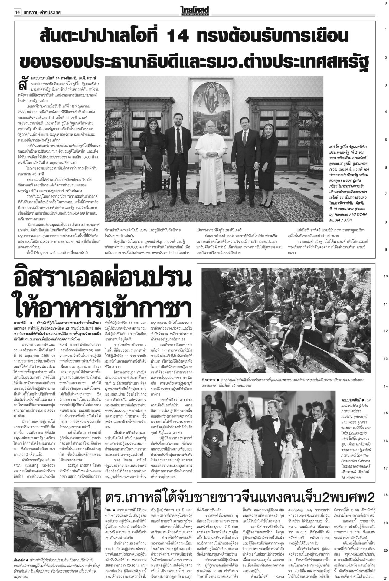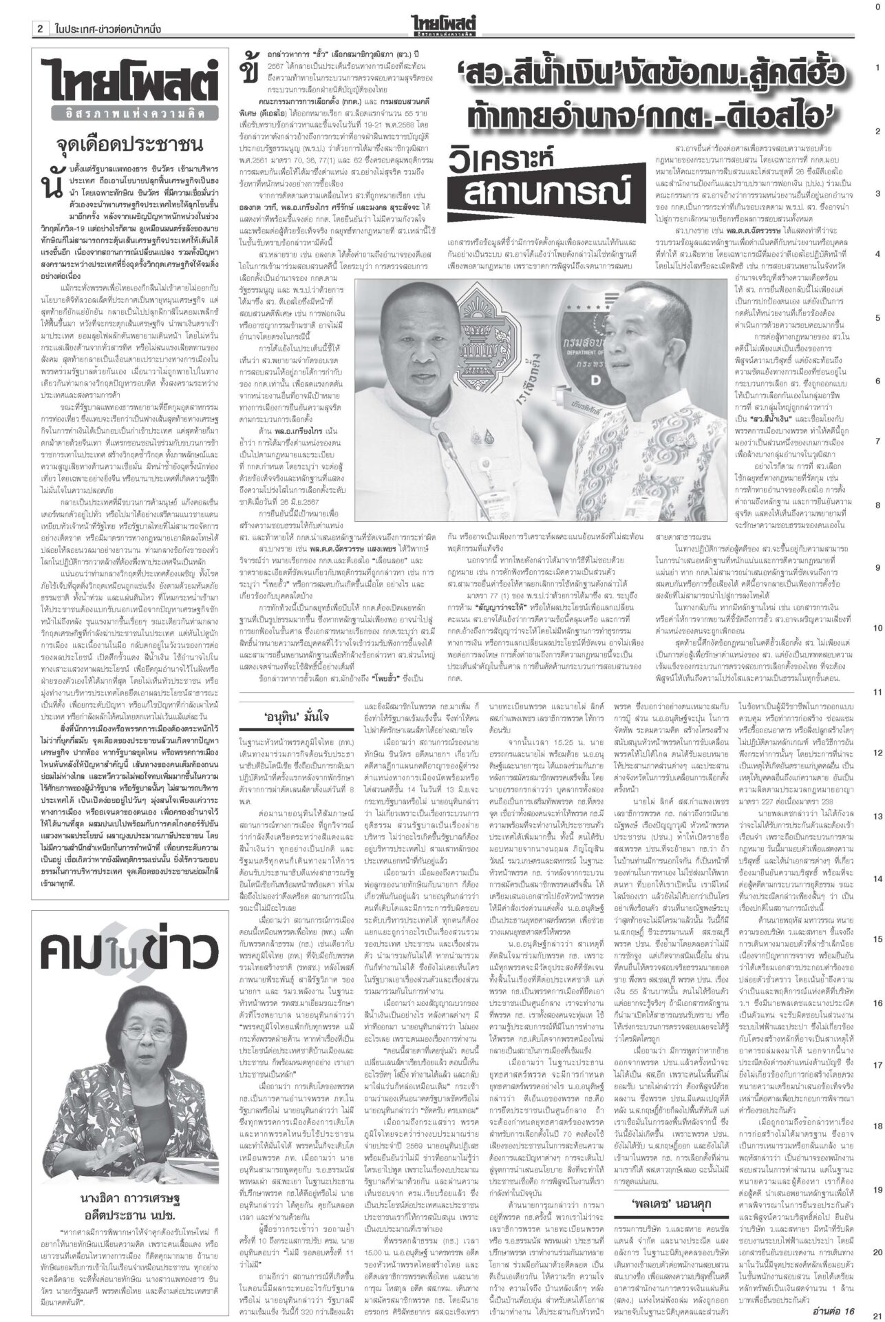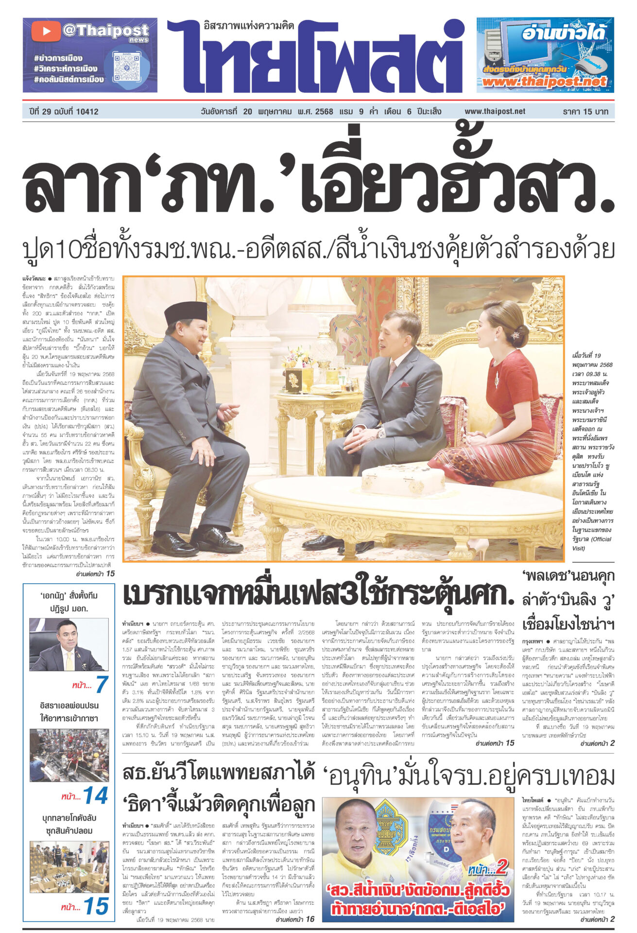 หนังสือพิมพ์ ฉบับวันที่ 20 พฤษภาคม 2568ข่าวหน้าหนึ่งลาก‘ภท.’เอี่ยวฮั้วสว. ปูด10ชื่อทั้งรมช.พณ.-อดีตสส./สีน้ำเงินชงคุ้ยตัวสำรองด้วยสภาสูงเรียงหน้าเข้ารับทราบข้อหาจาก กกต.คดีฮั้ว ลั่นไร้กังวลพร้อมชี้แจง “สิทธิกร” ข้องใจดีเอสไอ ต่อไปการเลือกตั้งทุกแบบมีอำนาจตรวจสอบ เบรกแจกหมื่นเฟส3ใช้กระตุ้นศก.นายกฯ ถกบอร์ดกระตุ้น ศก. ยอมรับภาษีสหรัฐฯ กระทบทั่วโลก “รมว.คลัง” ยอมรับต้องทบทวนงบดิจิทัลวอลเล็ต 1.57 แสนล้านบาท ‘พลเดช’นอนคุก ล่าตัว‘บินลิง วู’ เชื่อมโยงไชน่าฯศาลอาญาไม่ให้ประกัน “พลเดช” กก.บริษัท ว.และสหายฯ หนึ่งในก๊วนผู้ต้องหาเอี่ยวตึก สตง.ถล่ม สธ.ยันวีโตแพทยสภาได้ ‘ธิดา’จี้แม้วติดคุกเพื่อลูก“สมศักดิ์” เผยได้รับหนังสือขอความเป็นธรรมแพทย์ รพ.ตร.แล้ว ส่ง คกก.ตรวจสอบ “โฆษก สธ.” โต้ “สว.วีระพันธ์” ‘อนุทิน’มั่นใจรบ.อยู่ครบเทอม“อนุทิน” คัมแบ็กทํางานวันแรกหลังเปลี่ยนเลนส์ตา ยัน ภท.แพ็กกับทุกพรรค