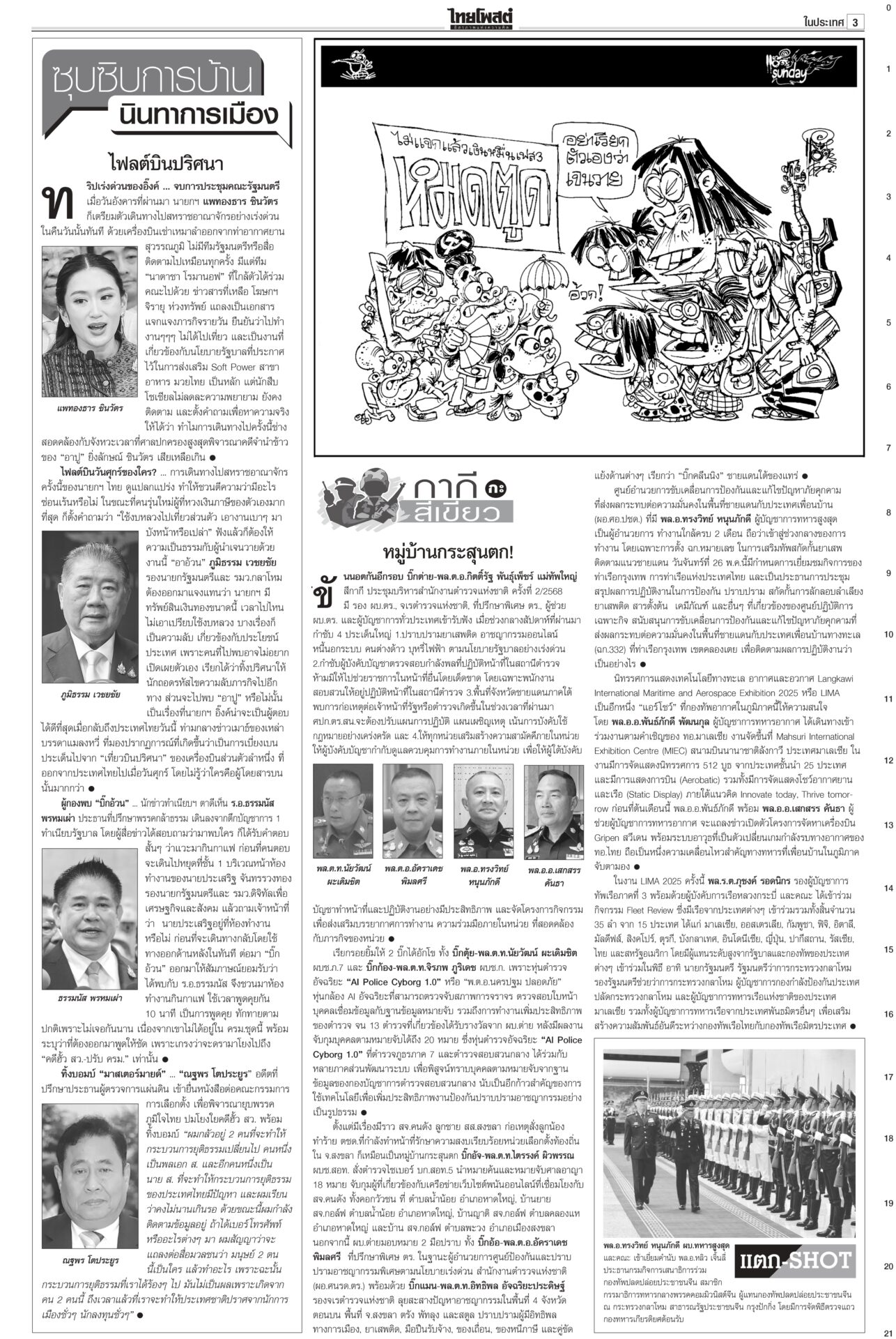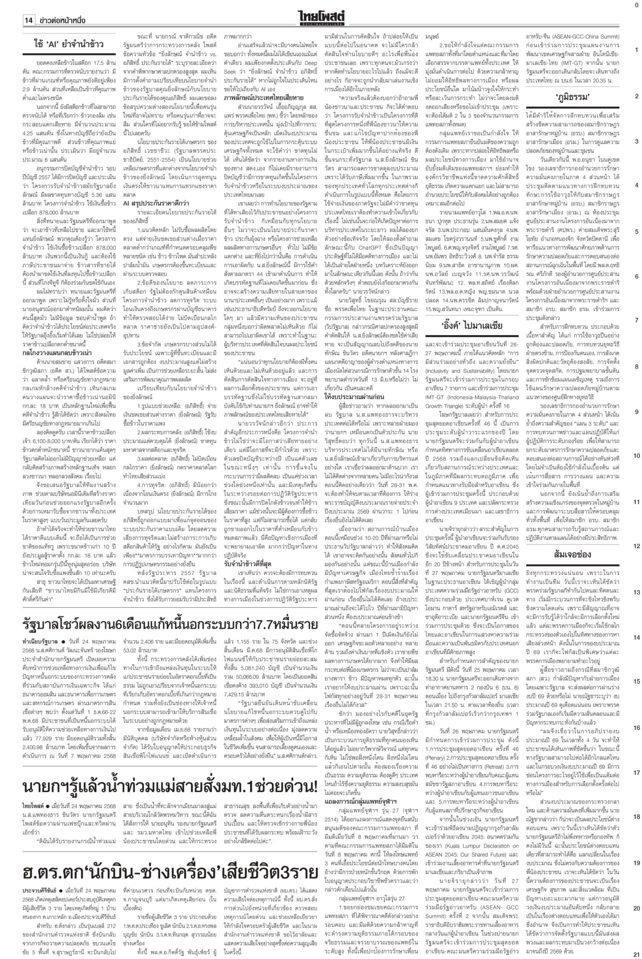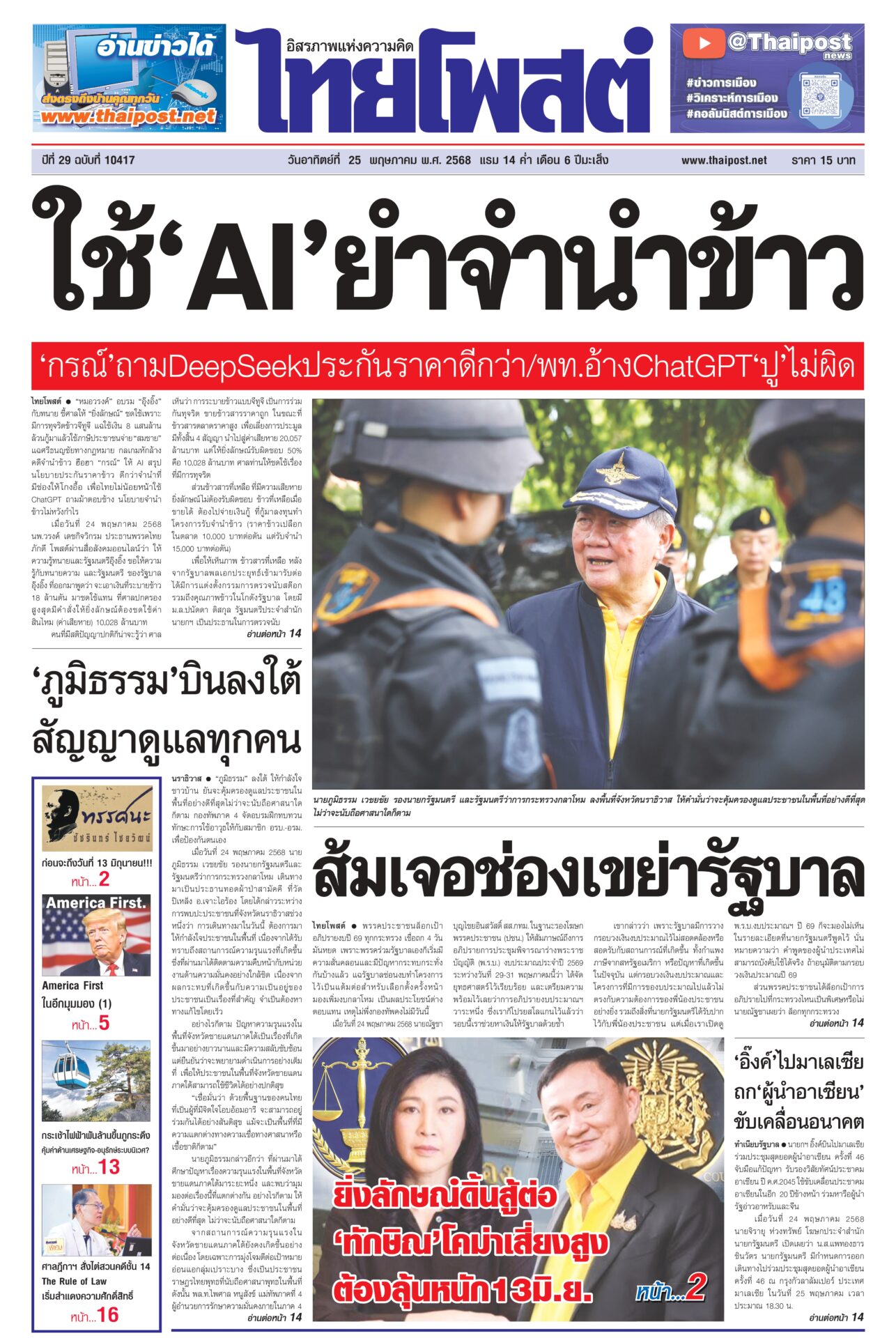 หนังสือพิมพ์ฉบับวันที่ 25 พฤษภาคม 2568ข่าวหน้าหนึ่งใช้‘AI’ย้ำจำนำข้าว ‘กรณ์’ถามDeepSeekประกันราคาดีกว่า / พท.อ้างChatGPT ‘ปู’ ไม่ผิด“หมอวรงค์” อบรม “อุ๊งอิ๊ง” กับทนาย ชี้ศาลให้ “ยิ่งลักษณ์” ชดใช้เพราะมีการทุจริตข้าวจีทูจี แฉใช้เงิน 8 แสนล้านล้วนกู้มาแล้วใช้ภาษีประชาชนจ่าย “สมชาย” แฉศรีธนญชัยทางกฎหมาย ‘อิ๊งค์’ ไปมาเลเซีย ถก ‘ผู้นำอาเซียน’ ขับเคลื่อนอนาคตนายกฯ อิ๊งค์บินไปมาเลเซีย ร่วมประชุมสุดยอดผู้นำอาเซียน ครั้งที่ 46 จับมือแก้ปัญหา รับรองวิสัยทัศน์ประชาคมอาเซียน ปี ค.ศ.2045 ใช้ขับเคลื่อนประชาคมอาเซียนในอีก ส้มเจอช่องเขย่ารัฐบาลพรรคประชาชนล็อกเป้า อภิปรายงบปี 69 ทุกกระทรวง เชื่้อถก 4 วันมันหยด เพราะพรรคร่วมรัฐบาลเองก็เริ่มมีความสั่นคลอนและมีปัญหากระทบกระทั่งกันบ้างแล้ว แฉรัฐบาลซ่อนงบทำ ‘ภูมิธรรม’บินลงใต้ สัญญาดูแลทุกคน“ภูมิธรรม” ลงใต้ ให้กำลังใจชาวบ้าน ยันจะคุ้มครองดูแลประชาชนในพื้นที่อย่างดีที่สุดไม่ว่าจะนับถือศาสนาใดก็ตาม กองทัพภาค 4 จัดอบรมฝึกทบทวนทักษะการใช้อาวุธให้กับสมาชิก