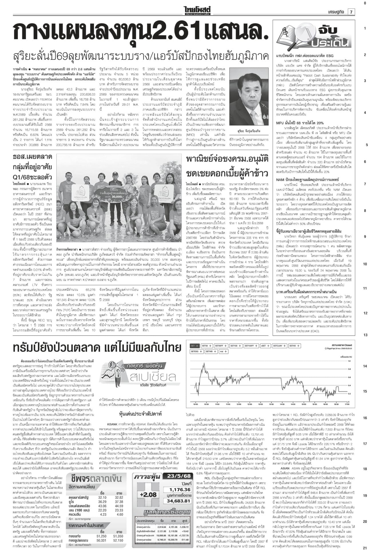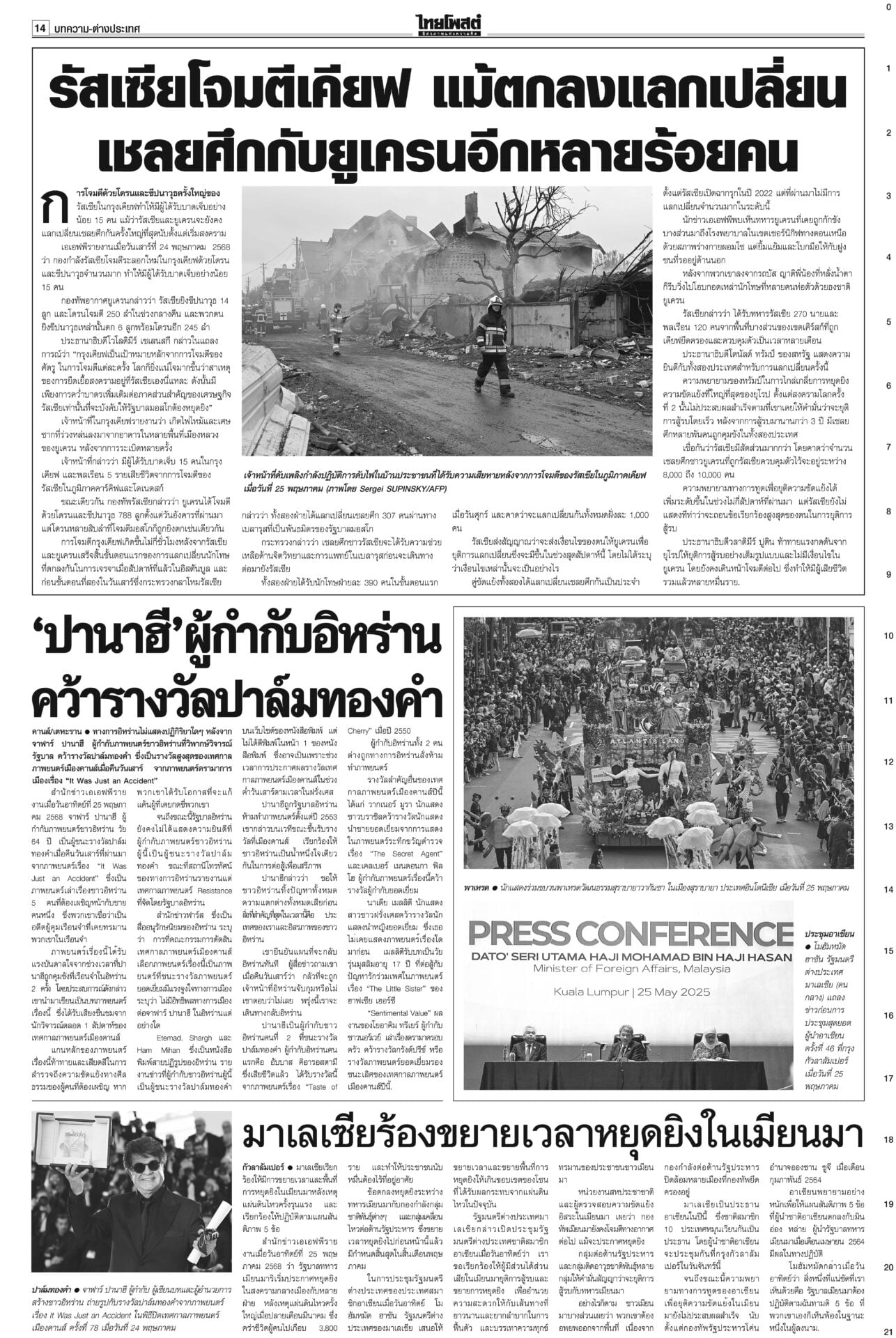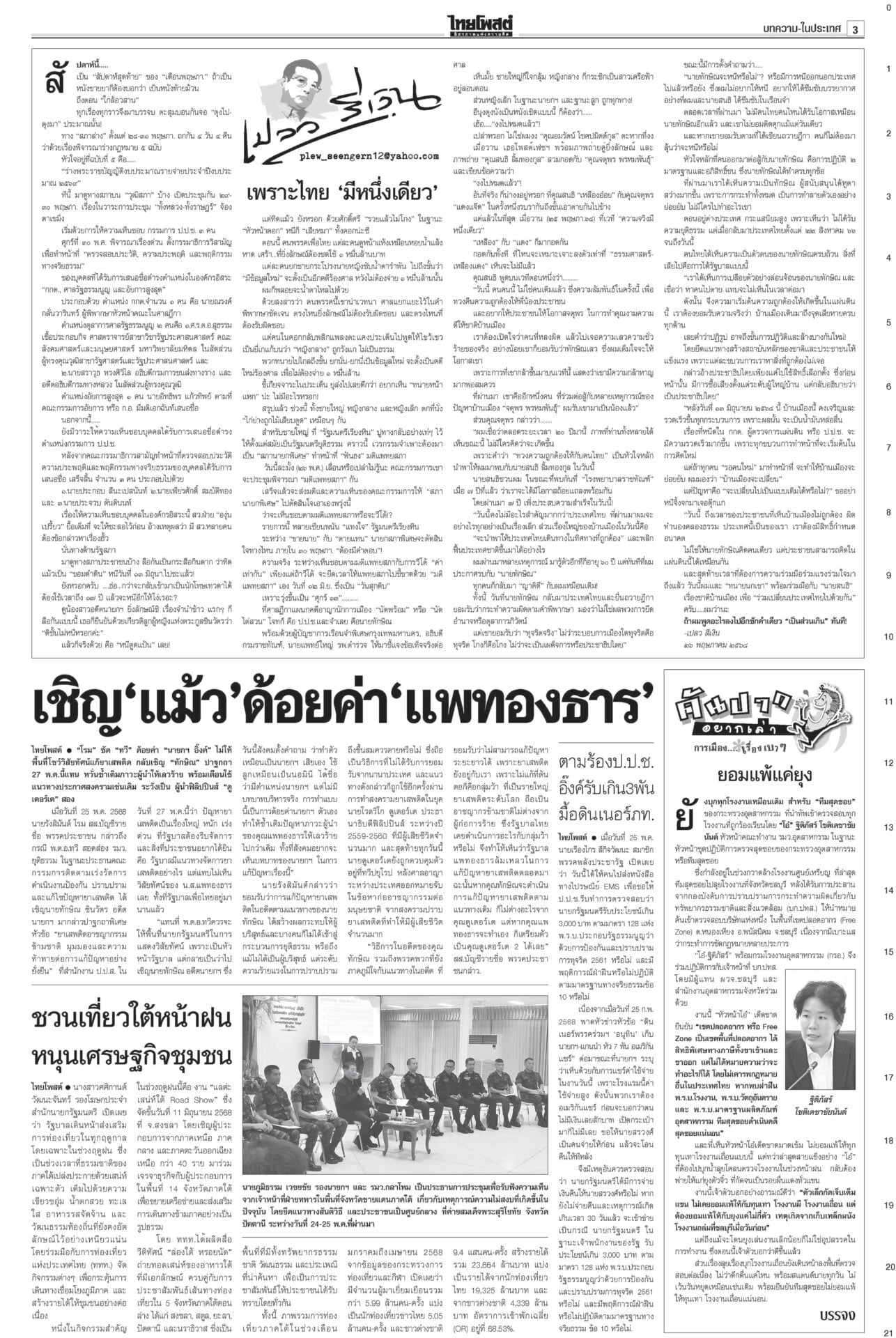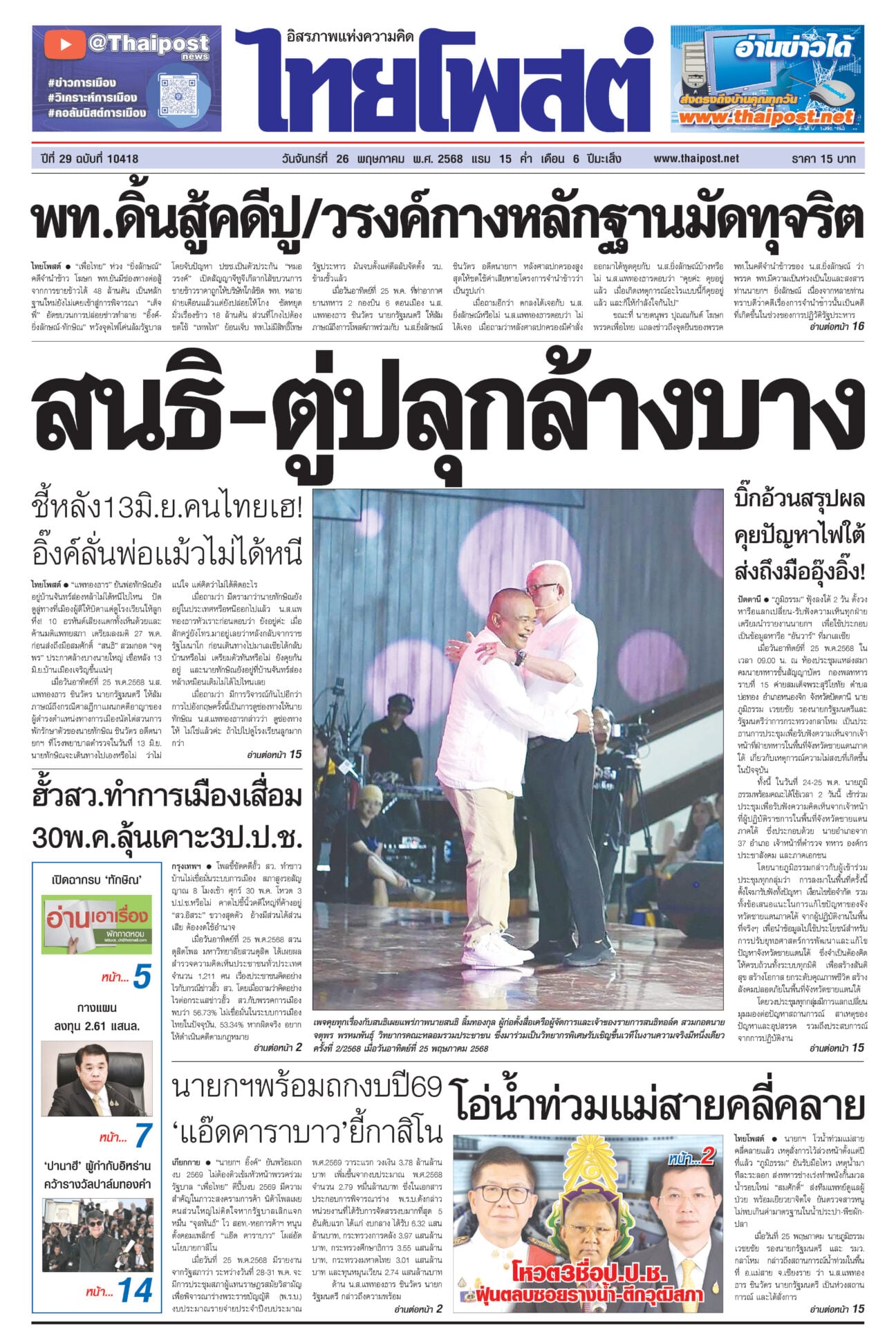 หนังสือพิมพ์ ฉบับวันที่ 26 พฤษภาคม 2568ข่าวหน้าหนึ่งสนธิ-ตู่ปลุกล้างบาง ชี้หลัง13มิ.ย.คนไทยเฮ! อิ๊งค์ลั่นพ่อแม้วไม่ได้หนี“แพทองธาร” ยันพ่อทักษิณยังอยู่บ้านจันทร์ส่องหล้าไม่ได้หนีไปไหน นายกฯพร้อมถกงบปี69 ‘แอ๊ดคาราบาว’ยี้กาสิโน“นายกฯ อิ๊งค์” ยันพร้อมถกงบ 2569 ไม่ต้องติวเข้มหัวหน้าพรรคร่วมรัฐบาล พท.ดิ้นสู้คดีปู/วรงค์กางหลักฐานมัดทุจริต“เพื่อไทย” ห่วง “ยิ่งลักษณ์” คดีจำนำข้าว โฆษก พท.ยันมีช่องทางต่อสู้จากการขายข้าวได้ 48 ล้านตัน ฮั้วสว.ทำการเมืองเสื่อม 30พ.ค.ลุ้นเคาะ3ป.ป.ช.โพลชี้ชัดคดีฮั้ว สว. ทำชาวบ้านไม่เชื่อมั่นระบบการเมือง สภาสูงรอสัญญาณ 8 โมงเช้า บิ๊กอ้วนสรุปผล คุยปัญหาไฟใต้ ส่งถึงมืออุ๊งอิ๊ง!“ภูมิธรรม” ฟุ้งลงใต้ 2 วัน ตั้งวงหารือแลกเปลี่ยน-รับฟังความเห็นทุกฝ่าย โอ่น้ำท่วมแม่สายคลี่คลายนายกฯ โวน้ำท่วมแม่สายคลี่คลายแล้ว เหตุสั่งการไว้ล่วงหน้าตั้งแต่ปีที่แล้ว