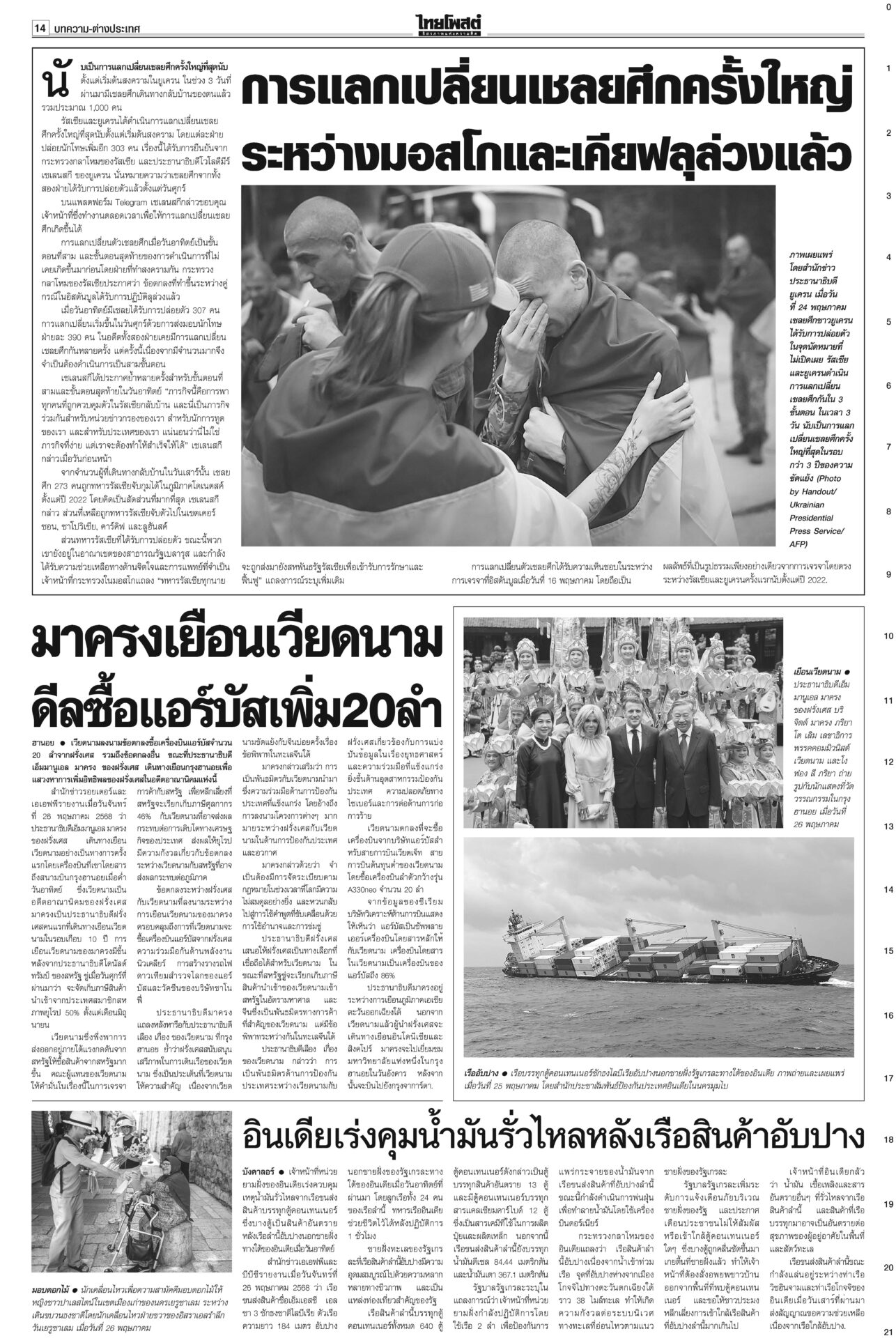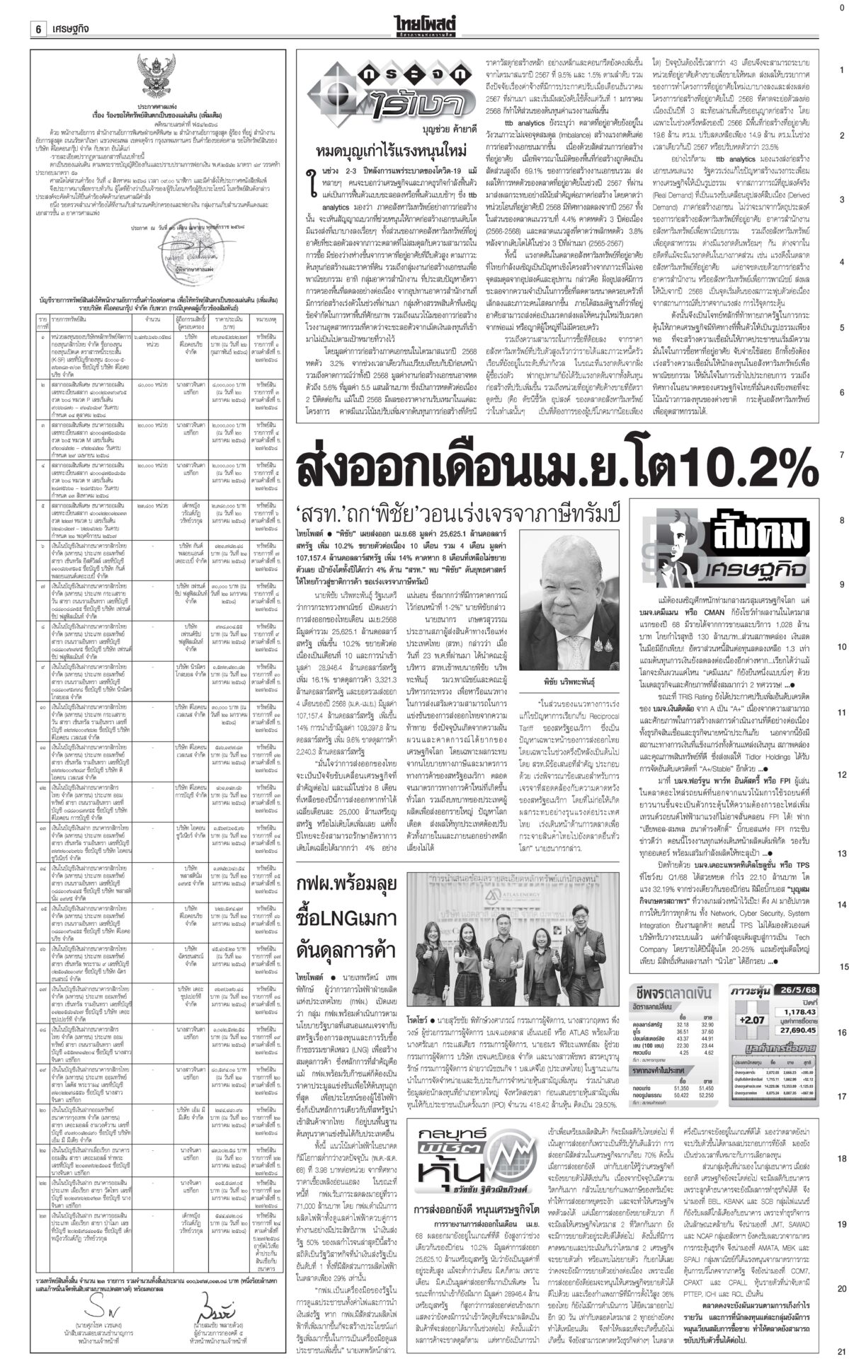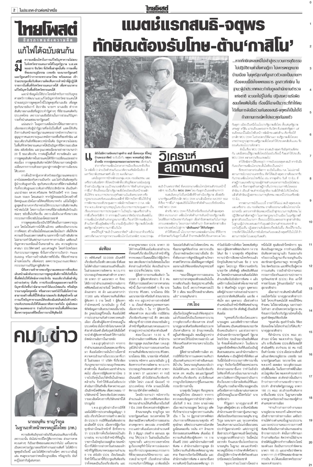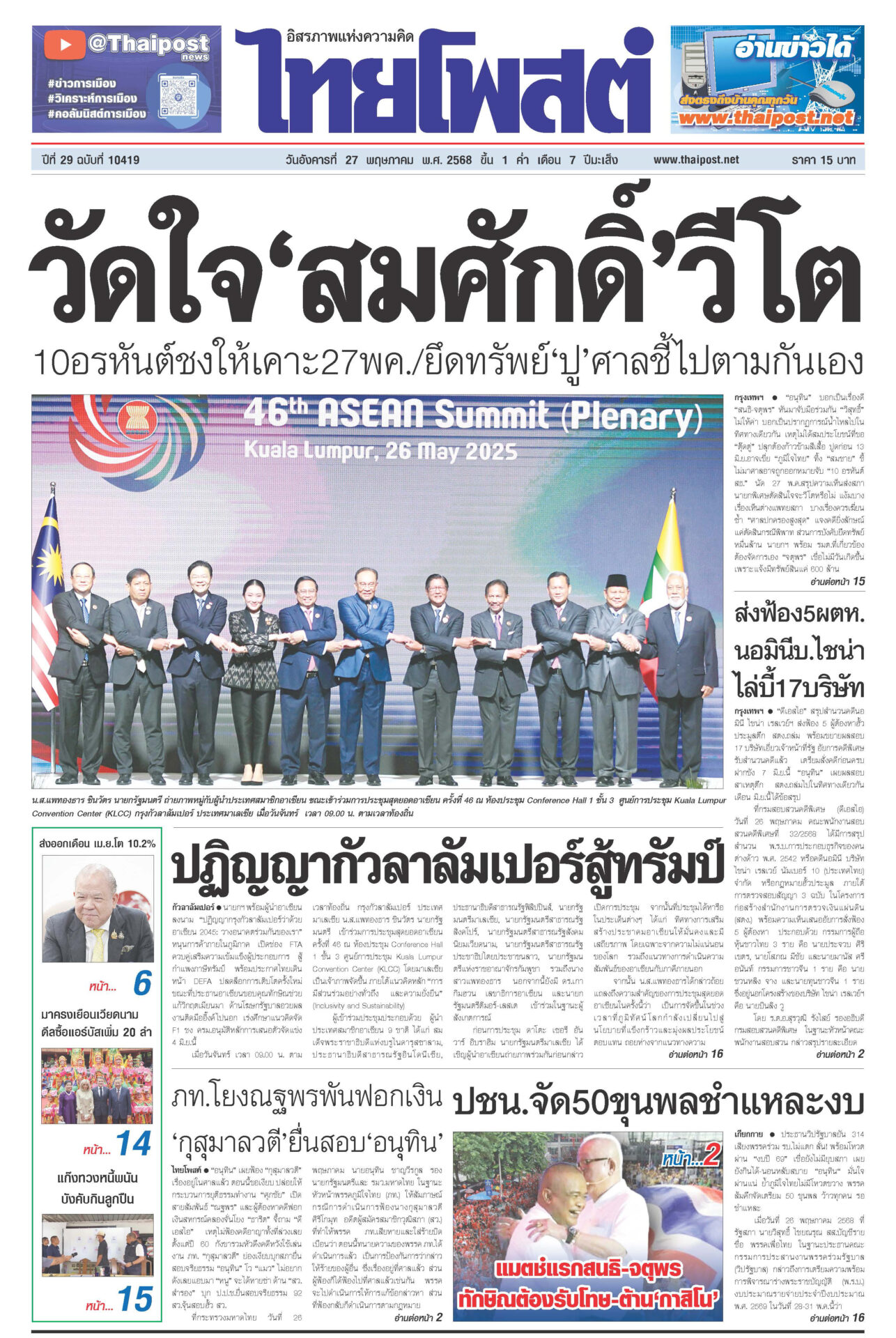 หนังสือพิมพ์ ฉบับวันที่ 27 พฤษภาคม 2568ข่าวหน้าหนึ่งวัดใจ‘สมศักดิ์’วีโต 10อรหันต์ชงให้เคาะ27พค./ยึดทรัพย์‘ปู’ศาลชี้ไปตามกันเอง“อนุทิน” บอกเป็นเรื่องดี “สนธิ-จตุพร” หันมาจับมือร่วมกัน “วิสุทธิ์” ไม่ให้ค่า ปฏิญญากัวลาลัมเปอร์สู้ทรัมป์นายกฯ พร้อมผู้นำอาเซียนลงนาม “ปฏิญญากรุงกัวลาลัมเปอร์ว่าด้วยอาเซียน 2045 ส่งฟ้อง5ผตห. นอมินี บ.ไชน่า ไล่บี้17บริษัท“ดีเอสไอ” สรุปสำนวนคดีนอมินี ไชน่า เรลเวย์ฯ ส่งฟ้อง 5 ผู้ต้องหาฮั้วประมูลตึก สตง.ถล่ม พร้อมขยายผลสอบ 17 บริษัทเอี่ยวเจ้าหน้าที่รัฐ ภท.โยงณฐพรพันฟอกเงิน ‘กุสุมาลวตี’ยื่นสอบ‘อนุทิน’“อนุทิน” เผยฟ้อง “กุสุมาลวตี” เรื่องอยู่ในศาลแล้ว ตอนนี้ขอเงียบ ปชน.จัด50ขุนพลชำแหละงบประธานวิปรัฐบาลยัน 314 เสียงพรรคร่วม รบ.ไม่แตก ลั่น! พร้อมโหวตผ่าน “งบปี 69”