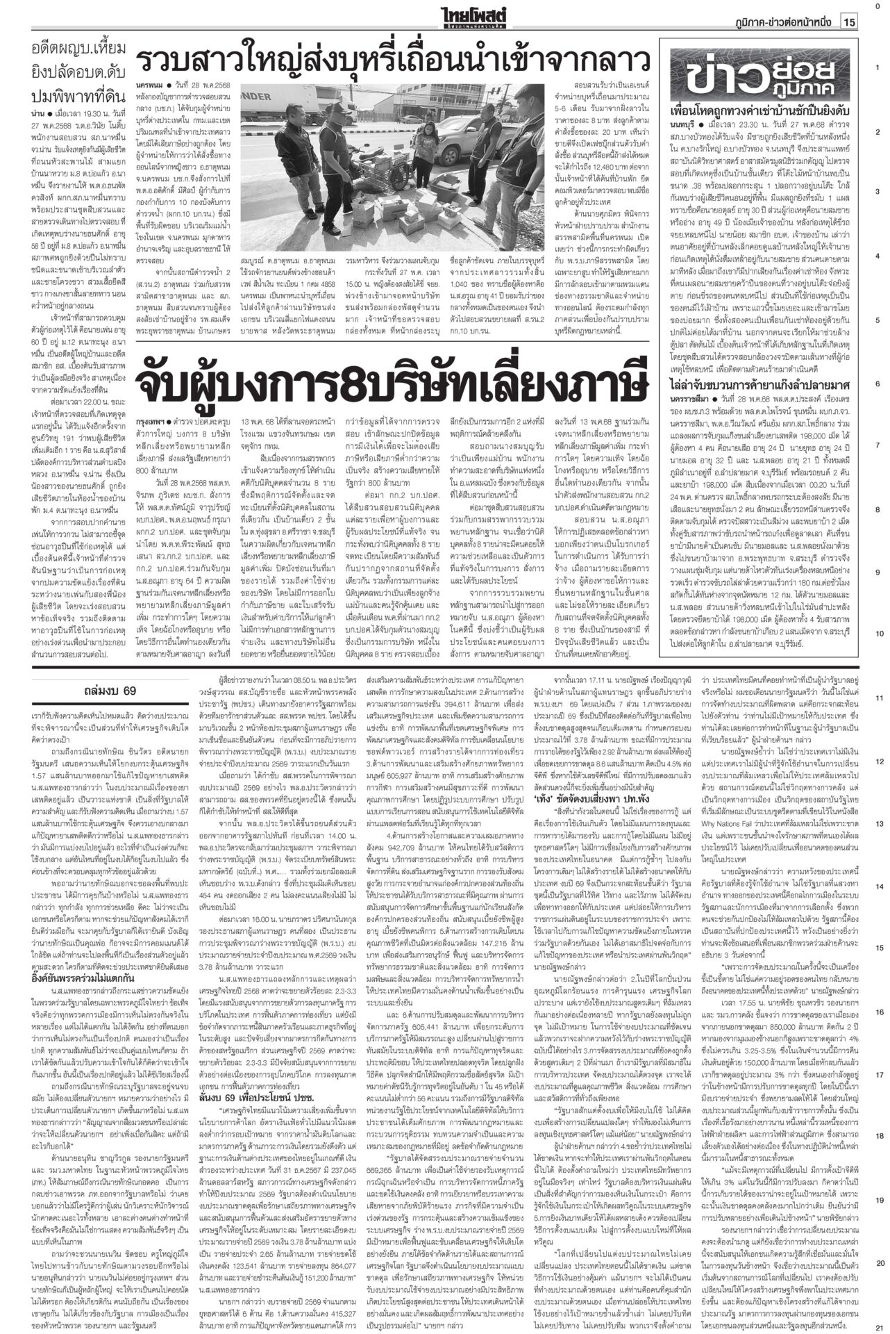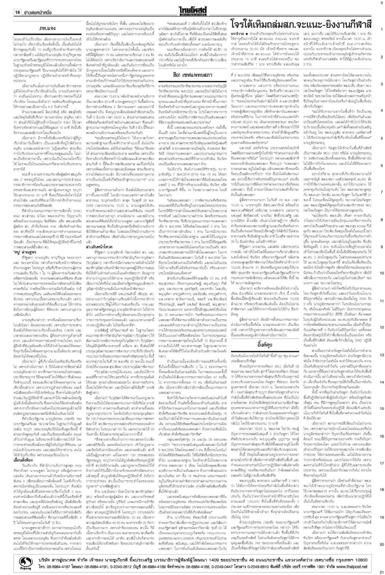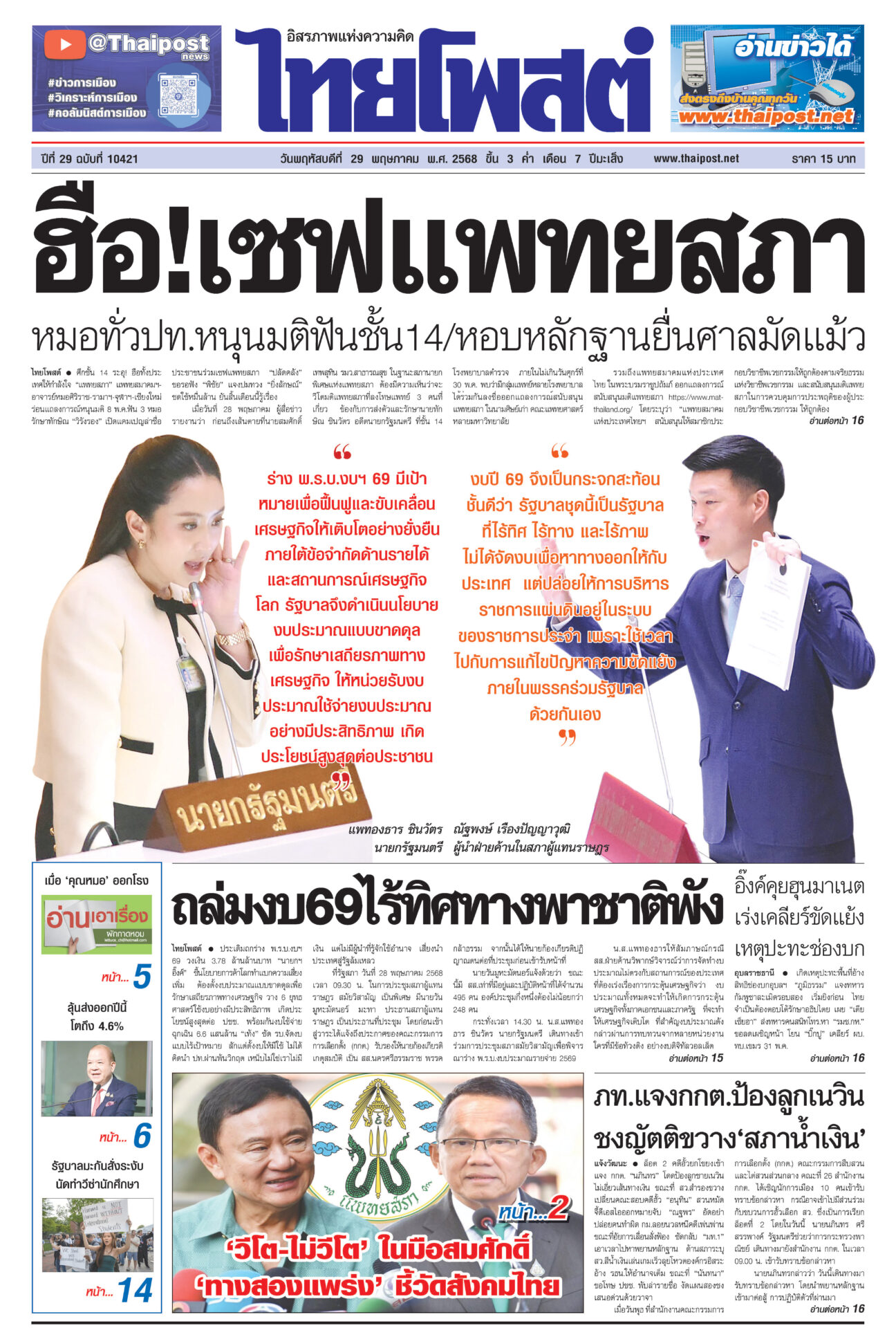หนังสือพิมพ์ ฉบับวันที่ 29 พฤษภาคม 2568ข่าวหน้าหนึ่งฮือ!เซฟแพทยสภา หมอทั่วปท.หนุนมติฟันชั้น14/หอบหลักฐานยื่นศาลมัดแม้วศึกชั้น 14 ระอุ! ฮือทั้งประเทศให้กำลังใจ “แพทยสภา” แพทยสมาคมฯ-อาจารย์หมอศิริราช-รามาฯ-จุฬาฯ-เชียงใหม่ ถล่มงบ69ไร้ทิศทางพาชาติพังประเดิมถกร่าง พ.ร.บ.งบฯ 69 วงเงิน 3.78 ล้านล้านบาท “นายกฯ อิ๊งค์” ชี้นโยบายการค้าโลกทำแบกความเสี่ยงเพิ่ม ภท.แจงกกต.ป้องลูกเนวิน ชงญัตติขวาง‘สภาน้ำเงิน’ล็อต 2 คดีฮั้วยกโขยงเข้าแจง กกต. “นภินทร” โดดป้องลูกชายเนวิน อิ๊งค์คุยฮุนมาเนต เร่งเคลียร์ขัดแย้ง เหตุปะทะช่องบกเกิดเหตุปะทะพื้นที่อ้างสิทธิช่องบกอุบลฯ “ภูมิธรรม” แจงทหารกัมพูชาละเมิดรอบสอง