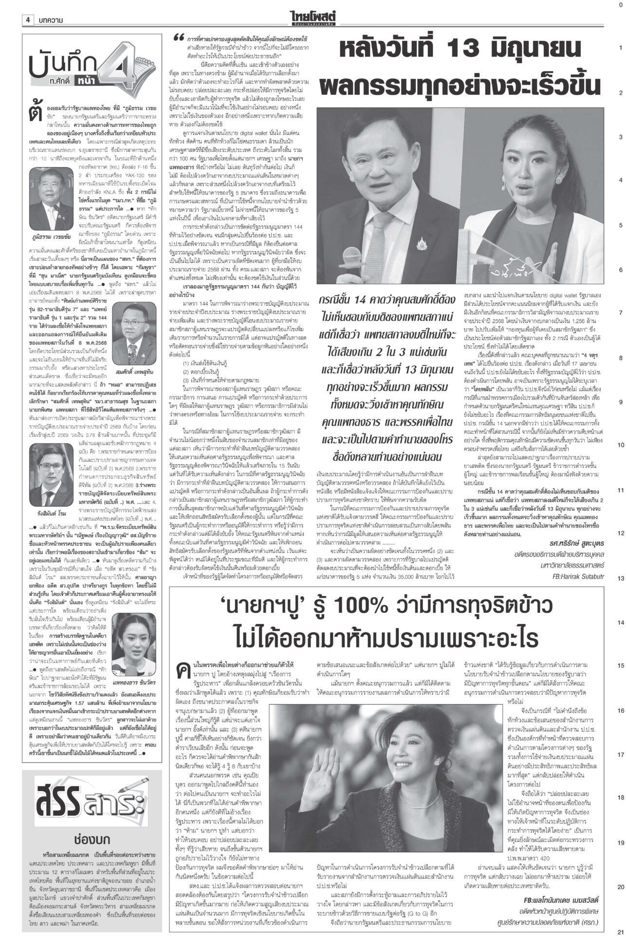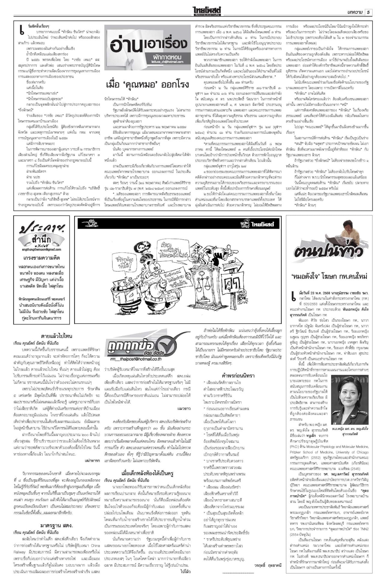 ฉบับวันที่ 29 พฤษภาคม 2568 29 พฤษภาคม 2568 เวลา 0:01 น. หนังสือพิมพ์ ฉบับวันที่ 29 พฤษภาคม 2568ข่าวหน้าหนึ่งฮือ!เซฟแพทยสภา หมอทั่วปท.หนุนมติฟันชั้น14/หอบหลักฐานยื่นศาลมัดแม้วศึกชั้น 14 ระอุ! ฮือทั้งประเทศให้กำลังใจ “แพทยสภา” แพทยสมาคมฯ-อาจารย์หมอศิริราช-รามาฯ-จุฬาฯ-เชียงใหม่ ถล่มงบ69ไร้ทิศทางพาชาติพังประเดิมถกร่าง พ.ร.บ.งบฯ 69 วงเงิน 3.78 ล้านล้านบาท “นายกฯ อิ๊งค์” ชี้นโยบายการค้าโลกทำแบกความเสี่ยงเพิ่ม ภท.แจงกกต.ป้องลูกเนวิน ชงญัตติขวาง‘สภาน้ำเงิน’ล็อต 2 คดีฮั้วยกโขยงเข้าแจง กกต. “นภินทร” โดดป้องลูกชายเนวิน อิ๊งค์คุยฮุนมาเนต เร่งเคลียร์ขัดแย้ง เหตุปะทะช่องบกเกิดเหตุปะทะพื้นที่อ้างสิทธิช่องบกอุบลฯ “ภูมิธรรม” แจงทหารกัมพูชาละเมิดรอบสอง Tagsรายวันหนังสือพิมพ์ ข่าวที่เกี่ยวข้อง ฉบับวันที่ 6 ธันวาคม 2568 ฉบับวันที่ 5 ธันวาคม 2568 ฉบับวันที่ 4 ธันวาคม 2568 ฉบับวันที่ 3 ธันวาคม 2568 ฉบับวันที่ 2 ธันวาคม 2568 ฉบับวันที่ 1 ธันวาคม 2568 NEWS UPDATE 21:16 น. จนท.ปกครองเดินฝ่าดงหนาม 4 กม. จับหนุ่มซุกยาบ้าในรูปู 126 เม็ด 20:58 น. ชาวบ้านริมน้ำสาละวิน มึนข้อมูลราชการสุดสับสน ไม่แน่ใจปลา-พืชริมน้ำกินได้หรือไม่ 19:07 น. ลมหนาวมาอีกระลอก! กรมอุตุฯ พยากรณ์อากาศ 7 วันข้างหน้า อุณหภูมิจะลดลง 2-4 องศา 19:05 น. ภัยพิบัติสแกมเมอร์ | ห้องข่าวไทยโพสต์สุดสัปดาห์ 18:49 น. 'GULF-AIS'บอลไทยเพื่อคนไทย ร่วมหนุน'เกษตรศาสตร์ FC' สู้ศึกT2ยกกีฬาคู่การศึกษา