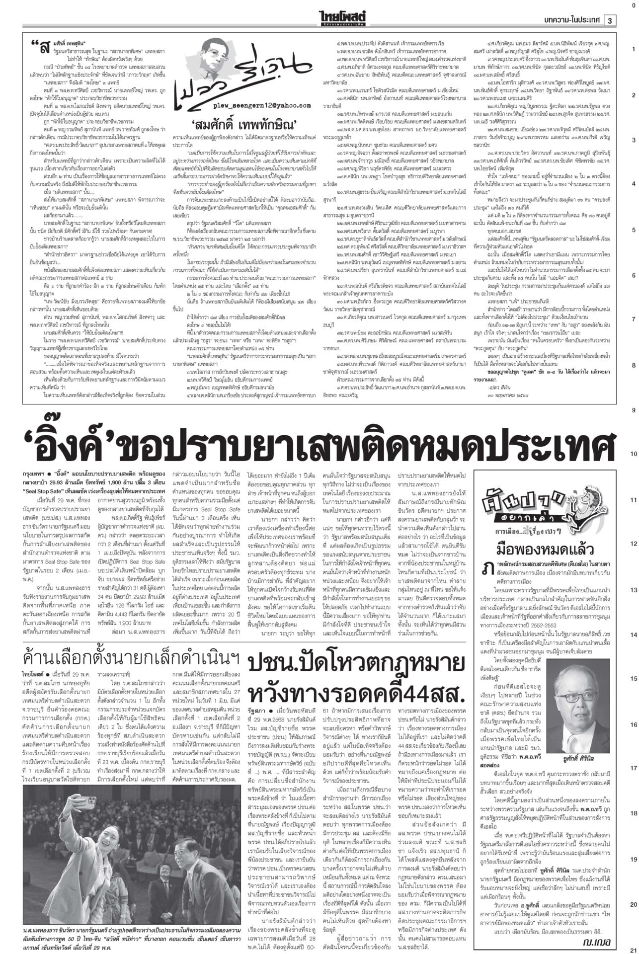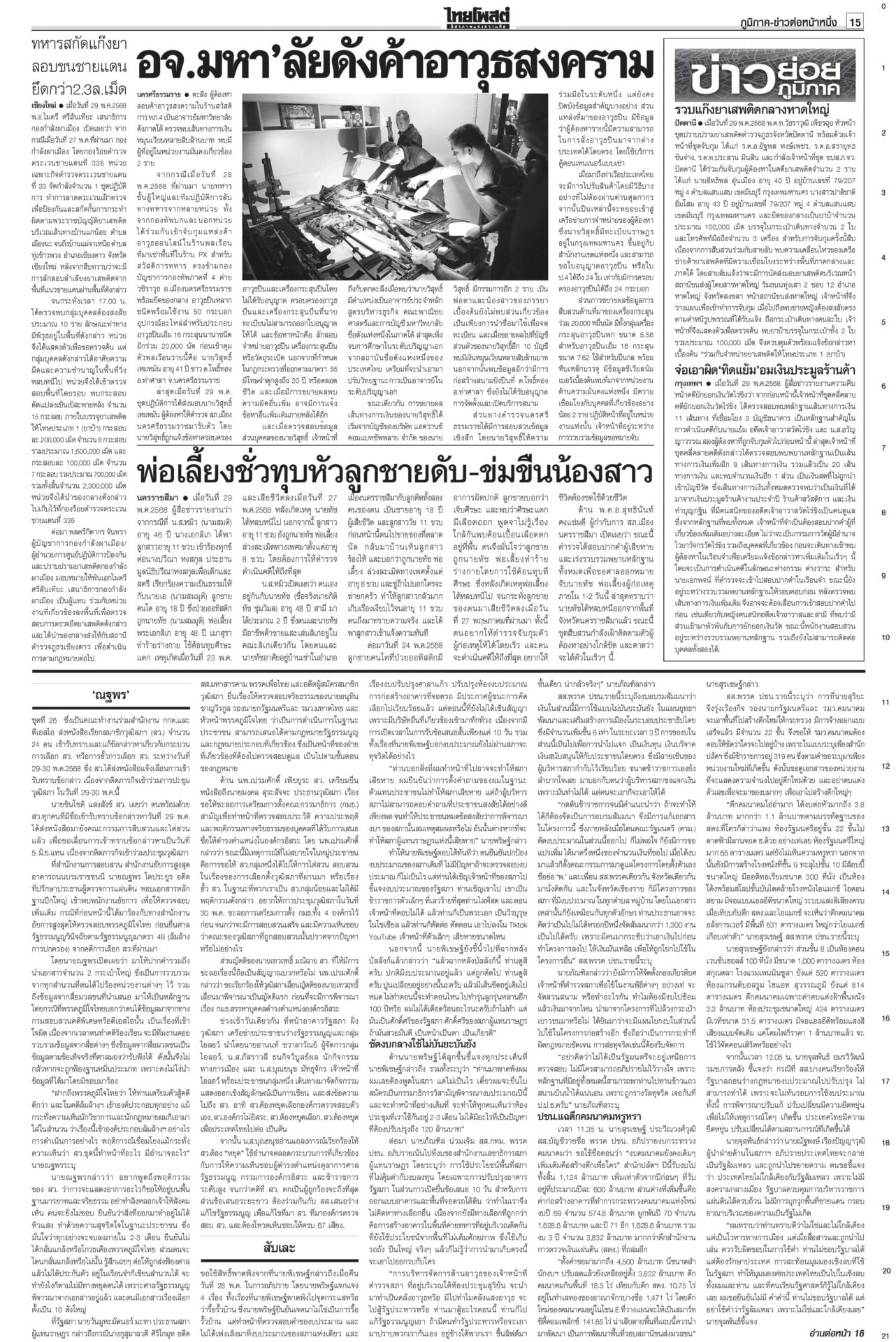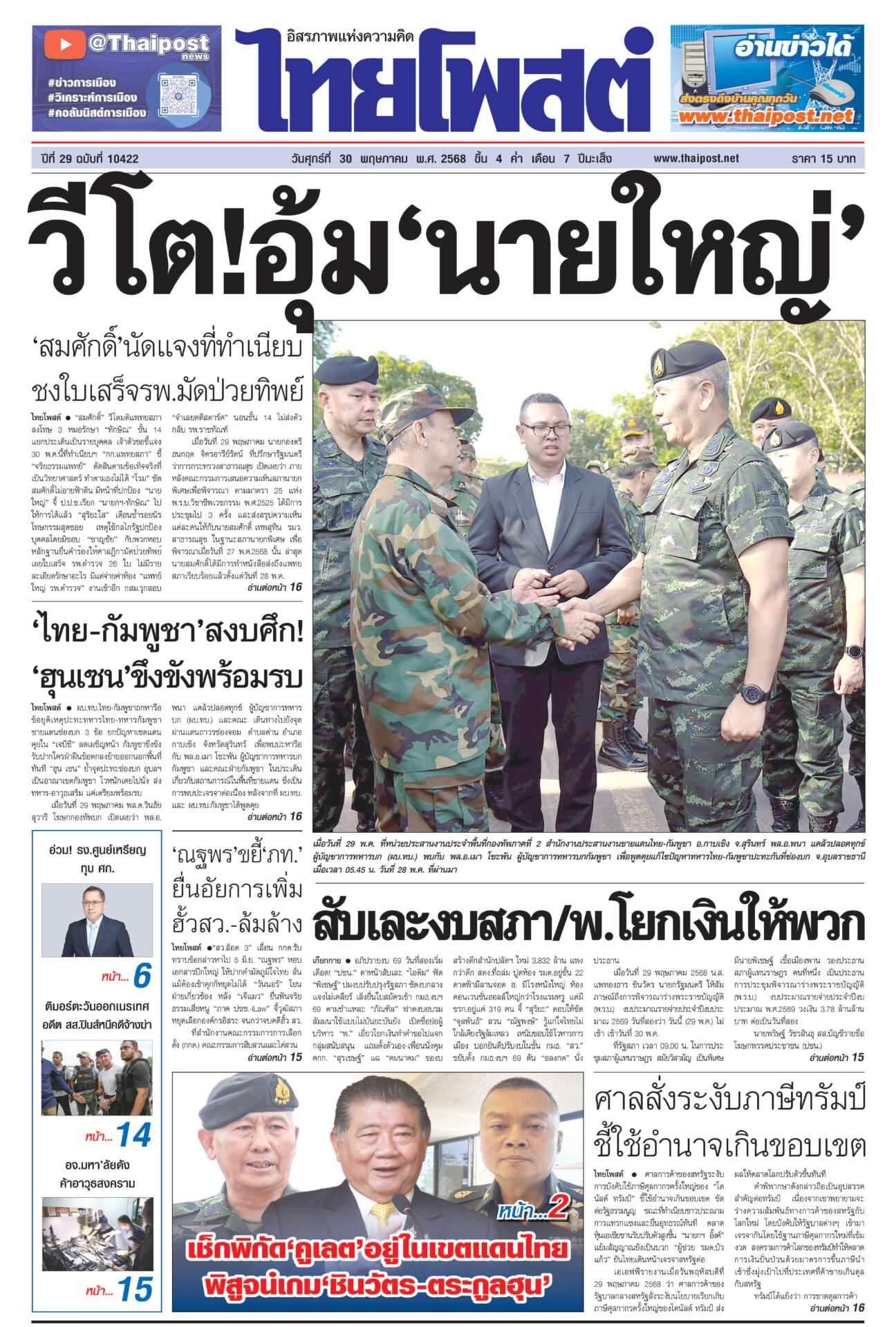 หนังสือพิมพ์ ฉบับวันที่ 30 พฤษภาคม 2568ข่าวหน้าหนึ่งวีโต!อุ้ม‘นายใหญ่’ ‘สมศักดิ์’นัดแจงที่ทำเนียบ ชงใบเสร็จรพ.มัดป่วยทิพย์“สมศักดิ์” วีโตมติแพทยสภาลงโทษ 3 หมอรักษา “ทักษิณ” ชั้น 14 แยกประเด็นเป็นรายบุคคล เจ้าตัวขอชี้แจง 30 พ.ค.นี้ที่ทำเนียบฯ สับเละงบสภา/พ.โยกเงินให้พวกอภิปรายงบ 69 วันที่สองเริ่มเดือด! “ปชน.” ดาหน้าสับเละ “ไอติม” ฟัด “พิเชษฐ์” ปมงบปรับปรุงรัฐสภา ซัดงบกลางแจงไม่เคลียร์ ‘ไทย-กัมพูชา’สงบศึก! ‘ฮุนเซน’ขึงขังพร้อมรบผบ.ทบ.ไทย-กัมพูชาถกหารือข้อยุติเหตุปะทะทหารไทย-ทหารกัมพูชาชายแดนช่องบก 3 ข้อ ‘ณฐพร’ขยี้‘ภท.’ ยื่นอัยการเพิ่ม ฮั้วสว.-ล้มล้าง“สว.ล็อต 3” เลื่อน กกต.รับทราบข้อกล่าวหาไป 5 มิ.ย. “ณฐพร” ศาลสั่งระงับภาษีทรัมป์ ชี้ใช้อำนาจเกินขอบเขตศาลการค้าของสหรัฐระงับการบังคับใช้ภาษีศุลกากรครั้งใหญ่ของ “โดนัลด์ ทรัมป์”