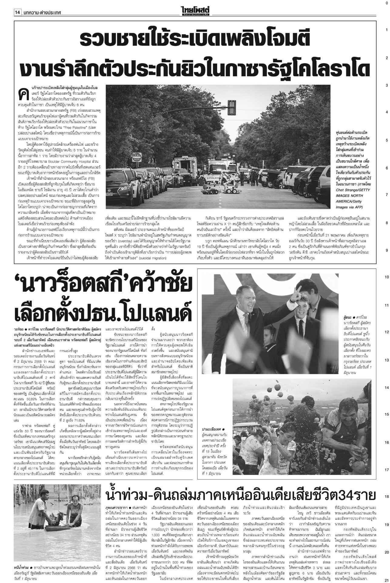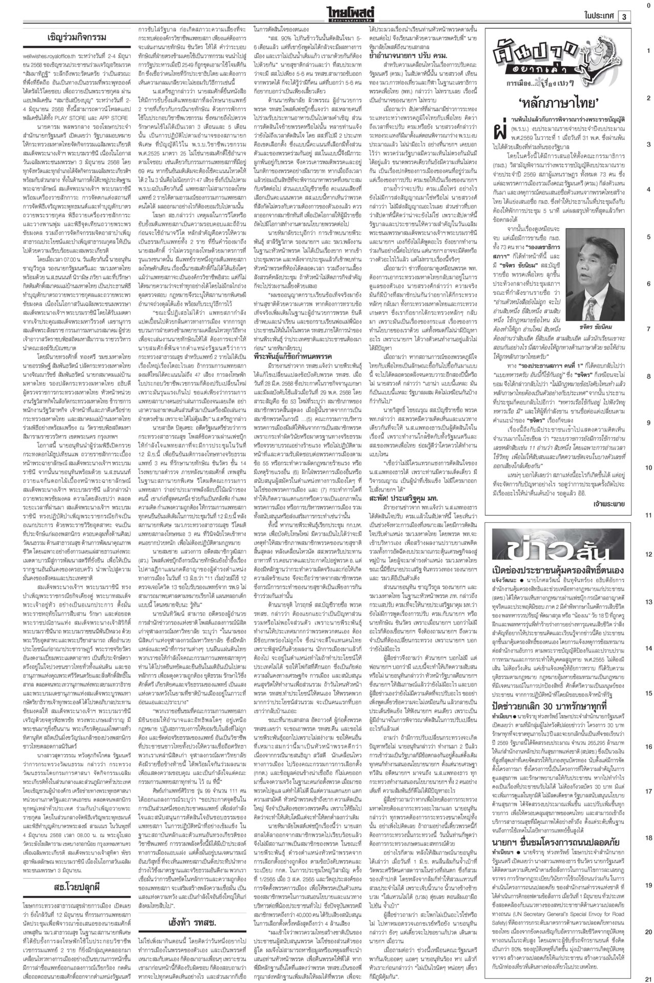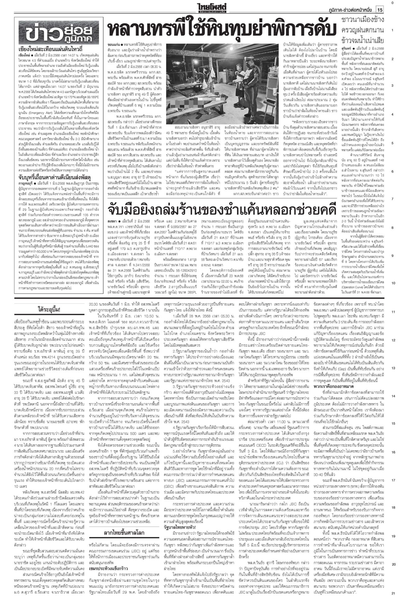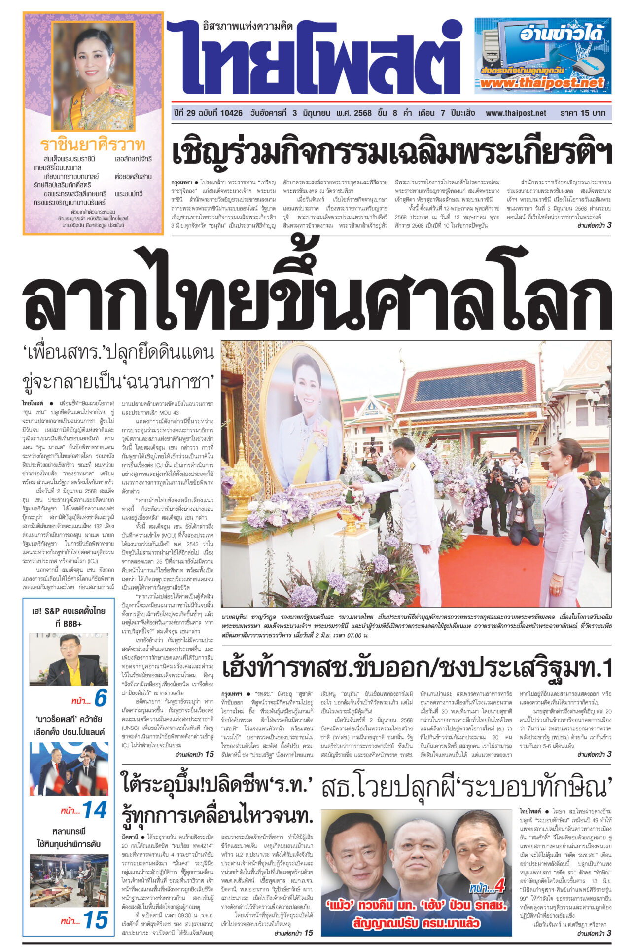 ฉบับวันที่ 3 มิถุนายน 2568 3 มิถุนายน 2568 เวลา 0:01 น. หนังสือพิมพ์ ฉบับวันที่ 3 มิถุนายน 2568ข่าวหน้าหนึ่งลากไทยขึ้นศาลโลก ‘เพื่อนสทร.’ปลุกยึดดินแดน ขู่จะกลายเป็น‘ฉนวนกาซา’เพื่อนซี้ทักษิณฉวยโอกาส! “ฮุน เซน” ปลุกยึดดินแดนไปจากไทย เชิญร่วมกิจกรรมเฉลิมพระเกียรติฯโปรดเกล้าฯ พระราชทาน “เหรียญราชรุจิทอง” แก่สมเด็จพระนางเจ้าฯ สธ.โวยปลุกผี‘ระบอบทักษิณ’โฆษก สธ.โทษฝ่ายตรงข้ามปลุกผี “ระบอบทักษิณ” เหมือนปี 49 ทำให้แพทยสภาแปดเปื้อนกลิ่นคาวทางการเมือง เฮ้งท้ารทสช.ขับออก/ชงประเสริฐมท.1“รทสช.” ยังระอุ “สุชาติ” ท้าขับออก พิสูจน์ว่าจะมีกี่คนที่ตามไปอยู่โอกาสใหม่ ใต้ระอุบึ้ม!ปลิดชีพ‘ร.ท.’ รู้ทุกการเคลื่อนไหวจนท.ใต้ระอุรายวัน คนร้ายฝังระเบิด 20 กก.ใต้ถนนปลิดชีพ “ผบ.ร้อย ทพ.4214” Tagsรายวันหนังสือพิมพ์ ข่าวที่เกี่ยวข้อง ฉบับวันที่ 6 ธันวาคม 2568 ฉบับวันที่ 5 ธันวาคม 2568 ฉบับวันที่ 4 ธันวาคม 2568 ฉบับวันที่ 3 ธันวาคม 2568 ฉบับวันที่ 2 ธันวาคม 2568 ฉบับวันที่ 1 ธันวาคม 2568 NEWS UPDATE 21:16 น. จนท.ปกครองเดินฝ่าดงหนาม 4 กม. จับหนุ่มซุกยาบ้าในรูปู 126 เม็ด 20:58 น. ชาวบ้านริมน้ำสาละวิน มึนข้อมูลราชการสุดสับสน ไม่แน่ใจปลา-พืชริมน้ำกินได้หรือไม่ 19:07 น. ลมหนาวมาอีกระลอก! กรมอุตุฯ พยากรณ์อากาศ 7 วันข้างหน้า อุณหภูมิจะลดลง 2-4 องศา 19:05 น. ภัยพิบัติสแกมเมอร์ | ห้องข่าวไทยโพสต์สุดสัปดาห์ 18:49 น. 'GULF-AIS'บอลไทยเพื่อคนไทย ร่วมหนุน'เกษตรศาสตร์ FC' สู้ศึกT2ยกกีฬาคู่การศึกษา