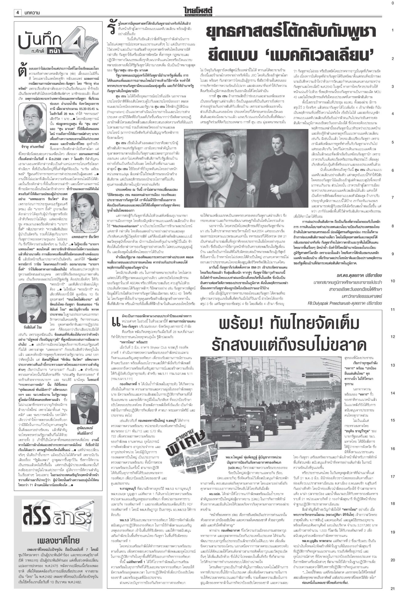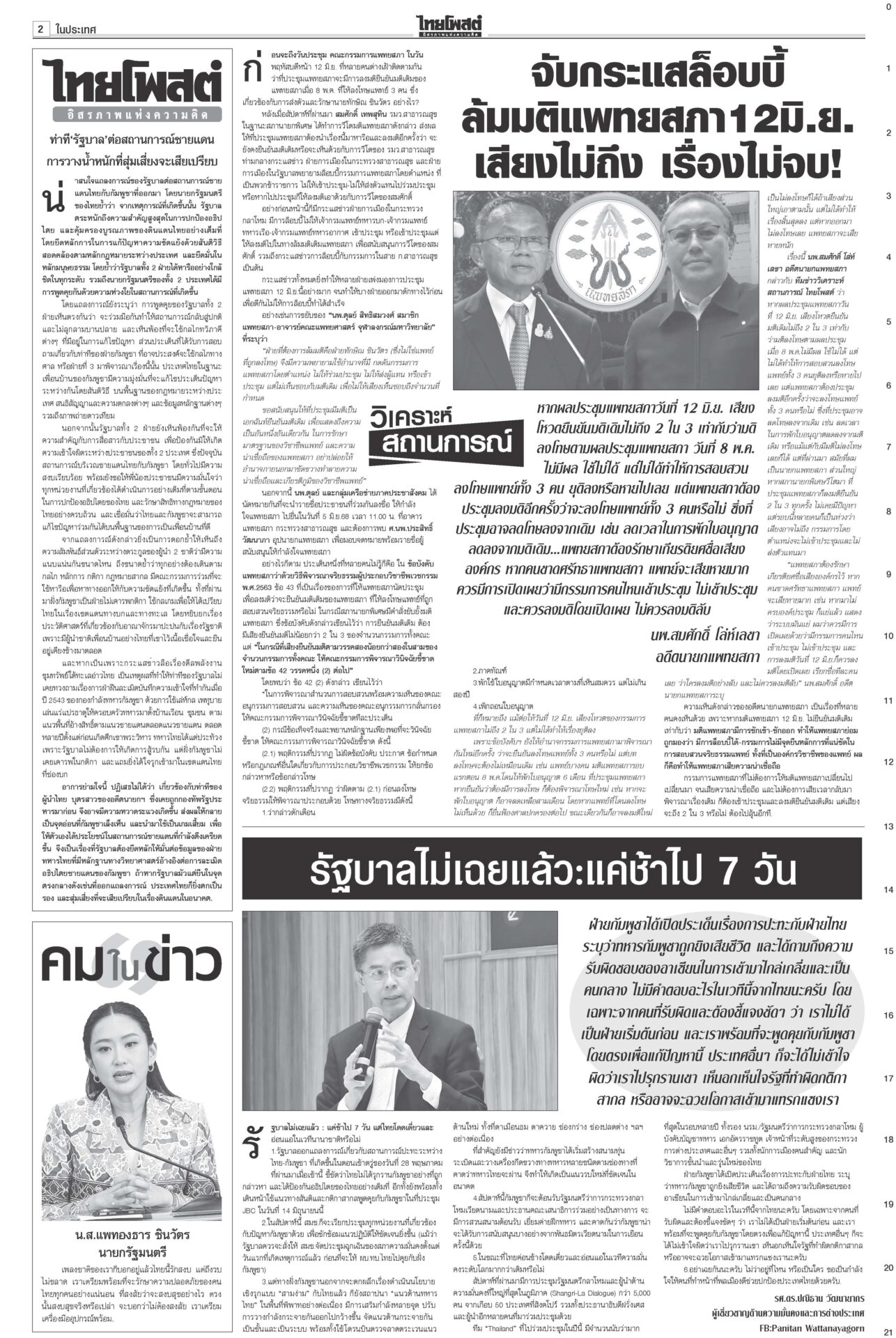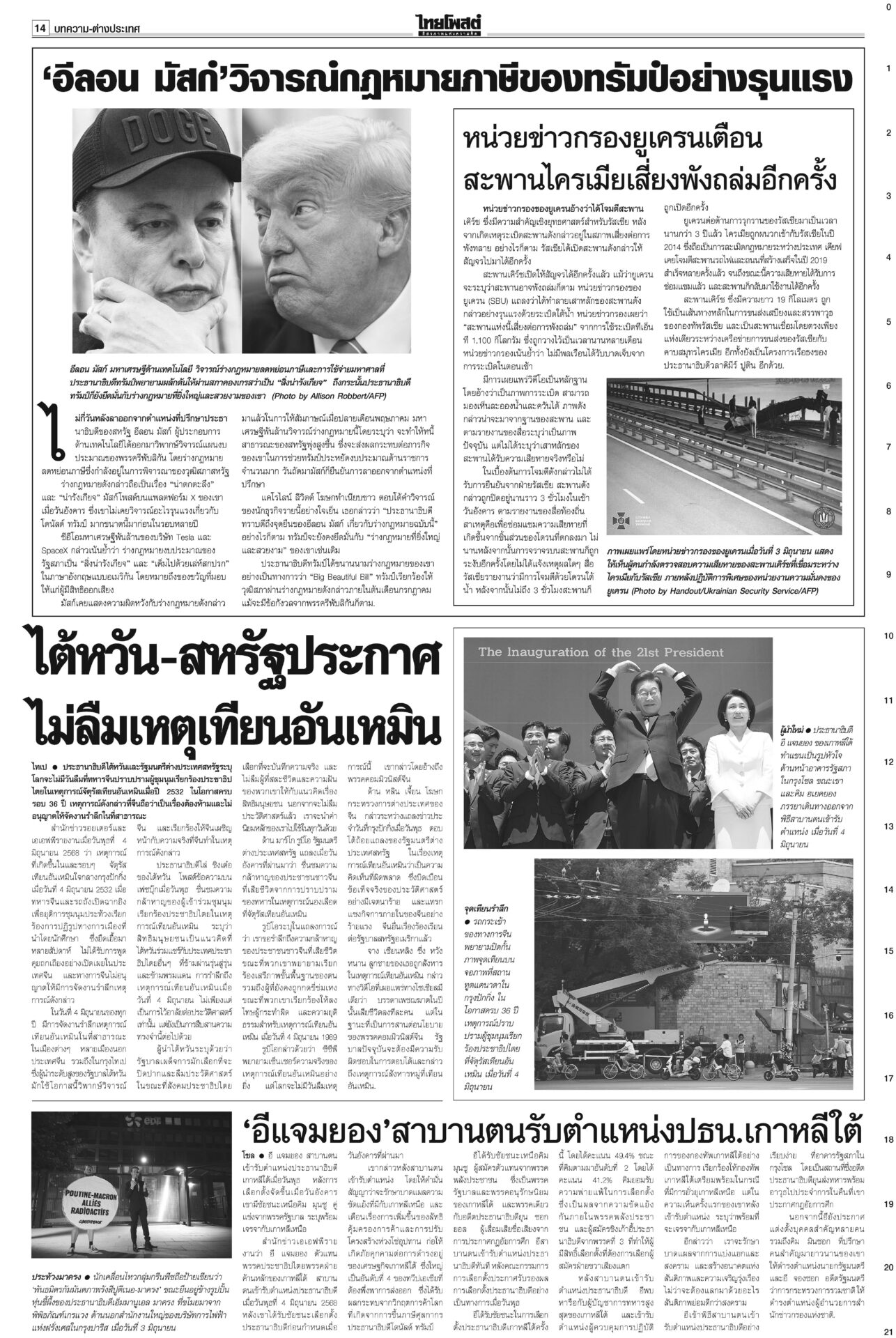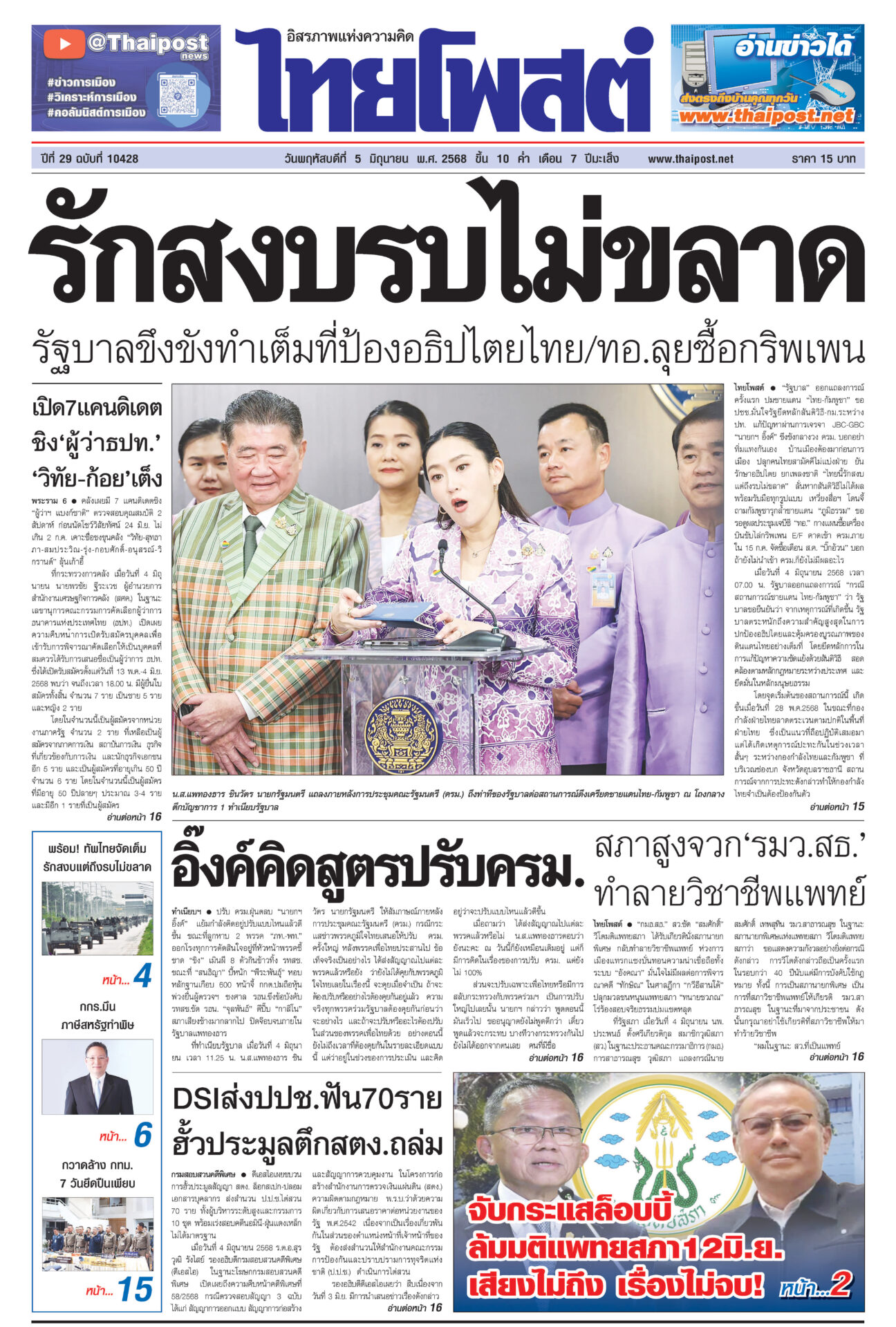 หนังสือพิมพ์ ฉบับวันที่ 5 มิถุนายน 2568ข่าวหน้าหนึ่งรักสงบรบไม่ขลาด รัฐบาลขึงขังทำเต็มที่ป้องอธิปไตยไทย/ทอ.ลุยซื้อกริพเพน“รัฐบาล” ออกแถลงการณ์ครั้งแรก ปมชายแดน “ไทย-กัมพูชา” ขอ ปชช.มั่นใจรัฐยึดหลักสันติวิธี-กม.ระหว่าง ปท อิ๊งค์คิดสูตรปรับครม.ปรับ ครม.ฝุ่นตลบ “นายกฯ อิ๊งค์” แย้มกำลังคิดอยู่ปรับแบบไหนแล้วดีขึ้น DSIส่งปปช.ฟัน70ราย ฮั้วประมูลตึกสตง.ถล่มดีเอสไอเผยขบวนการฮั้วประมูลสัญญา สตง. ล็อกสเปก-ปลอมเอกสารบุคลากร เปิด7แคนดิเดต ชิง‘ผู้ว่าธปท.’ ‘วิทัย-ก้อย’เต็งคลังเผยมี 7 แคนดิเดตชิง “ผู้ว่าฯ แบงก์ชาติ” ตรวจคุณสอบสมบัติ 2 สัปดาห์ สภาสูงจวก‘รมว.สธ.’ ทำลายวิชาชีพแพทย์“กมธ.สธ.” สว.ซัด “สมศักดิ์” วีโตมติแพทยสภา ได้รับเกียรตินั่งสภานายกพิเศษ