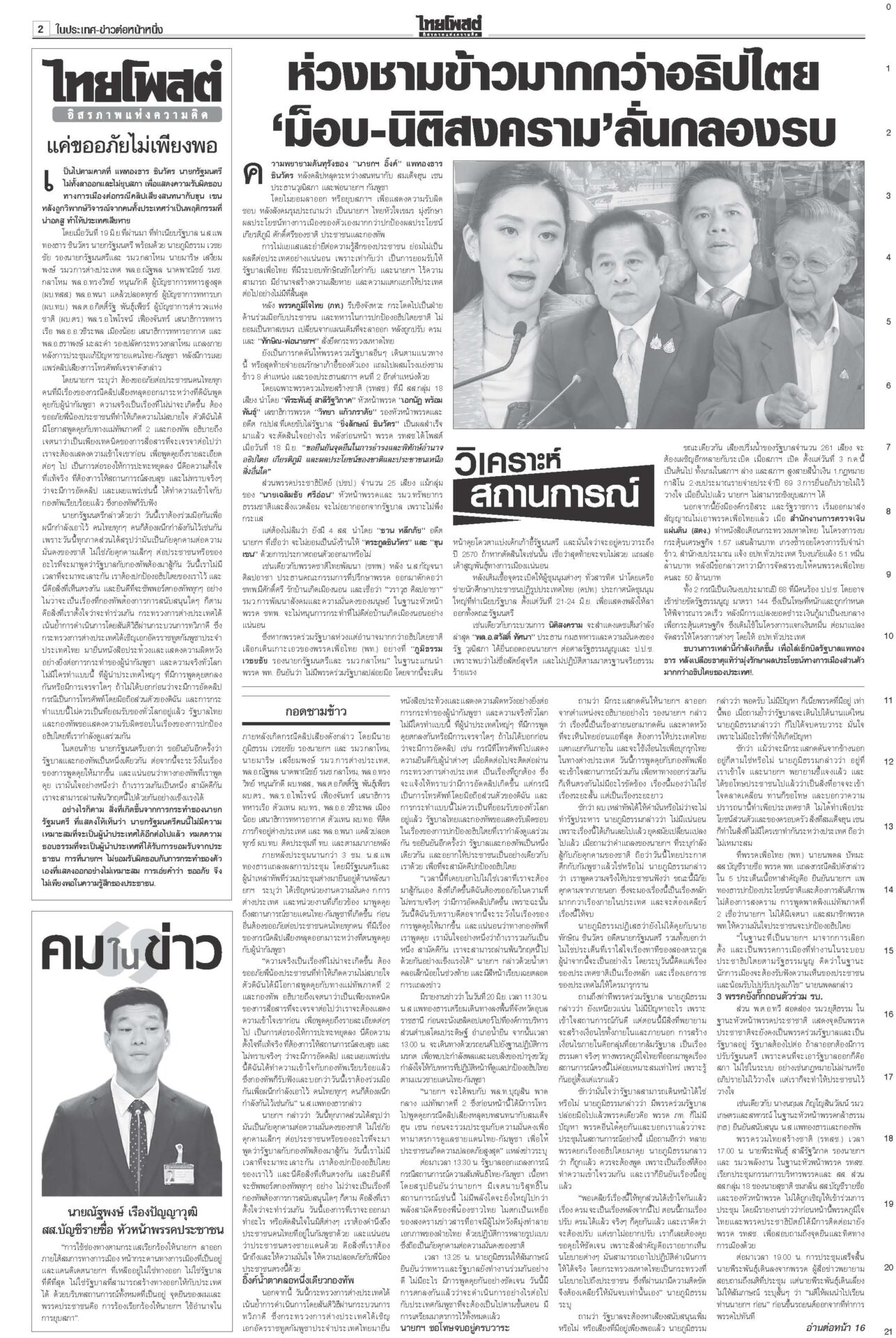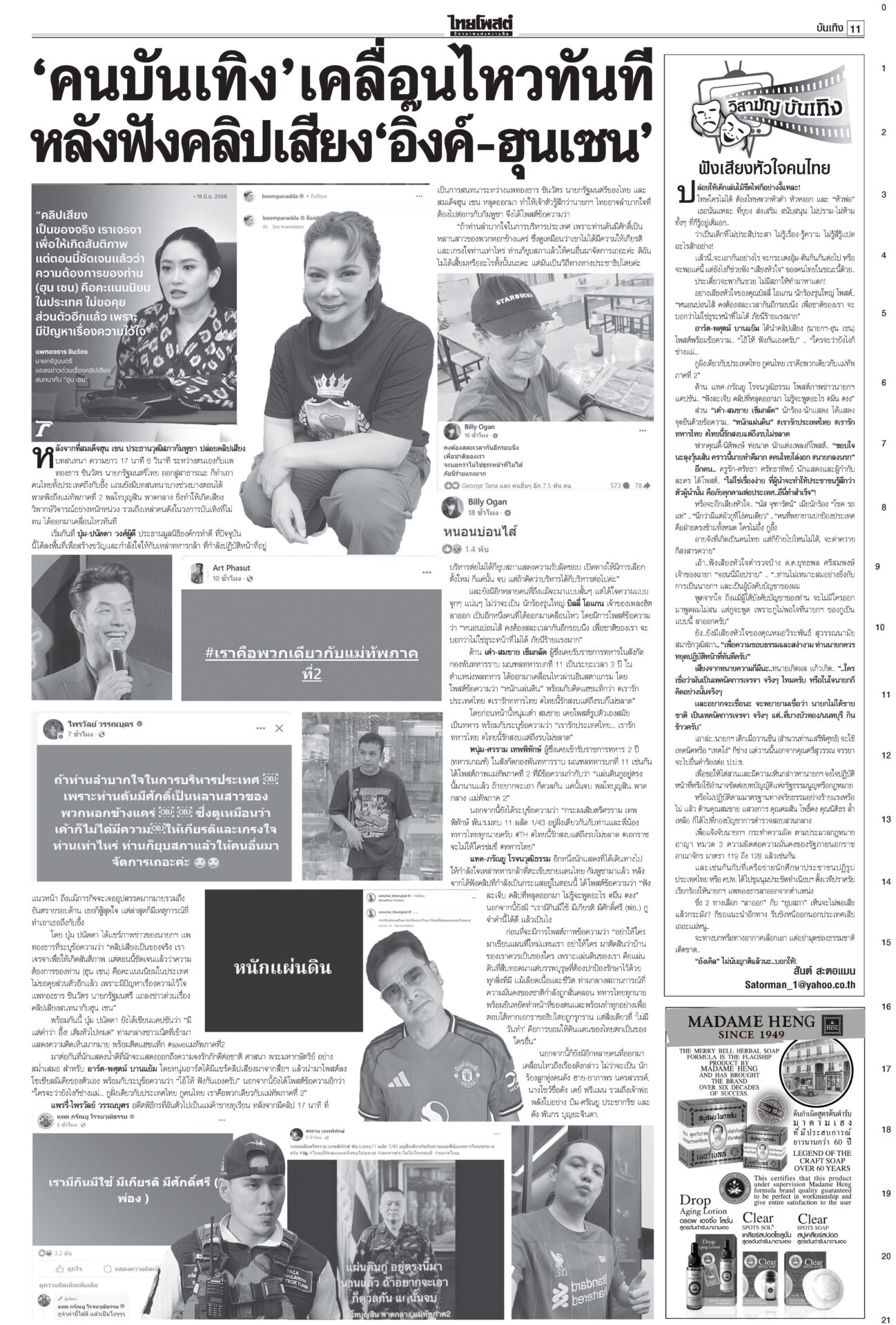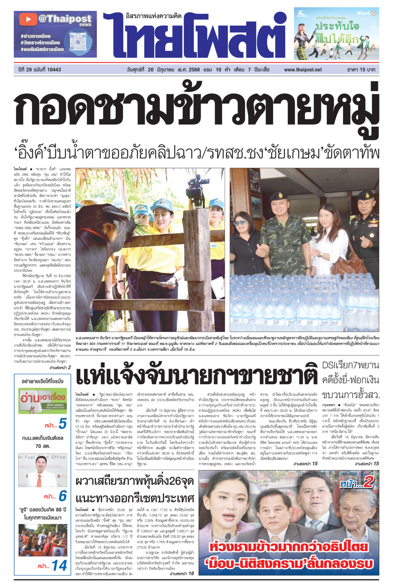 หนังสือพิมพ์ ฉบับวันที่ 20 มิถุนายน 2568ข่าวหน้าหนึ่งกอดชามข้าวตายหมู่ ‘อิ๊งค์’บีบน้ำตาขออภัยคลิปฉาว/รทสช.ชง‘ชัยเกษม’ขัดตาทัพ“นายกฯ อิ๊งค์” แถลงขออภัย ปชช. คลิปคุย “ฮุน เซน” ทำให้ไม่สบายใจ แห่แจ้งจับนายกฯขายชาติรัฐบาลผวาม็อบไล่นายกฯ สั่งปิดถนนรอบทำเนียบฯ “คปท.” จัดหนัก “แพทองธาร” DSIเรียก7พยาน คดีอั้งยี่-ฟอกเงิน ขบวนการฮั้วสว.“ดีเอสไอ” ร่อนหมายเรียกพยานคดีอั้งยี่-ฟอกเงิน ปมฮั้ว สว.67 ล็อตแรก 7 ราย ผวาเสถียรภาพหุ้นดิ่ง26จุด แนะทางออกรีเซตประเทศหุ้นร่วงหนัก 25.85 จุด ผวาเสถียรภาพรัฐบาล-ม็อบไล่นายกฯ ภาคเอกชนยอมรับคลิป “อิ๊งค์” คุย “ฮุน เซน” กระทบเชื่อมั่น