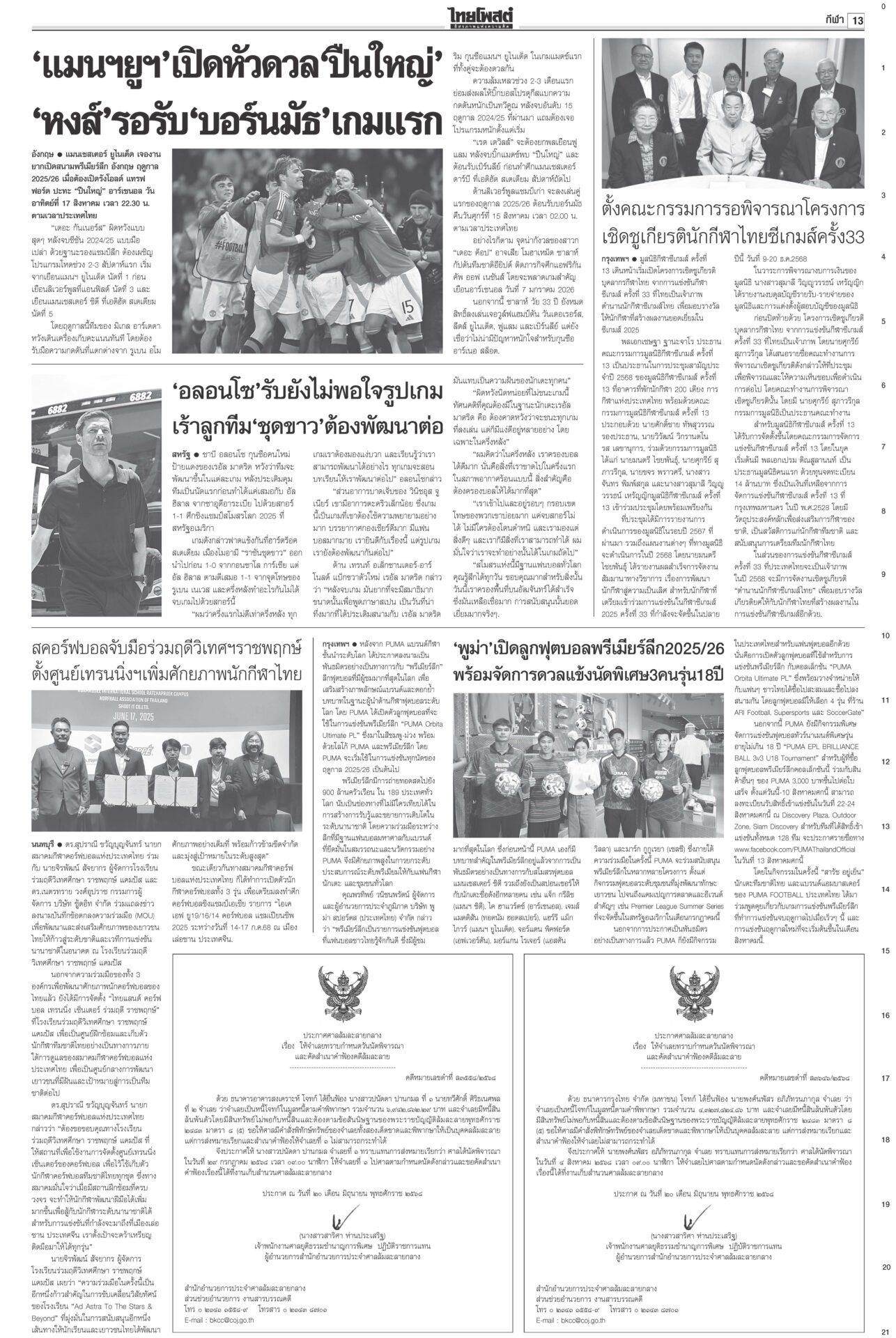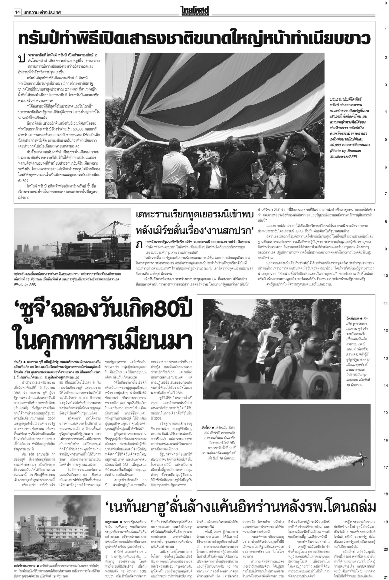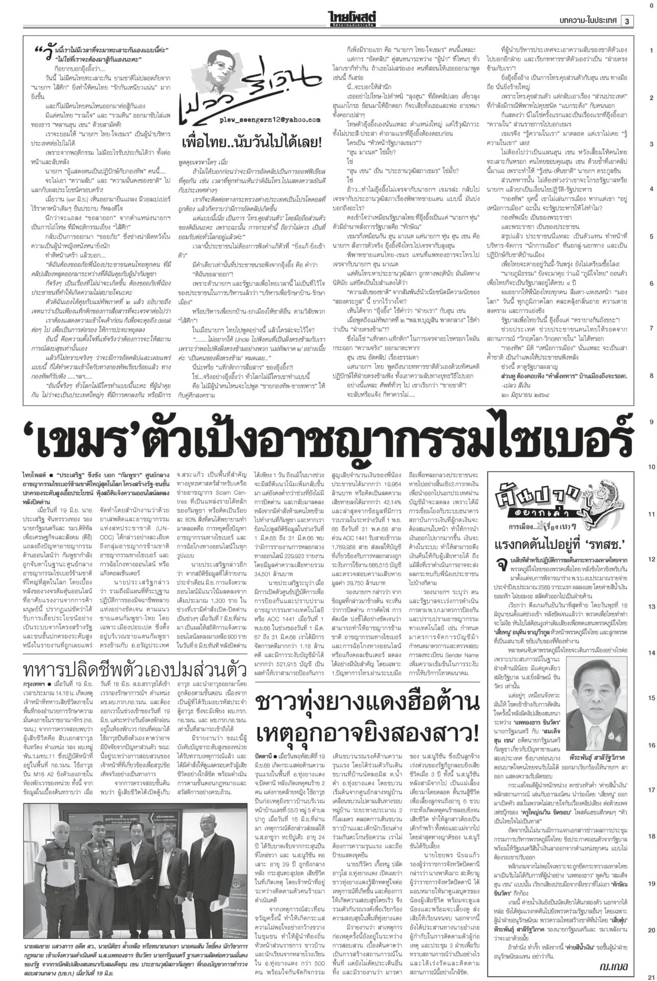 หนังสือพิมพ์ ฉบับวันที่ 20 มิถุนายน 2568ข่าวหน้าหนึ่งกอดชามข้าวตายหมู่ ‘อิ๊งค์’บีบน้ำตาขออภัยคลิปฉาว/รทสช.ชง‘ชัยเกษม’ขัดตาทัพ“นายกฯ อิ๊งค์” แถลงขออภัย ปชช. คลิปคุย “ฮุน เซน” ทำให้ไม่สบายใจ แห่แจ้งจับนายกฯขายชาติรัฐบาลผวาม็อบไล่นายกฯ สั่งปิดถนนรอบทำเนียบฯ “คปท.” จัดหนัก “แพทองธาร” DSIเรียก7พยาน คดีอั้งยี่-ฟอกเงิน ขบวนการฮั้วสว.“ดีเอสไอ” ร่อนหมายเรียกพยานคดีอั้งยี่-ฟอกเงิน ปมฮั้ว สว.67 ล็อตแรก 7 ราย ผวาเสถียรภาพหุ้นดิ่ง26จุด แนะทางออกรีเซตประเทศหุ้นร่วงหนัก 25.85 จุด ผวาเสถียรภาพรัฐบาล-ม็อบไล่นายกฯ ภาคเอกชนยอมรับคลิป “อิ๊งค์” คุย “ฮุน เซน” กระทบเชื่อมั่น