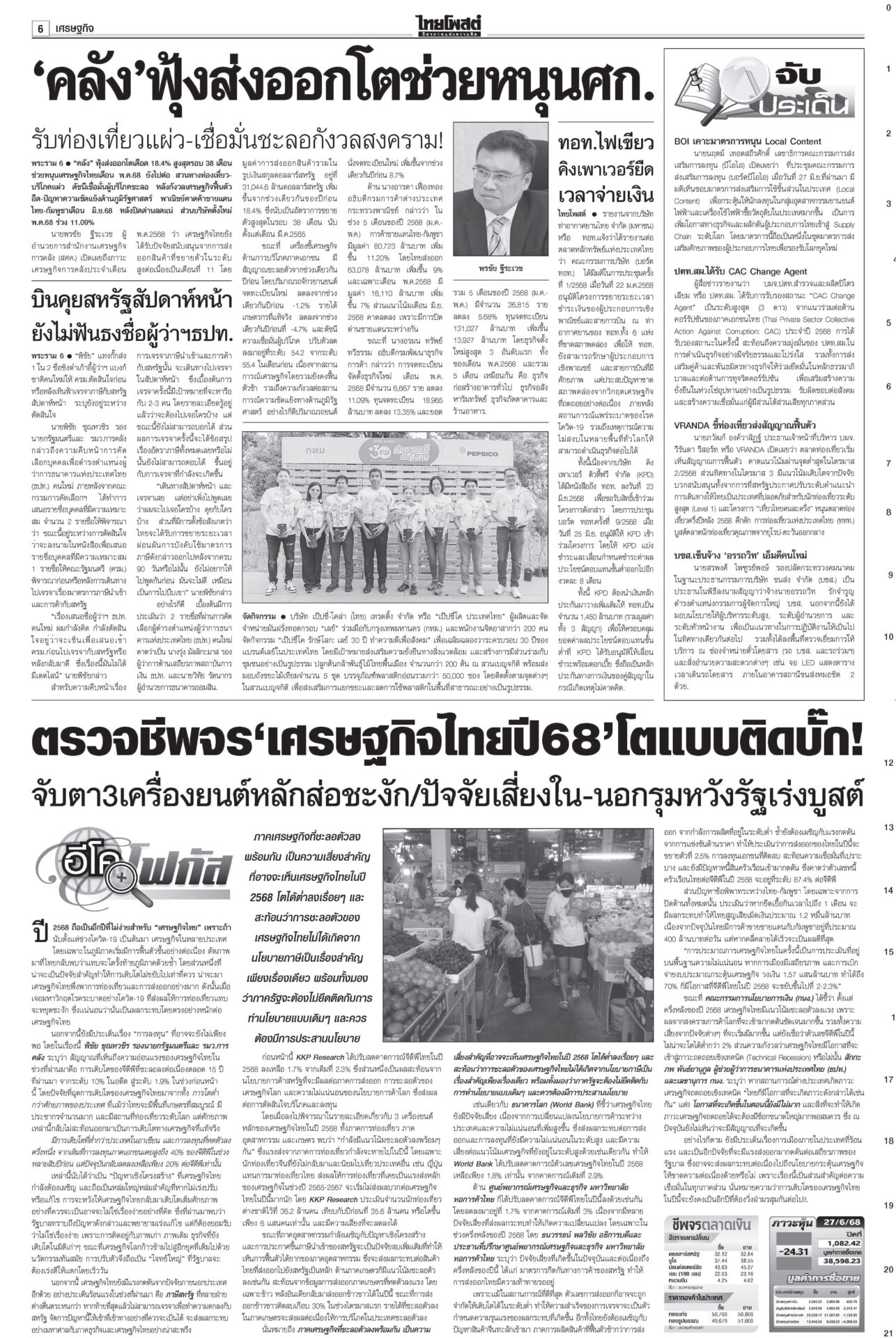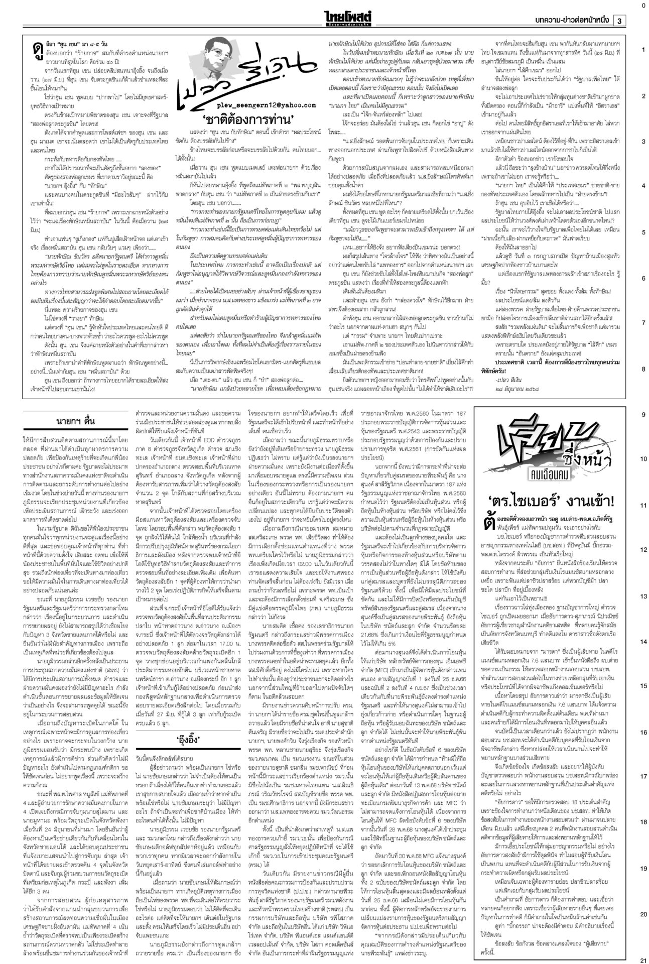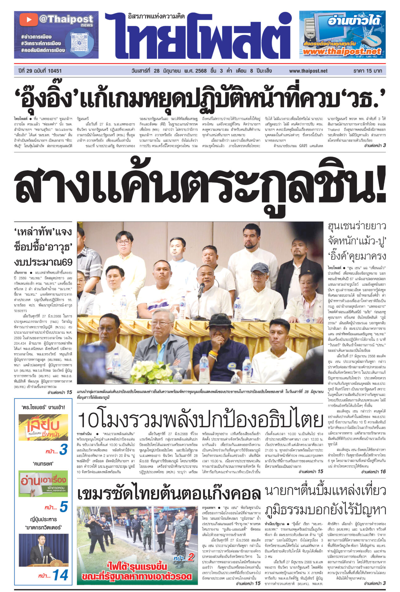 หนังสือพิมพ์ ฉบับวันที่ 28 มิถุนายน 2568ข่าวหน้าหนึ่งสางแค้นตระกูลชิน! ฮุนเซนร่ายยาว จัดหนัก‘แม้ว-ปู’ ‘อิ๊งค์’คุยมาครง“ฮุน เซน” แฉ “เพื่อนแม้ว” ป่วยทิพย์ เพื่อหลบเลี่ยงข้อกฎหมาย ‘อุ๊งอิ๊ง’แก้เกมหยุดปฏิบัติหน้าที่ควบ‘วธ.’หึ่ง “แพทองธาร” ทูลเกล้าฯ ถวายโผ ครม.แล้ว “พ่อมดดำ” นั่ง รมต.สำนักนายกฯ เขมรซัดไทยต้นตอแก๊งคอล“ฮุน เซน” พ้อกัมพูชาเป็นเหยื่อของการฉ้อโกงออนไลน์ที่ผ่านมาทางไทย วอนอย่าโยนผิดเขมร “ภูมิธรรม” นายกฯตื่นบึ้มแหล่งเที่ยว ภูมิธรรมบอกยังไร้ปัญหา“อุ๊งอิ๊ง” เรียก “ผบ.ตร.-ผบช.ทท.” รายงานเหตุเตรียมป่วนบึ้มภูเก็ต-พังงา 10โมงรวมพลังปกป้องอธิปไตย“คณะรวมพลังแผ่นดิน” พร้อมชุมนุมใหญ่สำแดงพลังปกป้องแผ่นดิน ‘เหล่าทัพ’แจง ช็อปชื้อ‘อาวุธ’ งบประมาณ69ผบ.เหล่าทัพตบเท้าชี้แจงงบปี 2569 “ผบ.ทอ.” ยึดสมุดปกขาว เผยกริพเพนจ่อเข้า ครม.