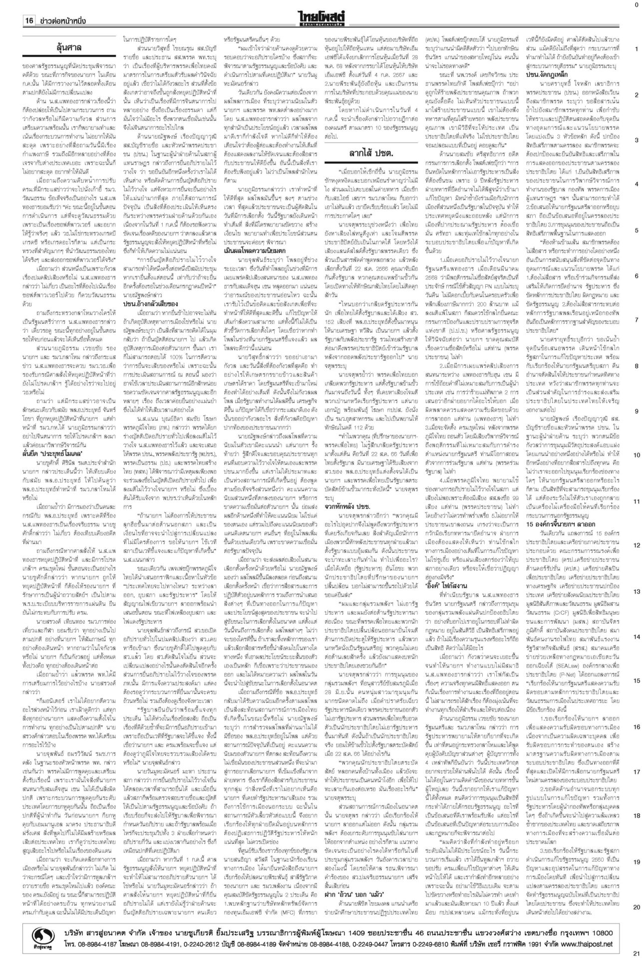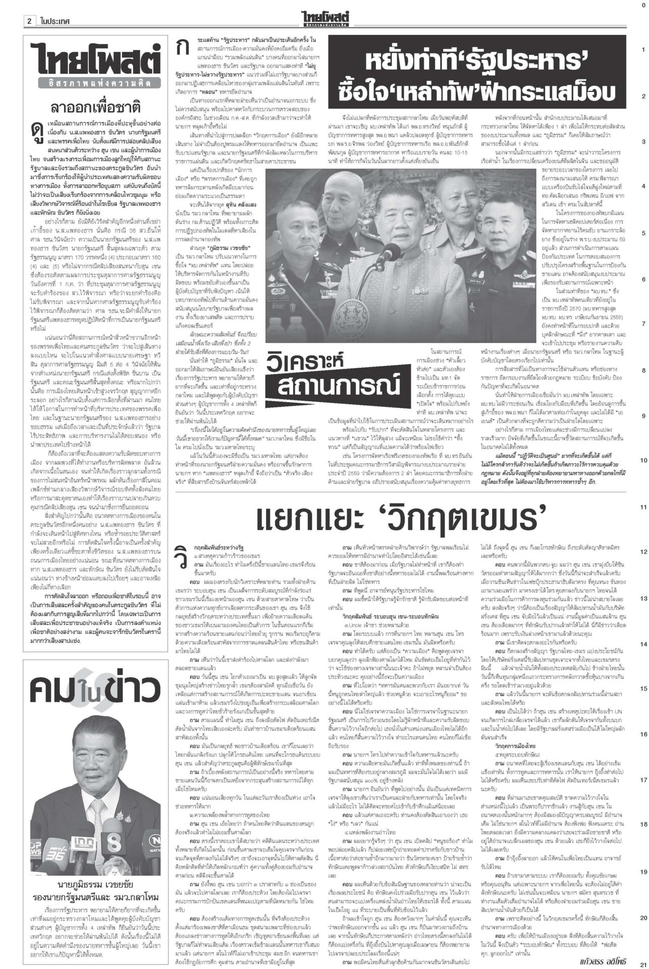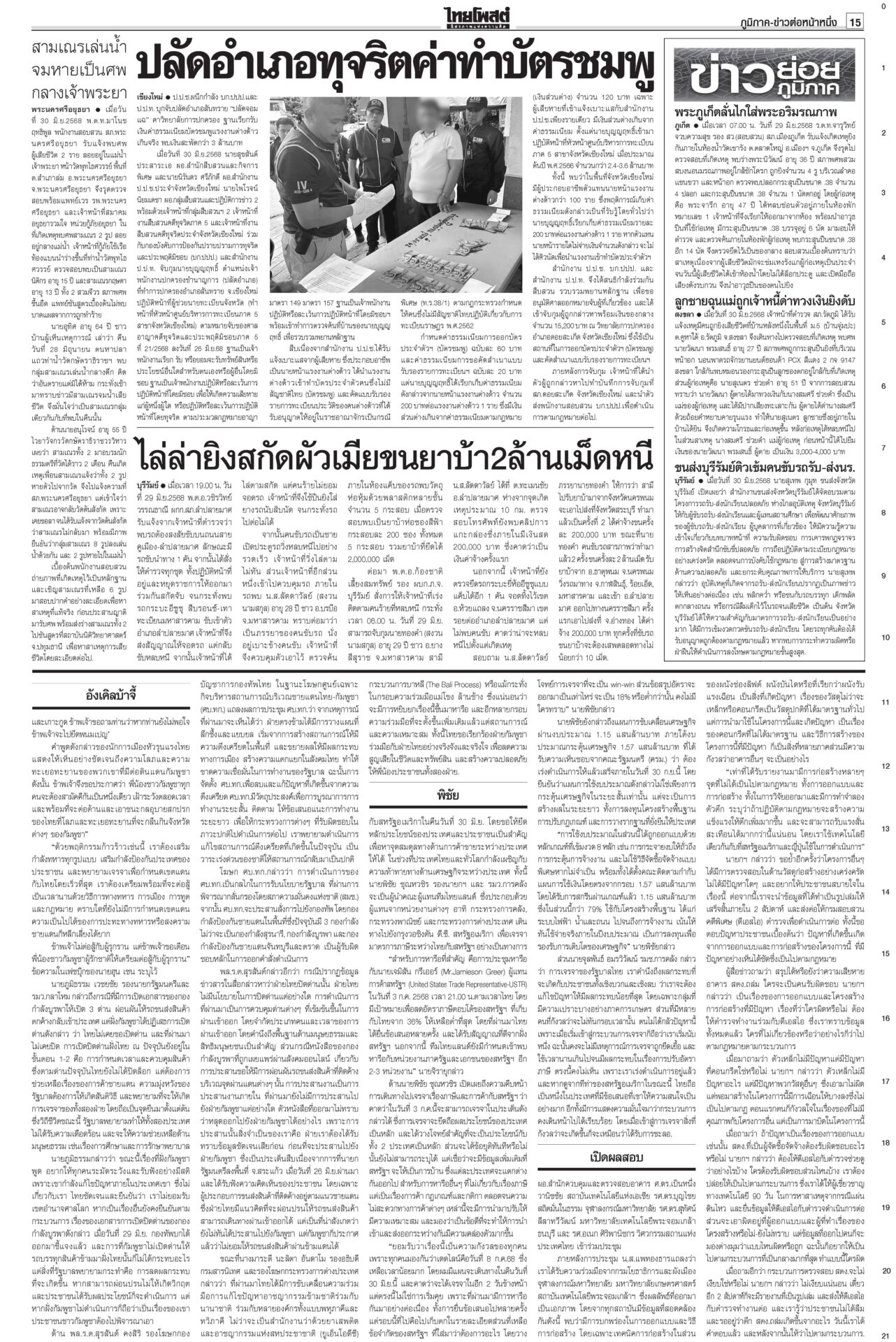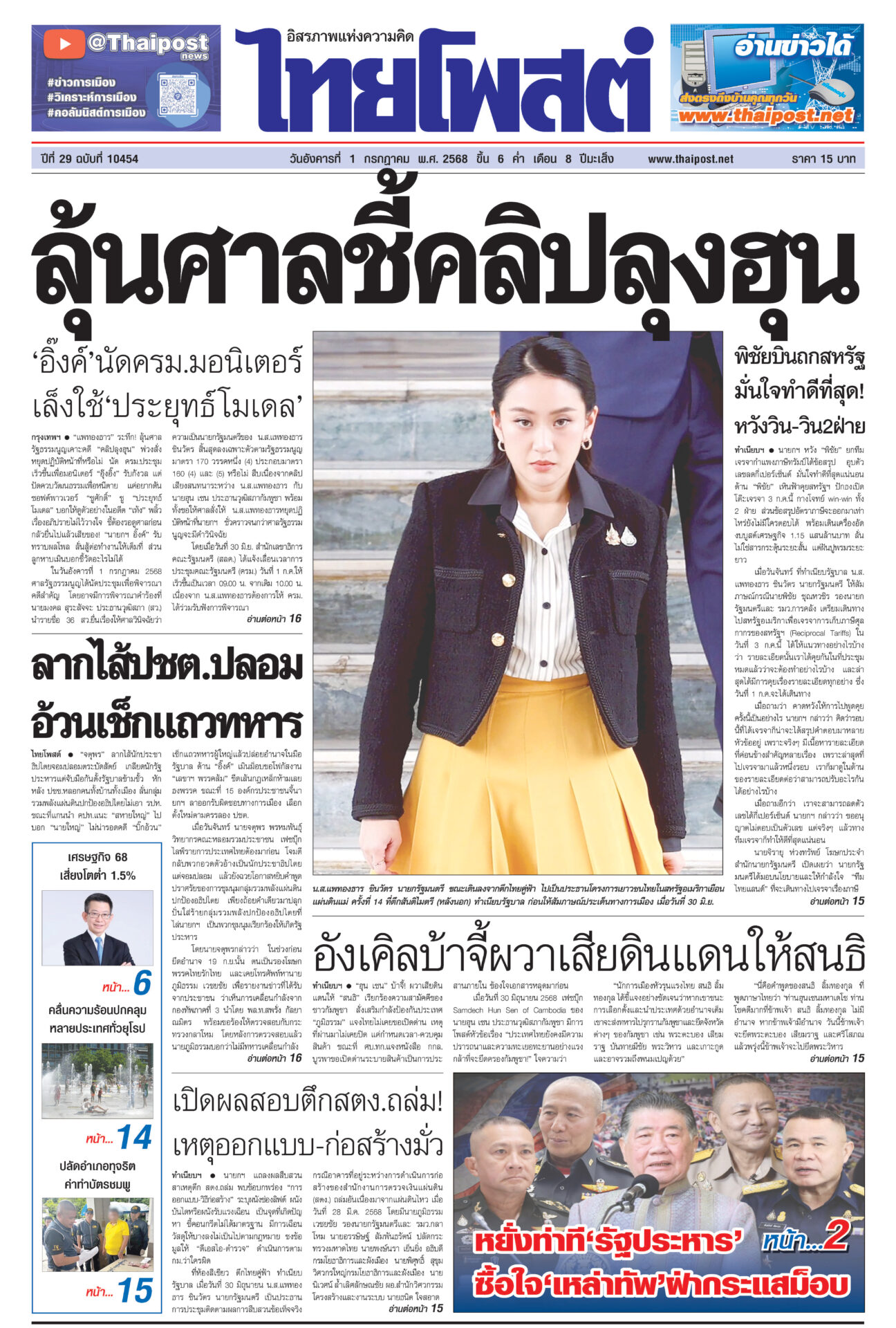 หนังสือพิมพ์ ฉบับวันที่ 1 กรกฎาคม 2568ข่าวหน้าหนึ่งลุ้นศาลชี้คลิปลุงฮุน ‘อิ๊งค์’นัดครม.มอนิเตอร์ เล็งใช้‘ประยุทธ์โมเดล’“แพทองธาร” ระทึก! ลุ้นศาลรัฐธรรมนูญเคาะคดี “คลิปลุงฮุน” พ่วงสั่งหยุดปฏิบัติหน้าที่หรือไม่ ลากไส้ปชต.ปลอม อ้วนเช็กแถวทหาร“จตุพร” ลากไส้นักประชาธิปไตยจอมปลอมตระบัดสัตย์ เกลียดนักรัฐประหารแต่จับมือกันตั้งรัฐบาลข้ามขั้ว อังเคิลบ้าจี้ผวาเสียดินแดนให้สนธิ“ฮุน เซน” บ้าจี้! ผวาเสียดินแดนให้ “สนธิ” เรียกร้องความสามัคคีของชาวกัมพูชา พิชัยบินถกสหรัฐ มั่นใจทำดีที่สุด! หวังวิน-วิน2ฝ่ายนายกฯ หวัง “พิชัย” ยกทีมเจรจากำแพงภาษีทรัมป์ได้ข้อสรุป เปิดผลสอบตึกสตง.ถล่ม! เหตุออกแบบ-ก่อสร้างมั่วนายกฯ แถลงผลสืบสวนสาเหตุตึก สตง.ถล่ม พบข้อบกพร่อง “การออกแบบ-วิธีก่อสร้าง”